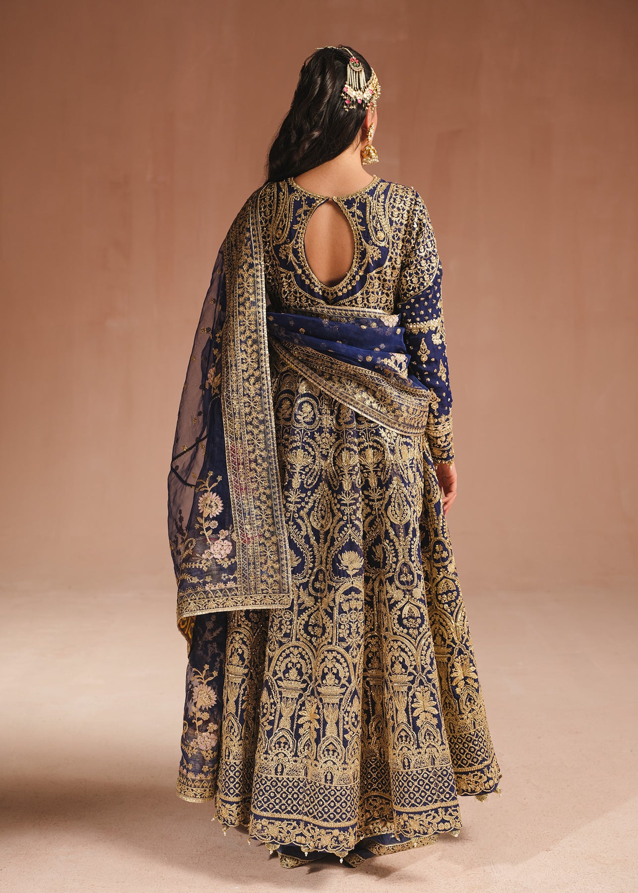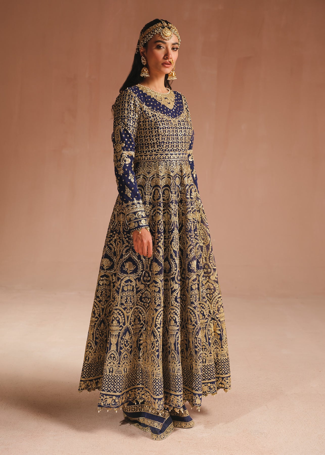 An exquisite navy blue pishwas is adorned with opulent gold embroidery, intricate tilla, and dazzling sequins. The jewel neckline and embroidered border adds a touch of regal elegance. Complementing the ensemble is a trouser and a stunning organza dupatta featuring a beautifully embroidered border on all sides and baby pink florals blooming all over.