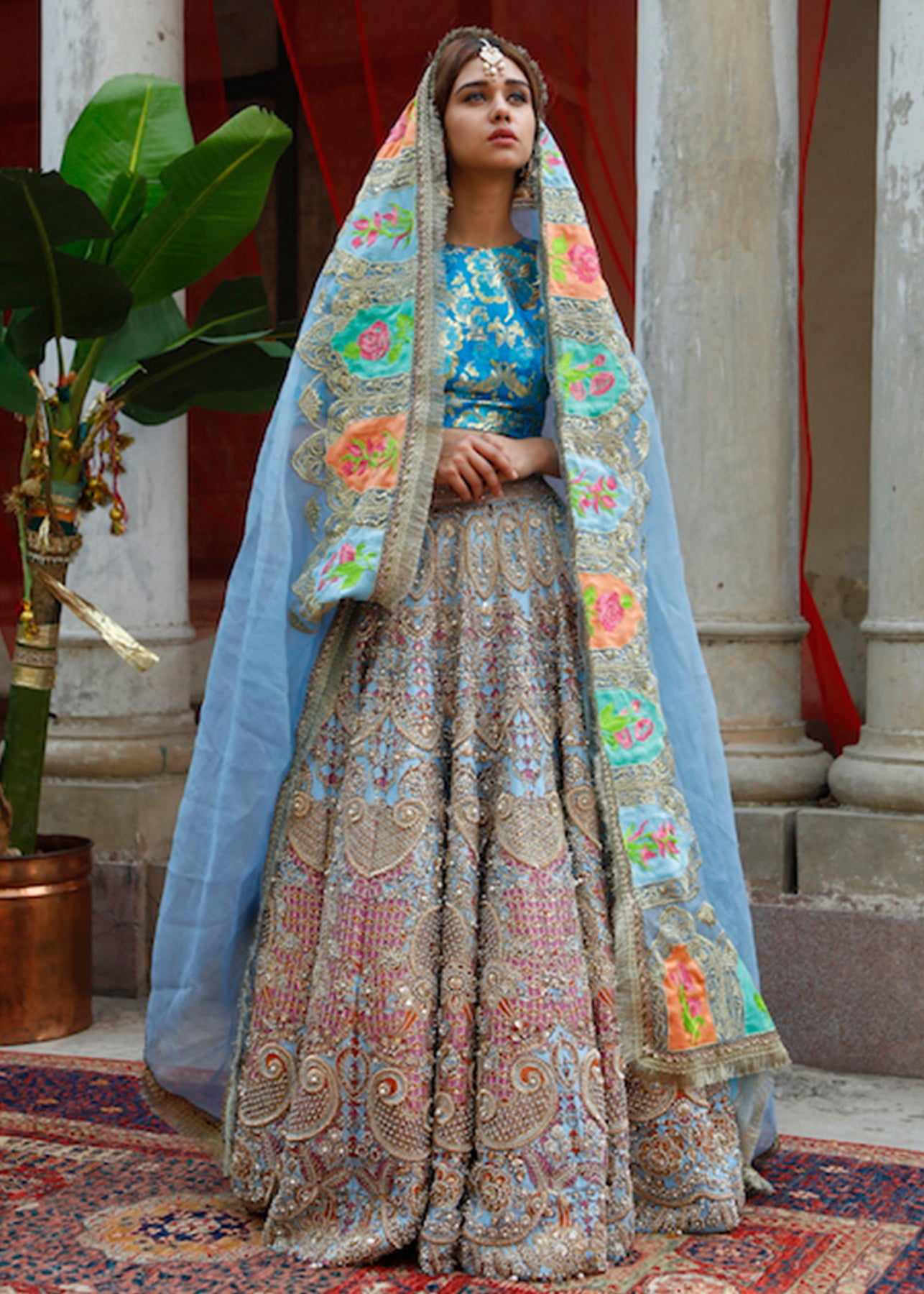 Blue Raw Silk Lehnga silk lehenga, jamawaar choli with French organza dupatta is highlighted with silver Naqshi embellishments and pearl finishing. Minimal adornments on the blouse with delicacy keeps it classy. Aqua Tulle Dupatta with Pink and aqua border glided with gold embroidery makes it a perfect Shendi attire.