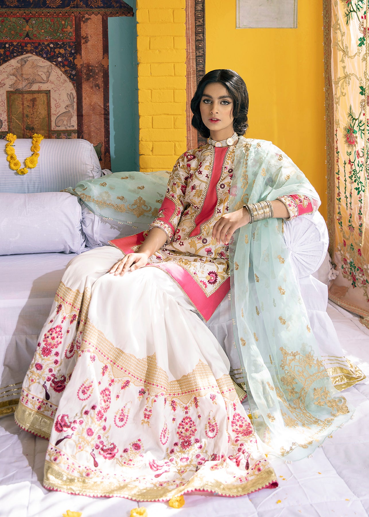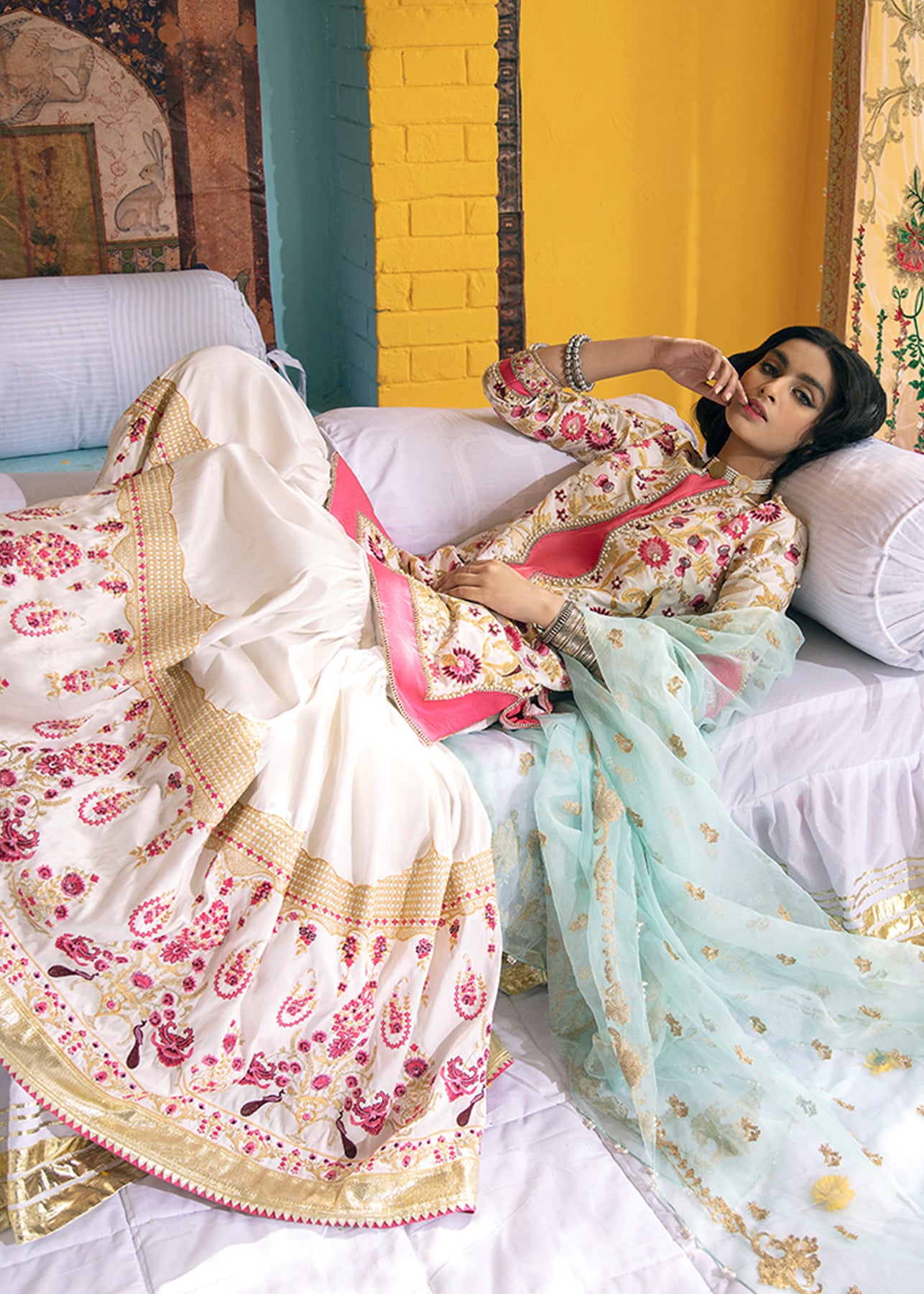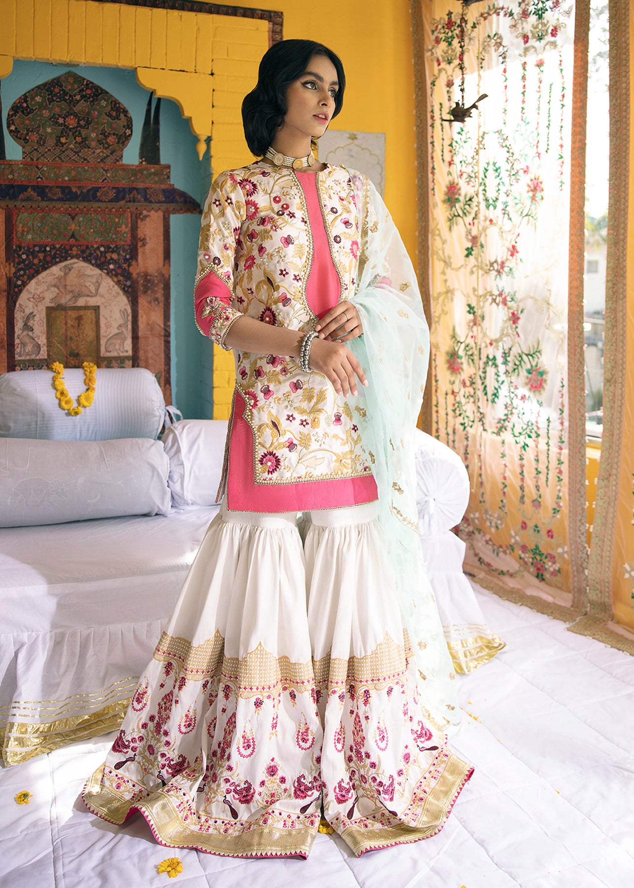 A cotton net short shirt with floral embroidery in spellbinding pinks hues has pearl and naqshi detailing. It is paired up with an embroidered cotton silk ghrara with lappa edging and pastel blue organza dupatta rendered with beautiful aari work.