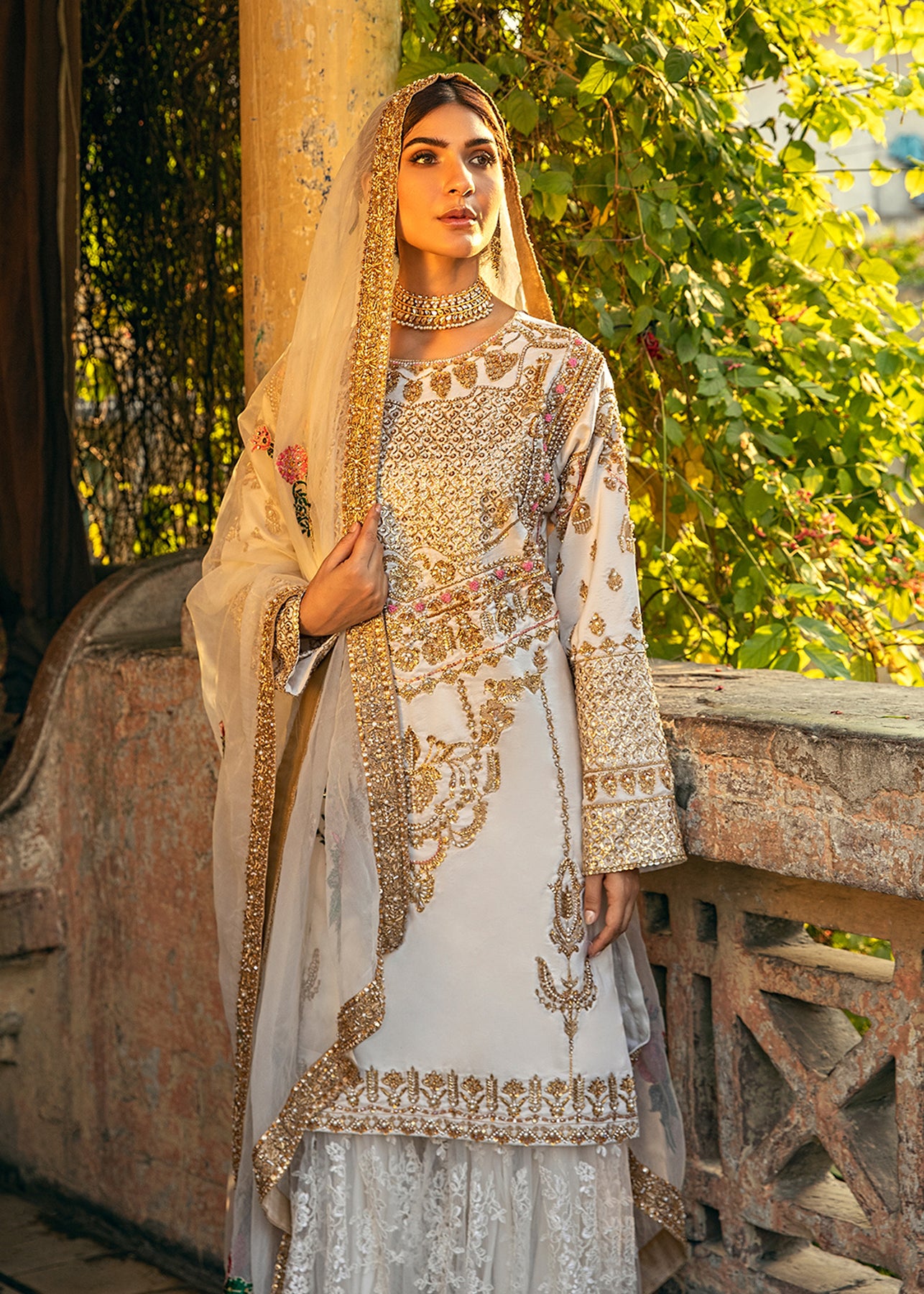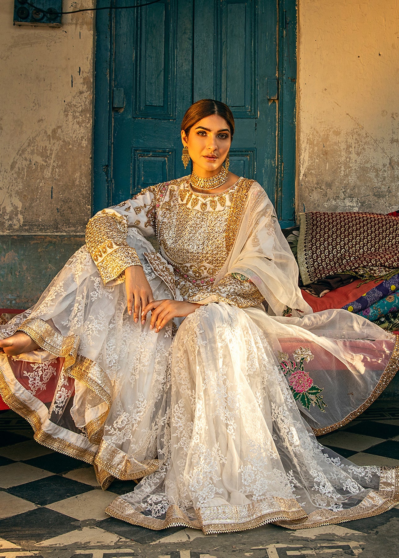 A pearl white raw silk short shirt and net embroided garara paired up with a pink aari dupatta.