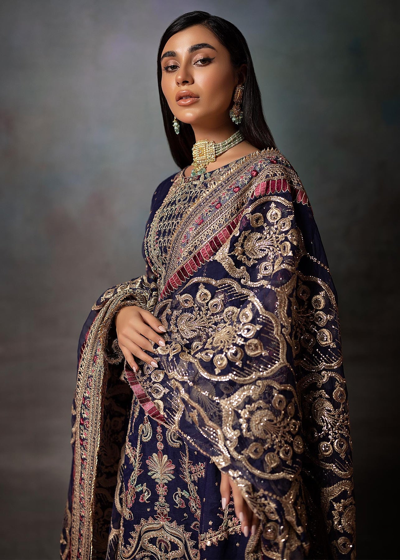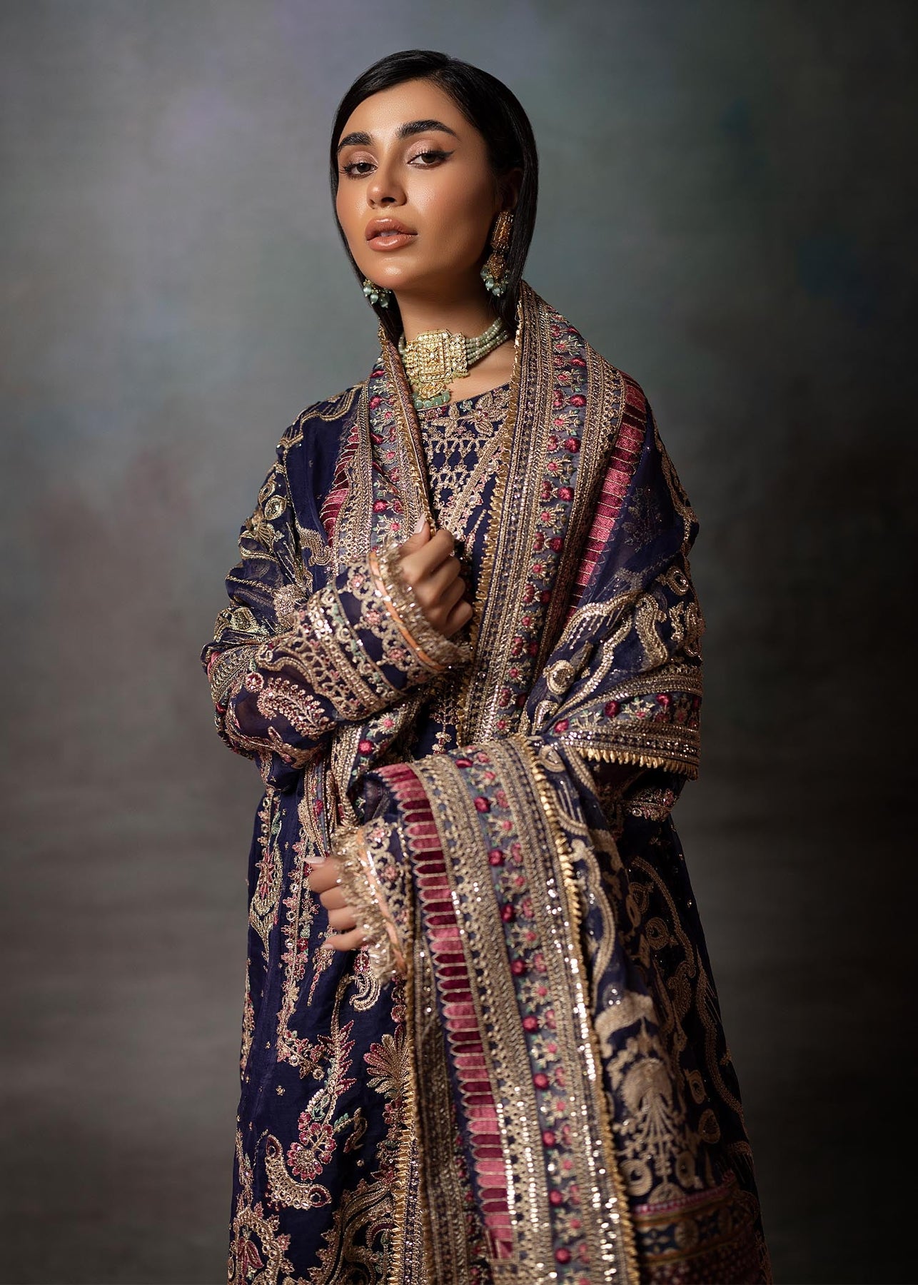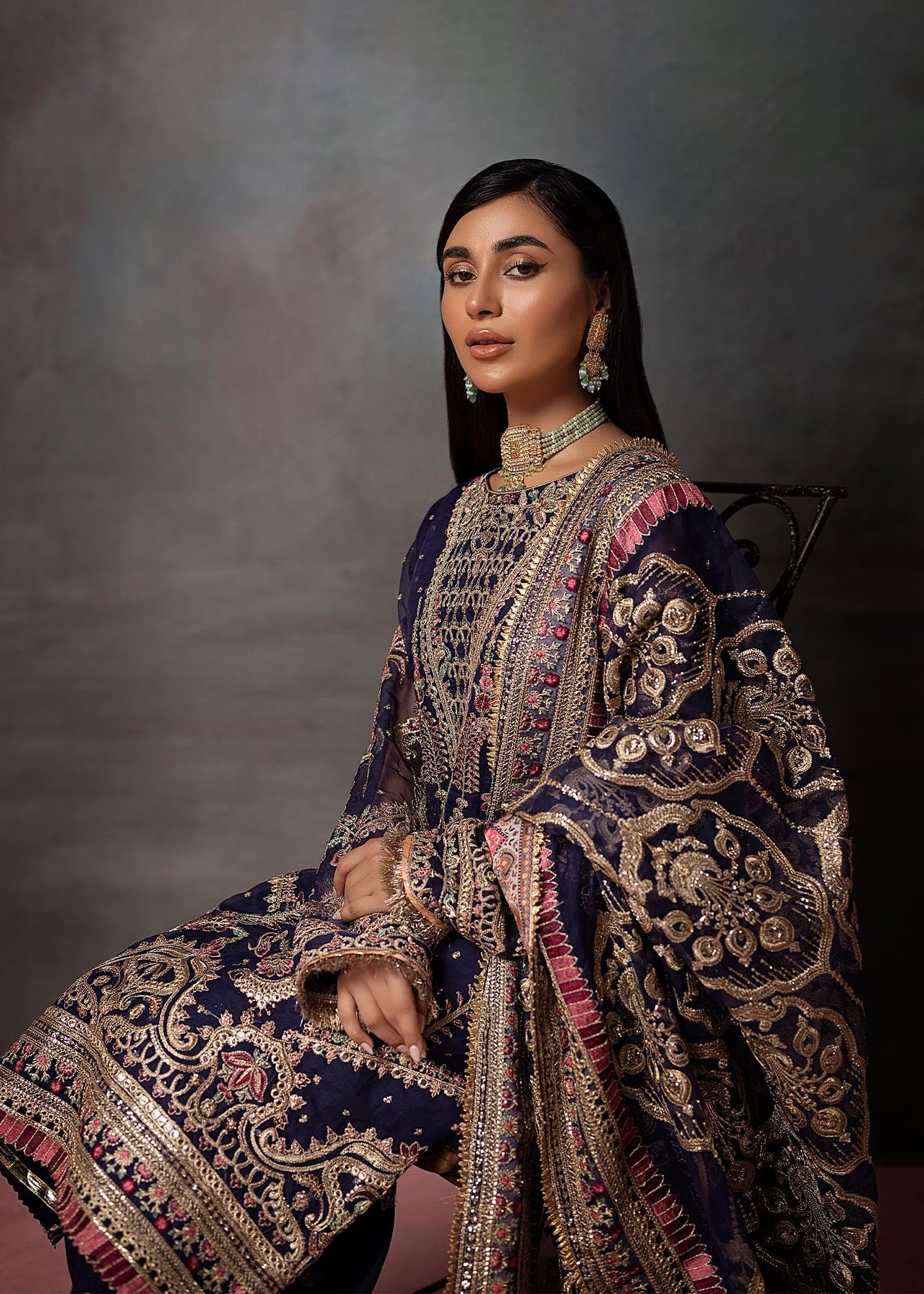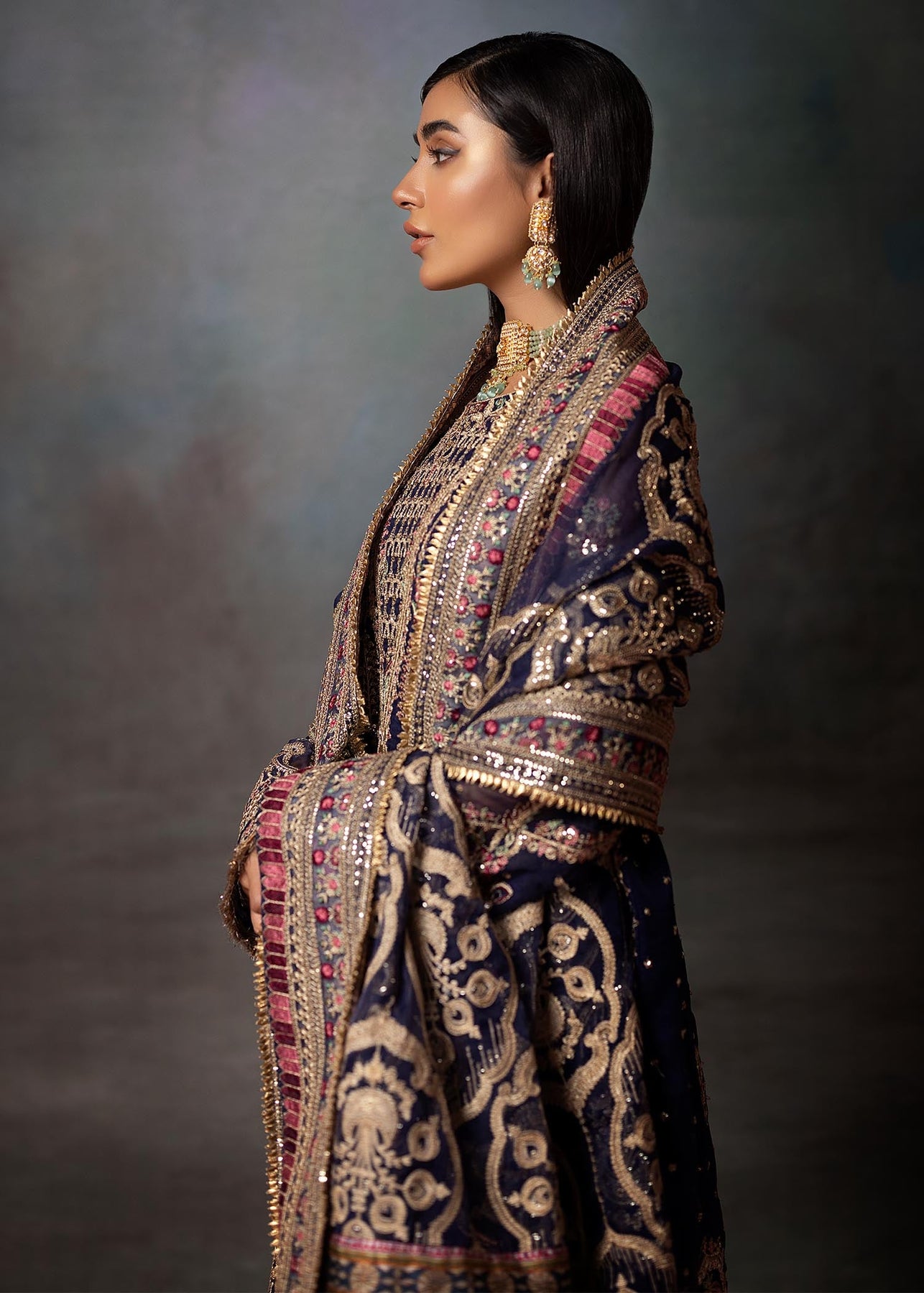 Description: A navy blue, organza shirt is intricately adorned with fine gold sequins work and tilla. It is paired up with a shalwar with lovely motifs and borders along with a stunning organza dupatta.
