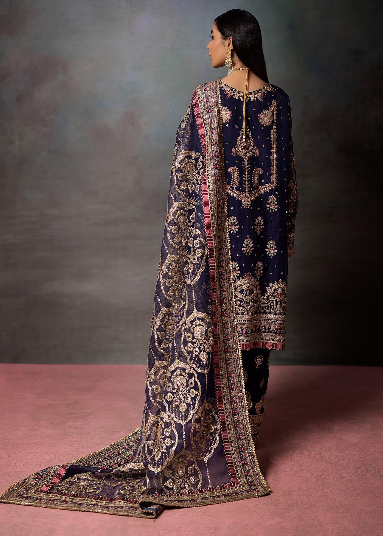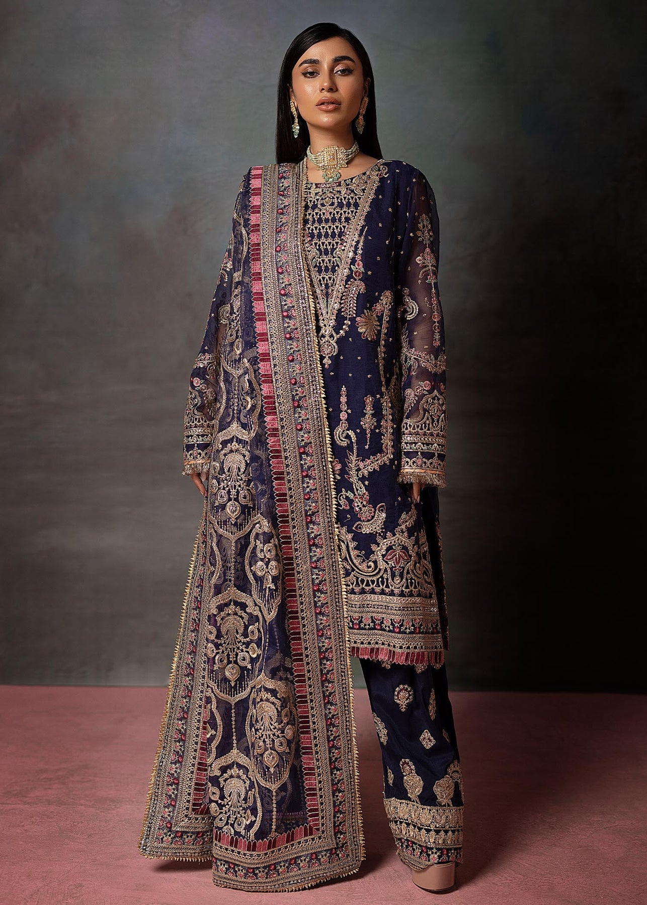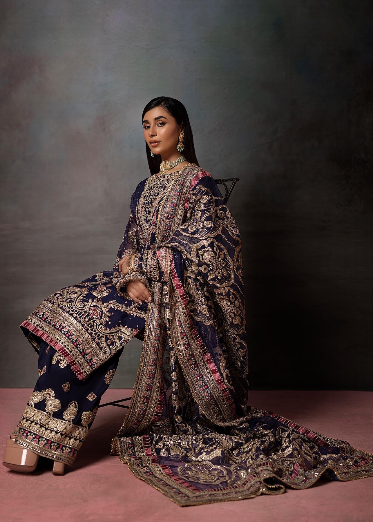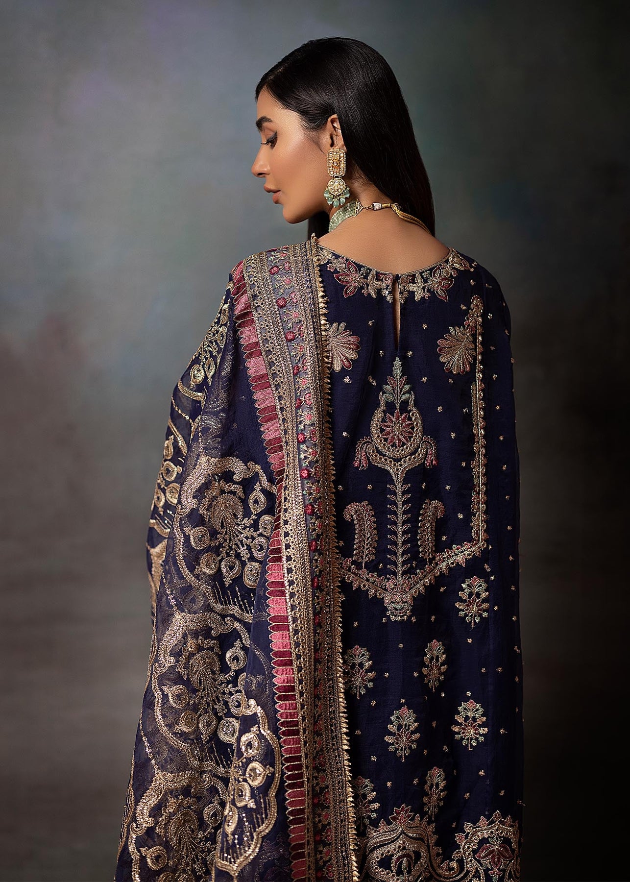 Description: A navy blue, organza shirt is intricately adorned with fine gold sequins work and tilla. It is paired up with a shalwar with lovely motifs and borders along with a stunning organza dupatta.