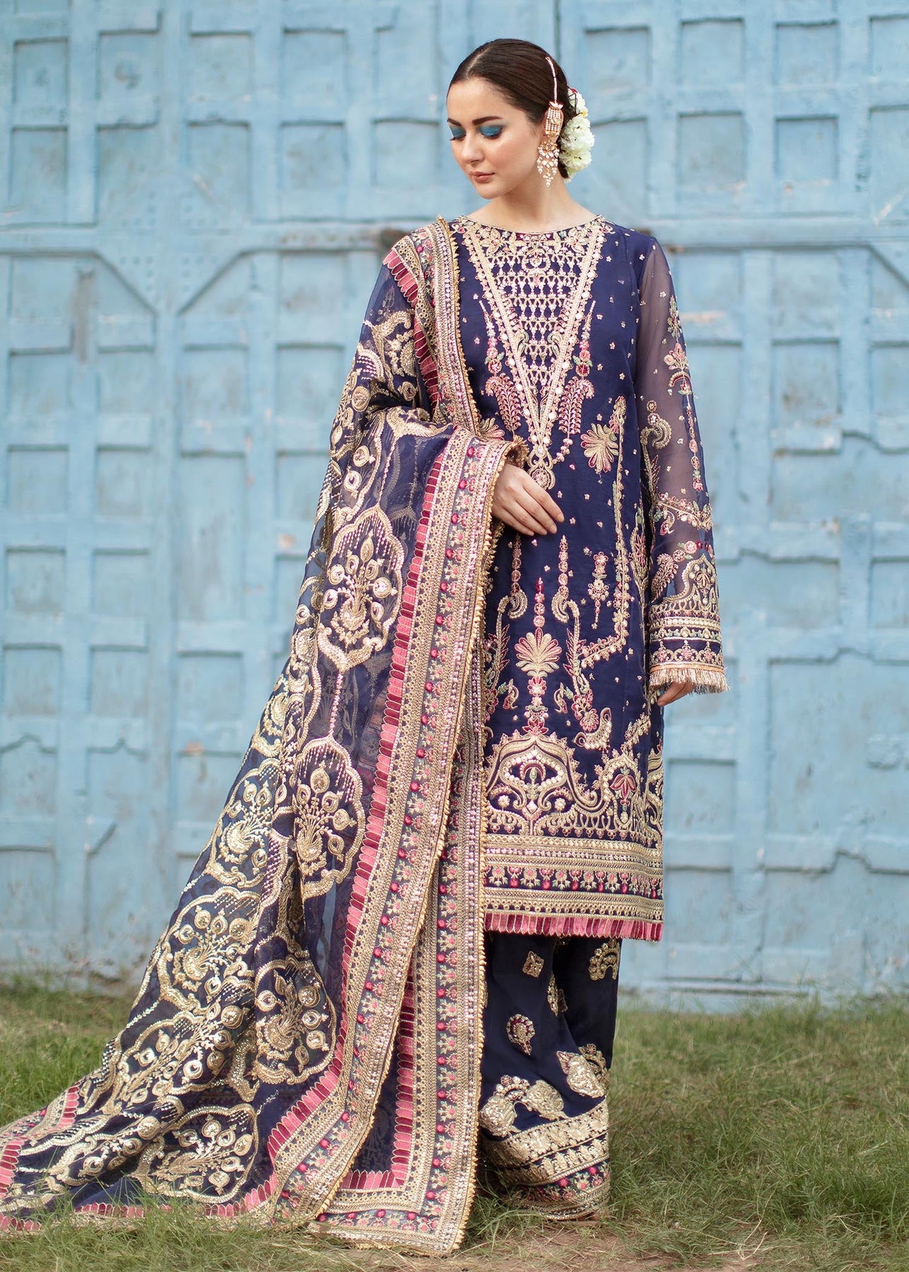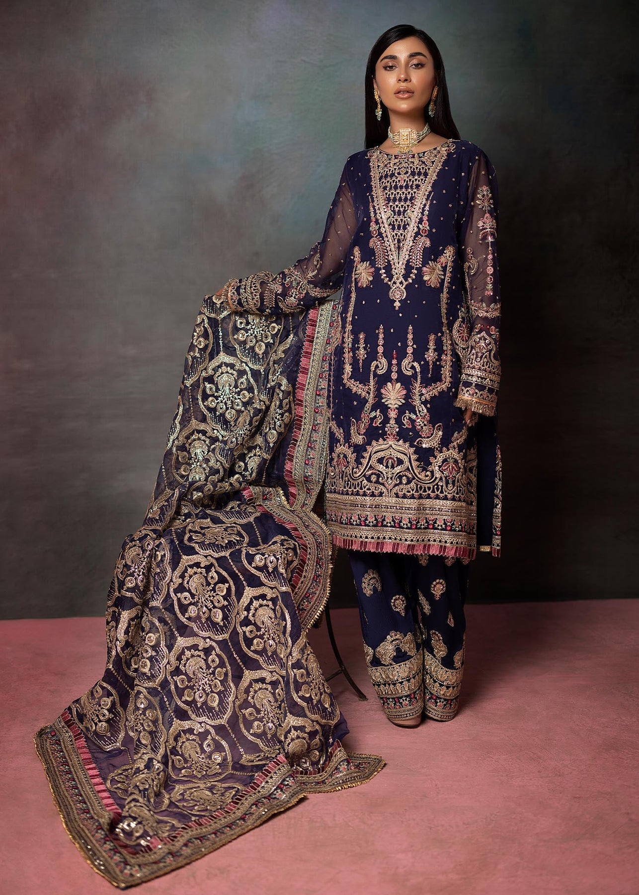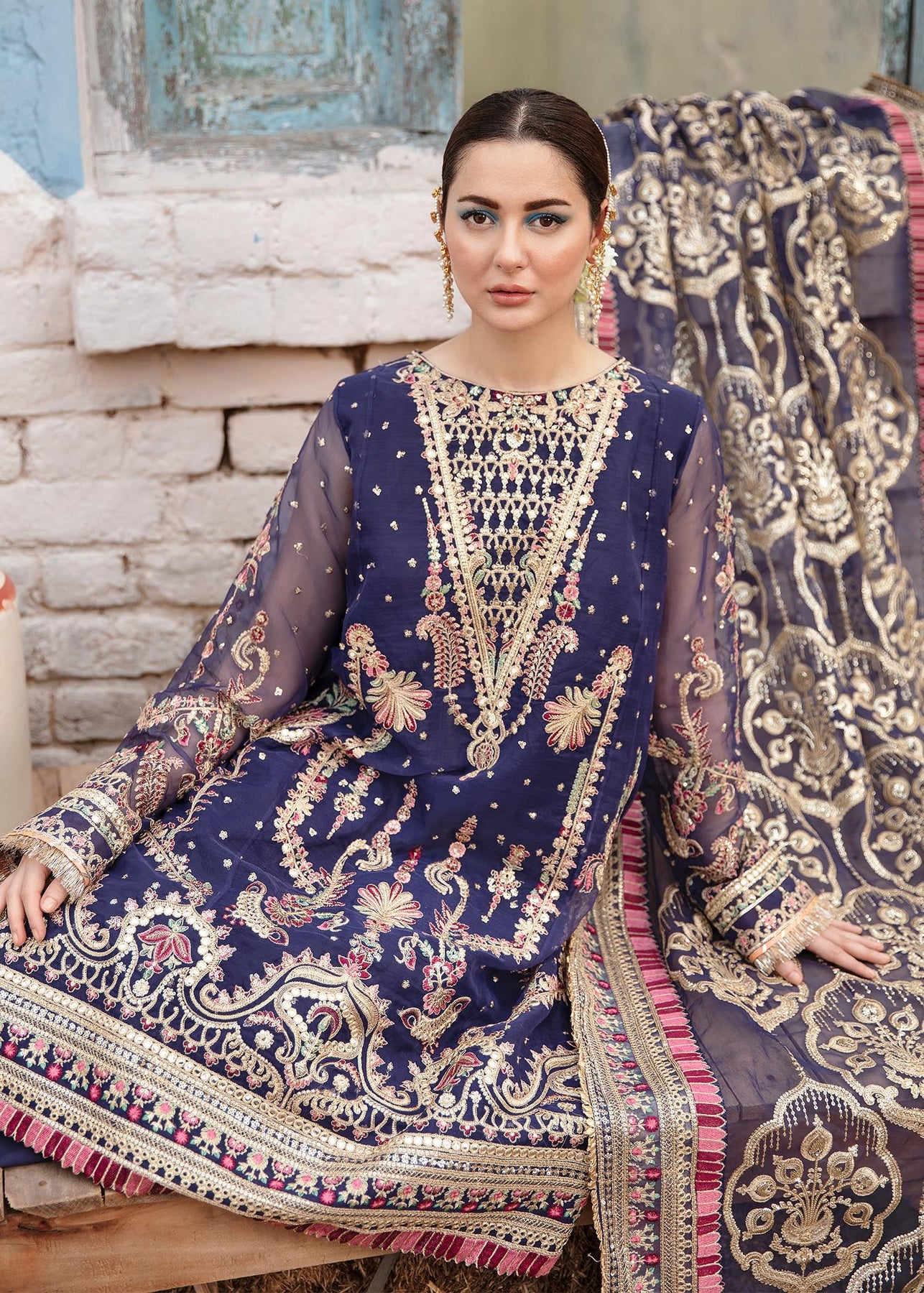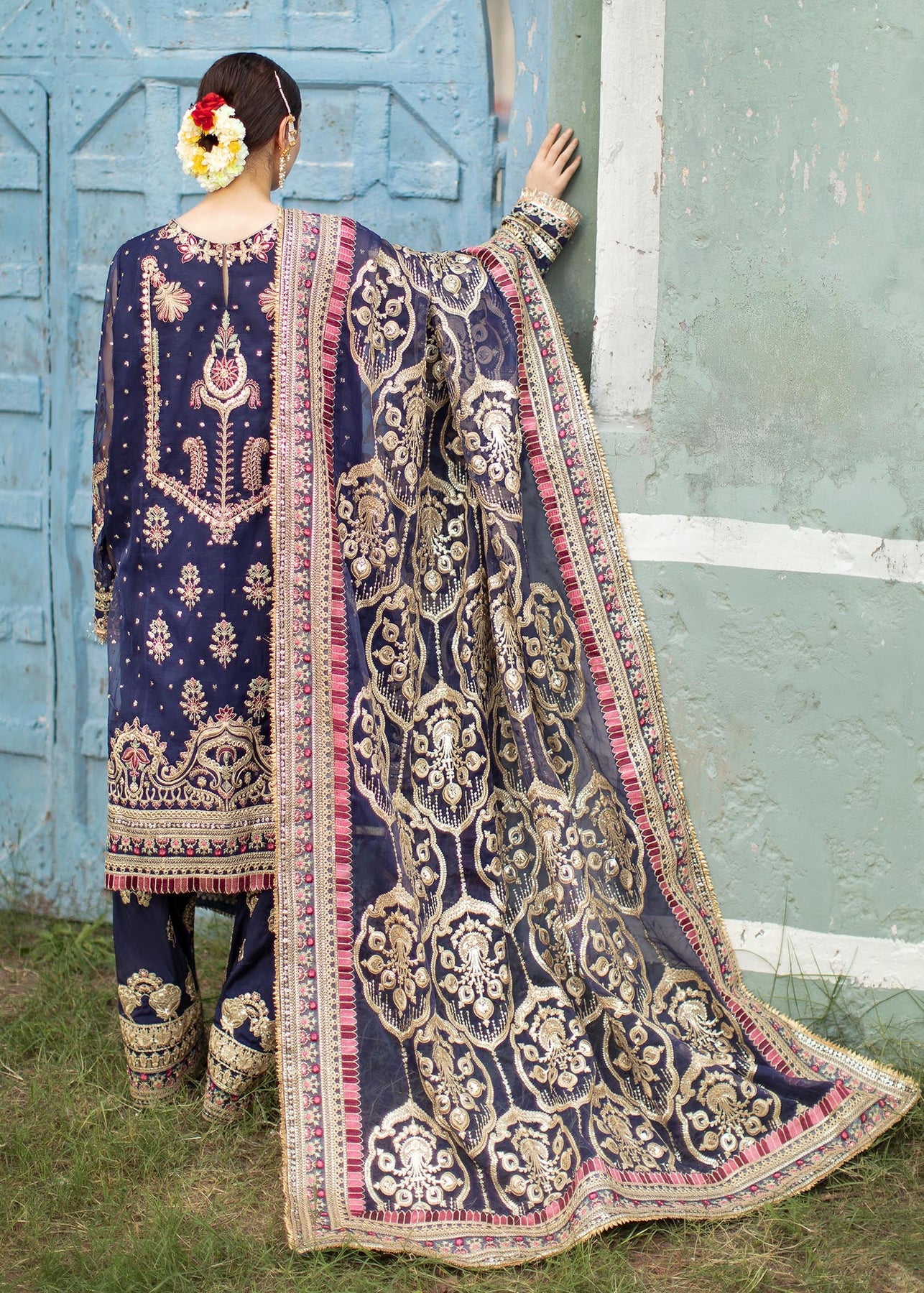 Description: A navy blue, organza shirt is intricately adorned with fine gold sequins work and tilla. It is paired up with a shalwar with lovely motifs and borders along with a stunning organza dupatta.