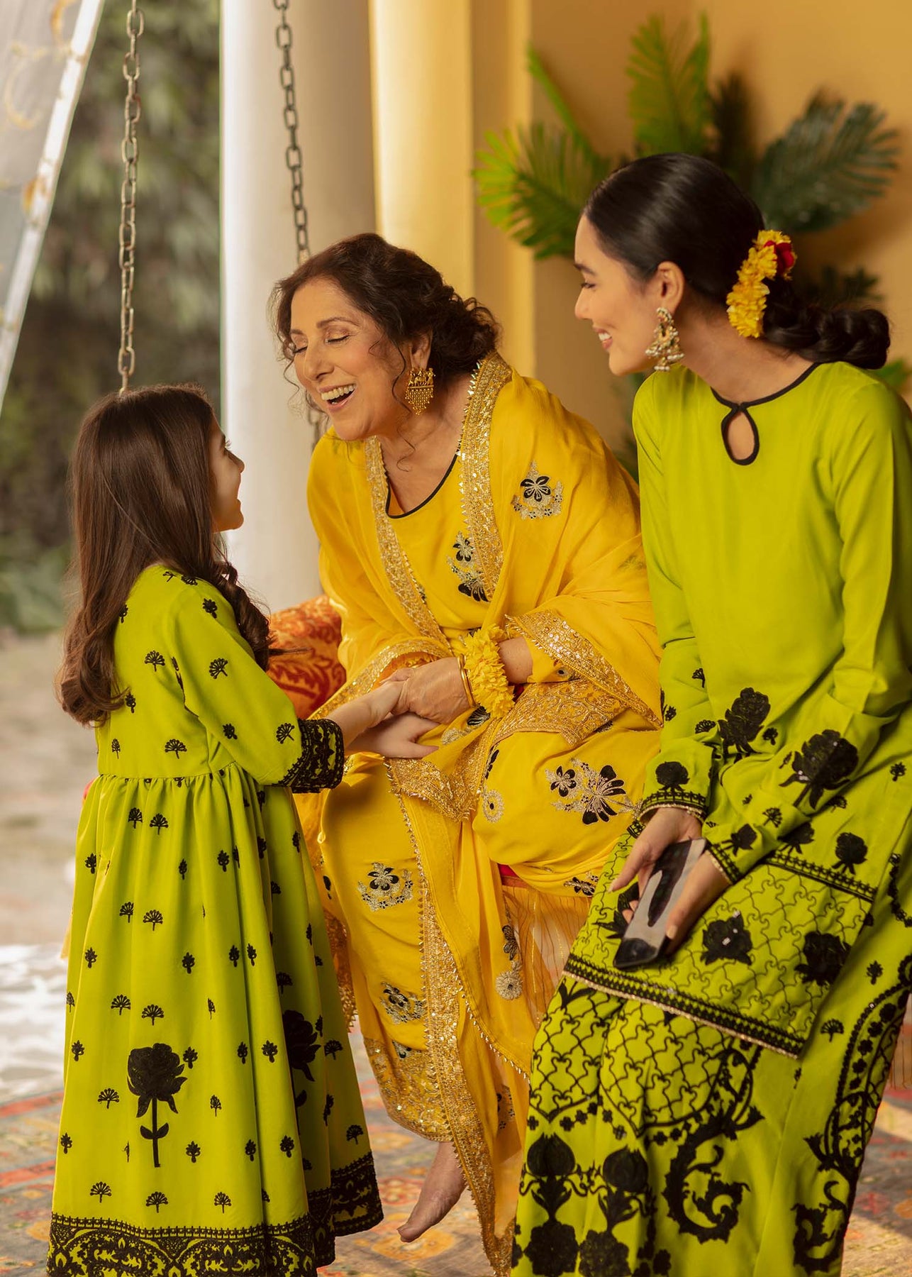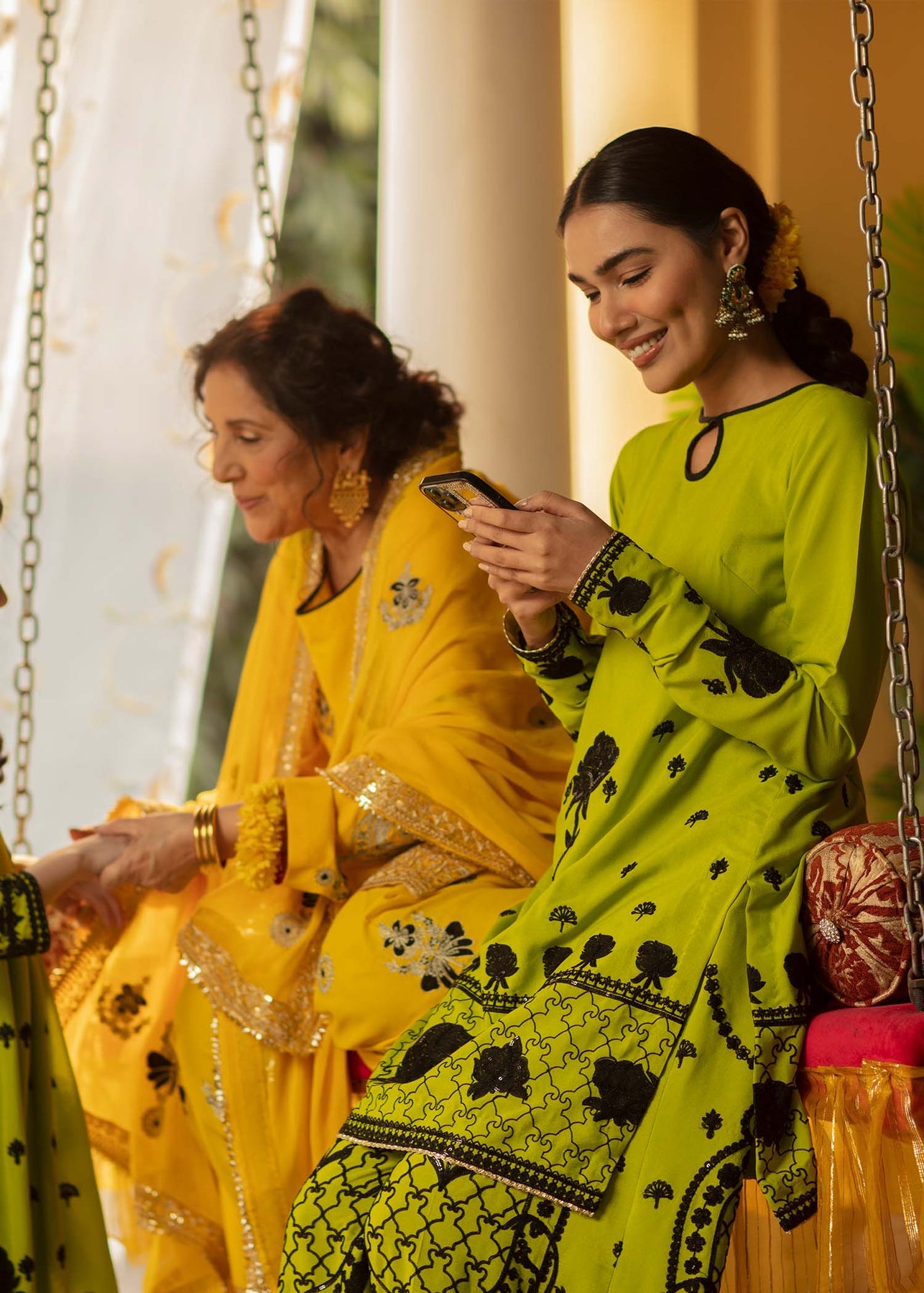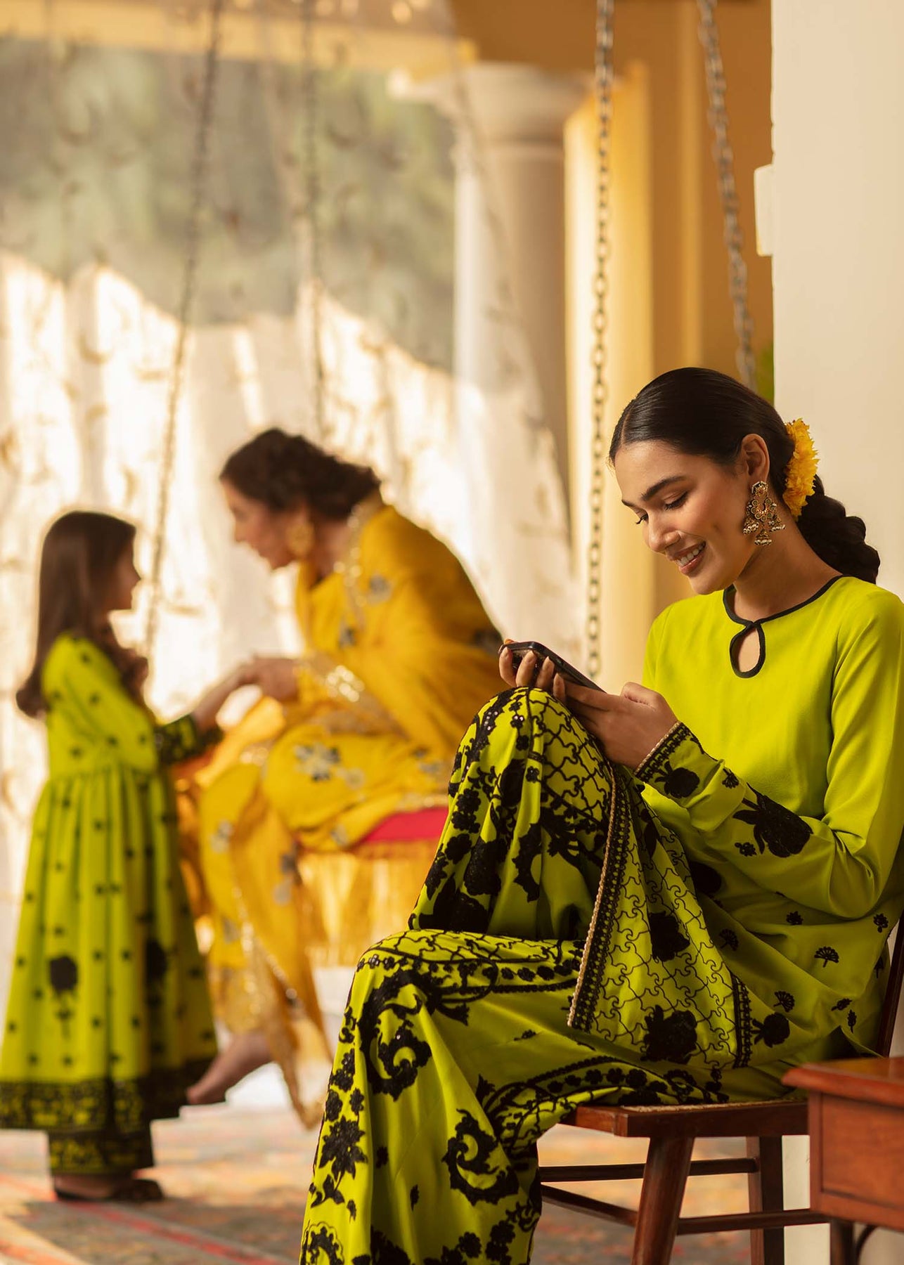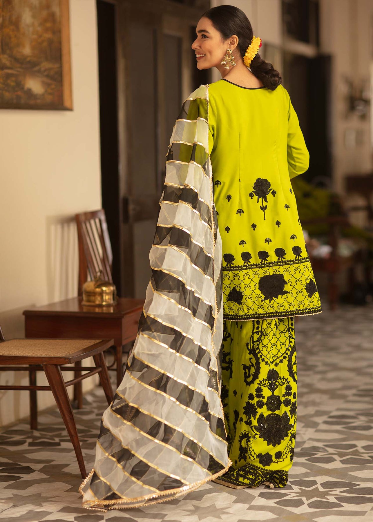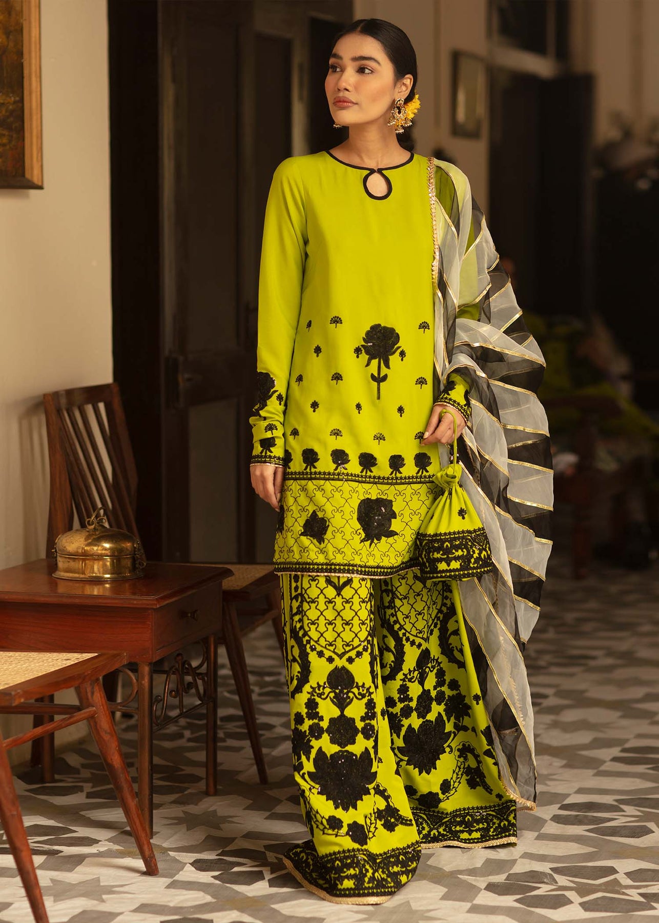 Description: An acid green shirt and culottes have stunning black aari embroidery and sequins work on it. It is paired up with a hand-rendered black and white striped dupatta in organza which is enhanced with gota and kinari.