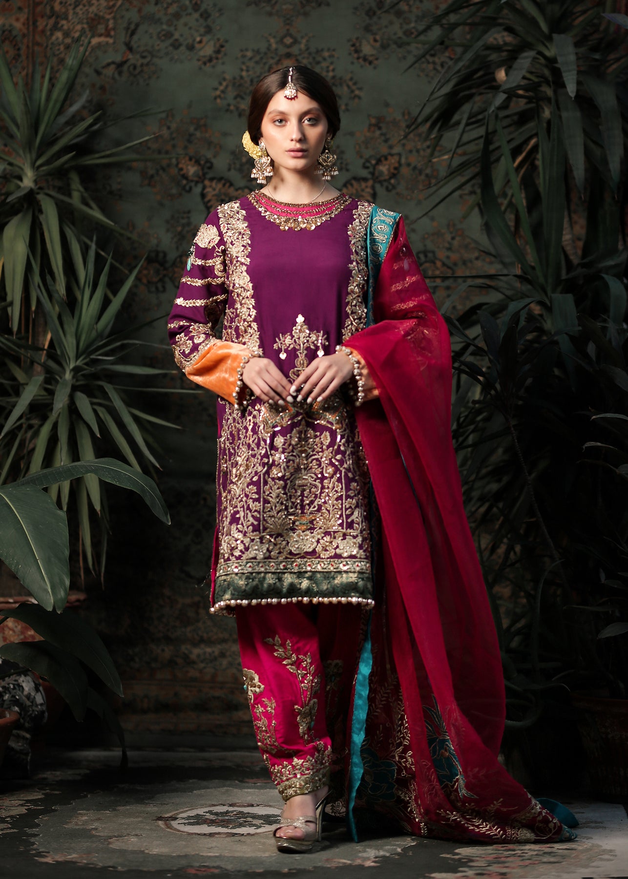 Pure raw silk traditional plum dress with candy pink neckline. Jamawar and pearls details on hemline. Fauna motifs finished with gota. Traditional motifs and velvet patch work on sleeves embellished with pearls, sequins and dabka. Enhanced with pearls, sequins and nakshi. Pure net dupatta enhanced with soft colours in applique work with zari and anchor thread.