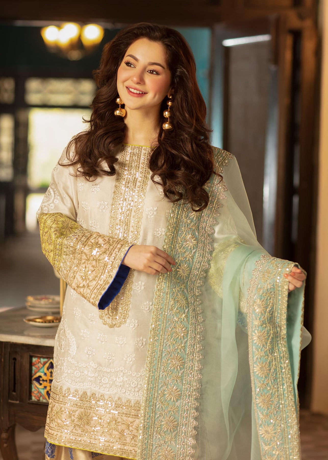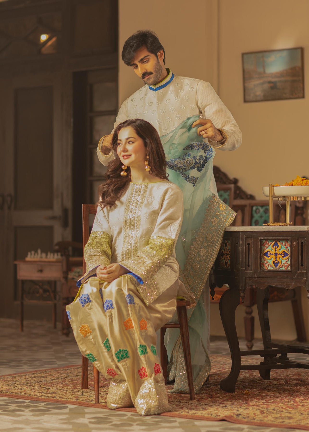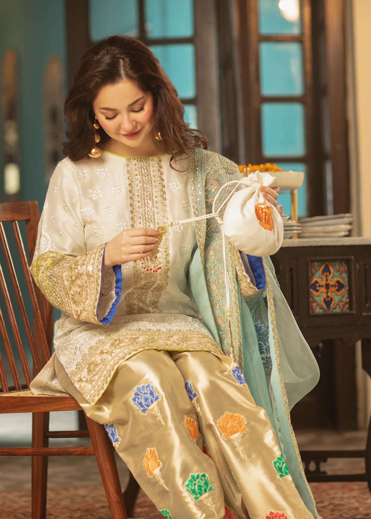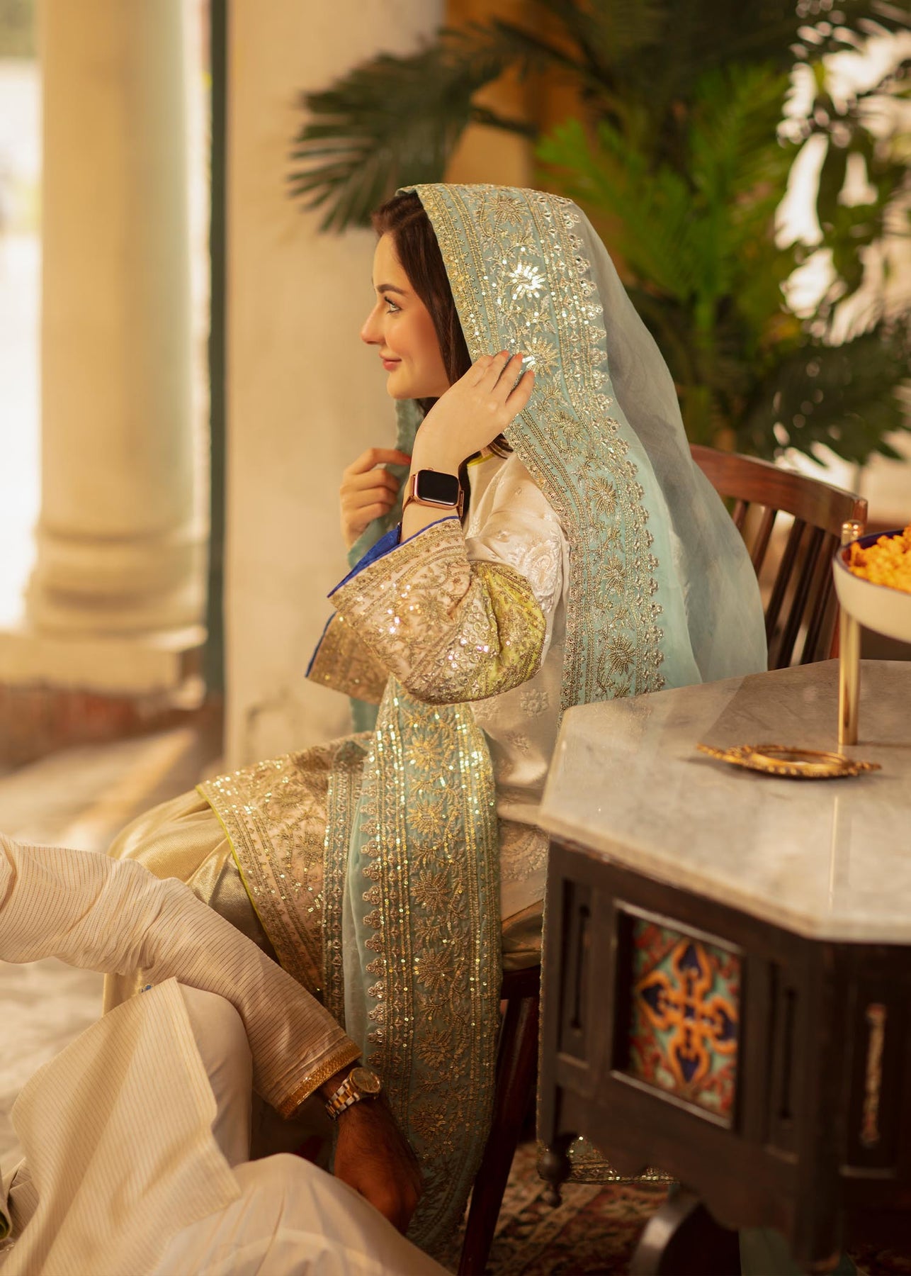 Description: A white cotton net shirt with self-embroidery, tilla and sequins is paired up with a golden tissue shlwar with embroidered roses. The ice blue organza dupatta has a stunning motif and is framed with a an embroidered border.