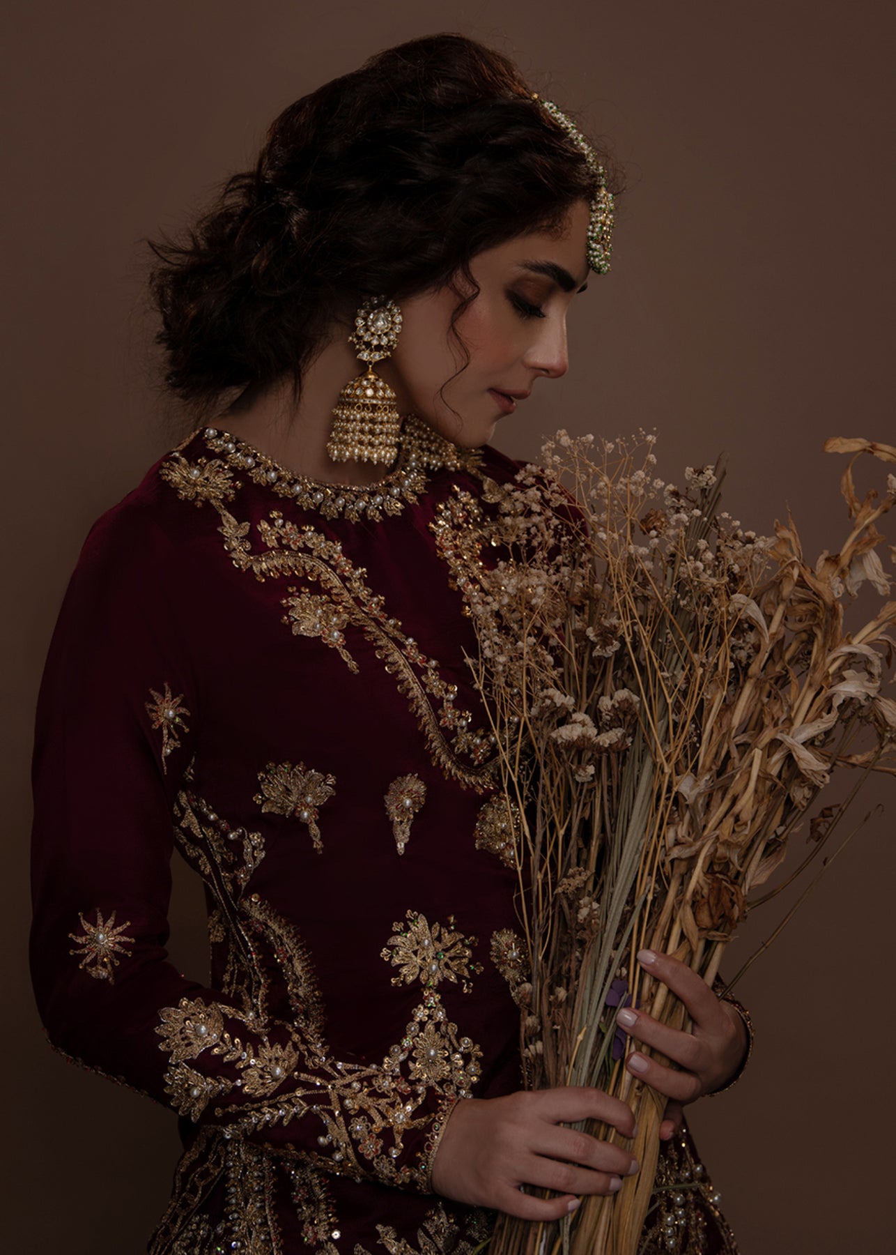 A pure plum raw silk base serves as a canvas to meticulously designed aari embroidery which is enhanced with crystals, sequence and zardozi work.