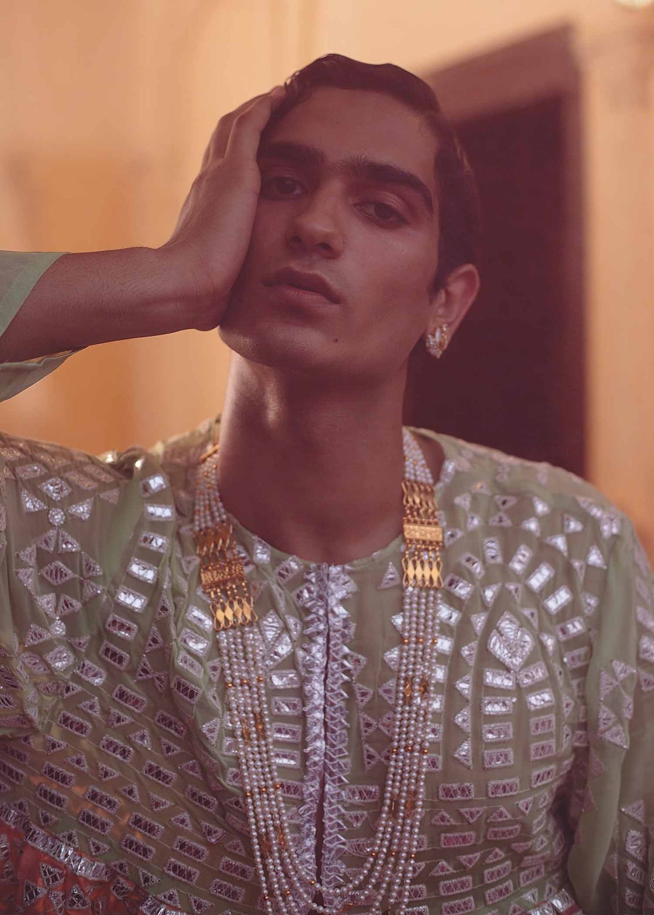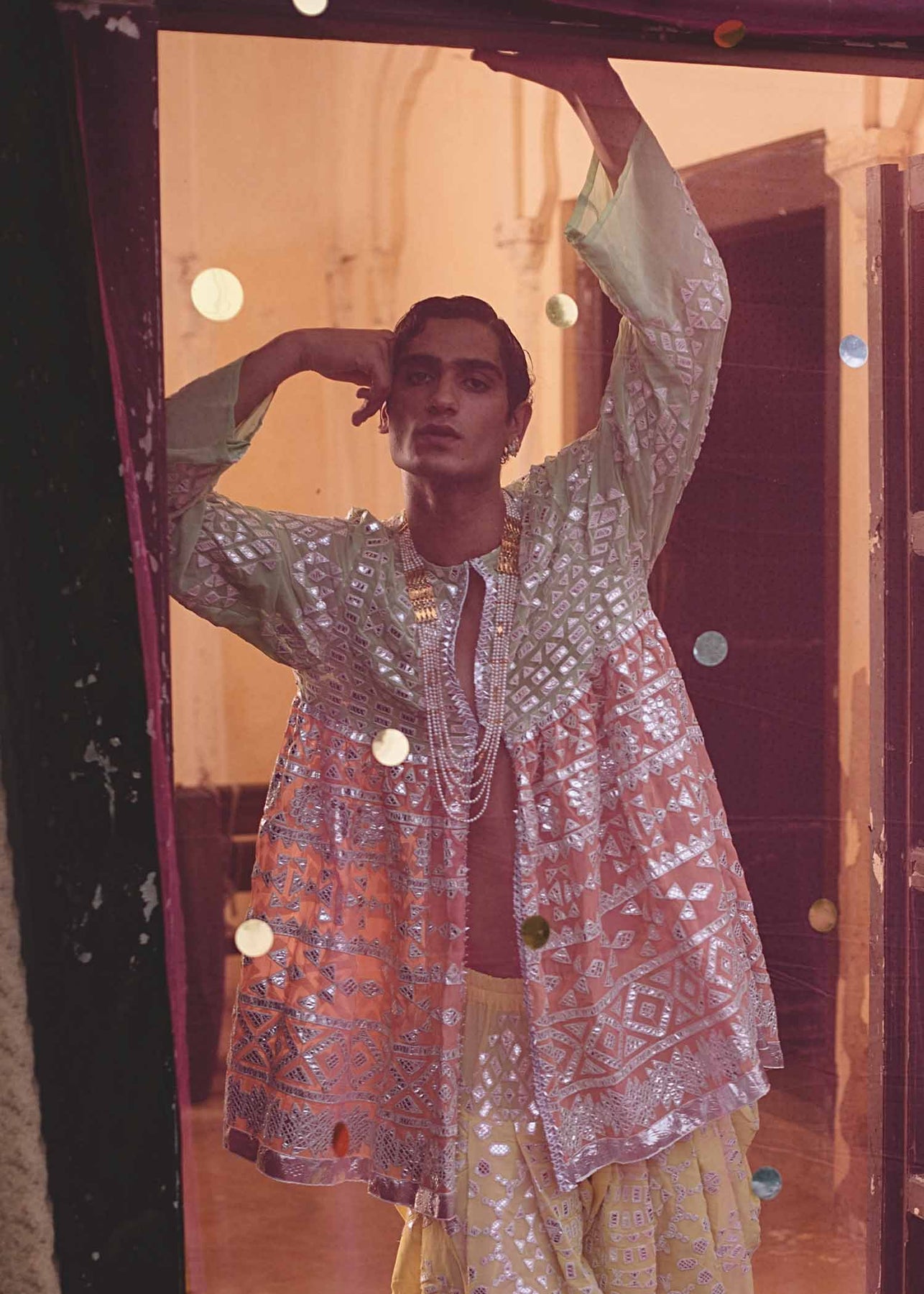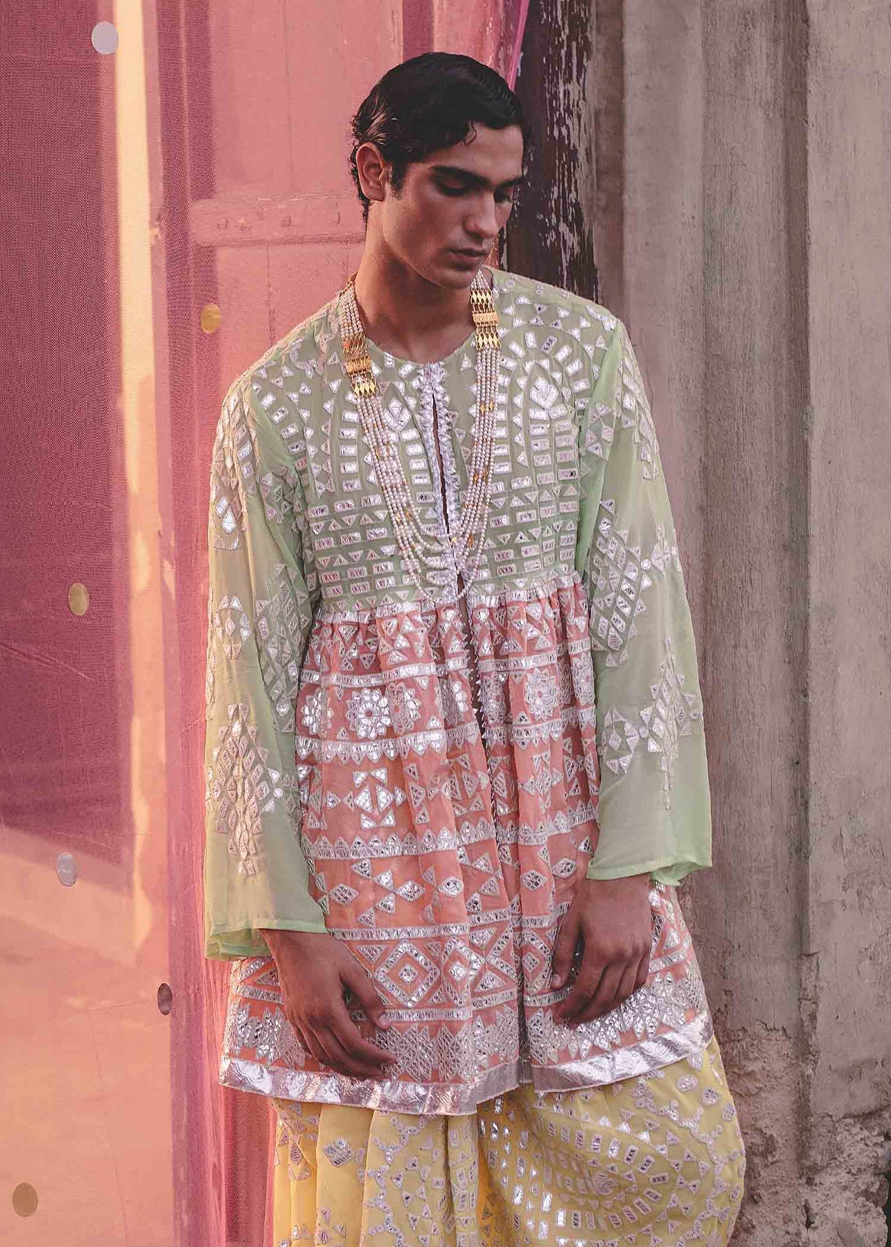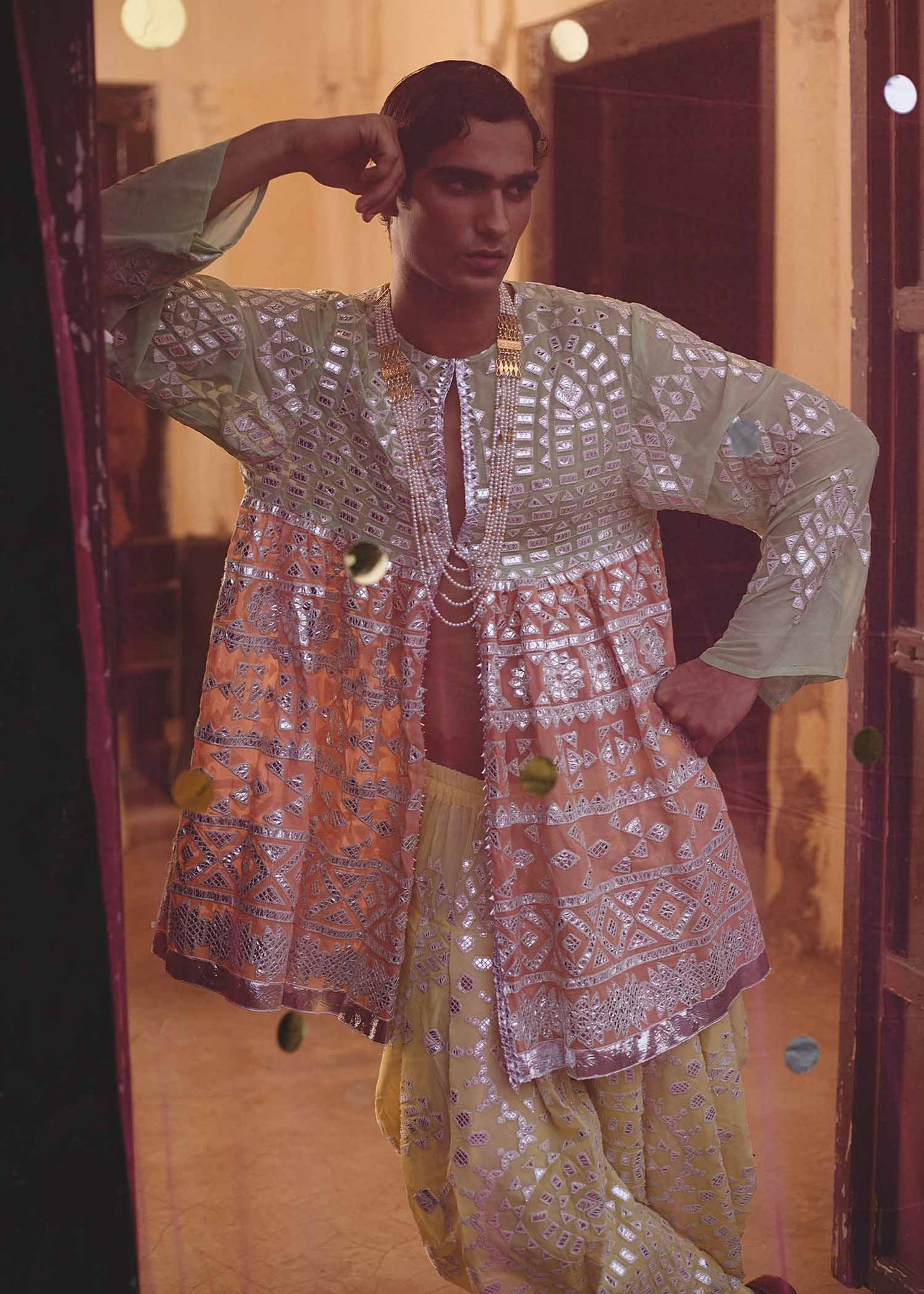 A beautiful chiffon kurta with embroidery is paired up with a dhoti shalwar in lime yellow color with embroidery.