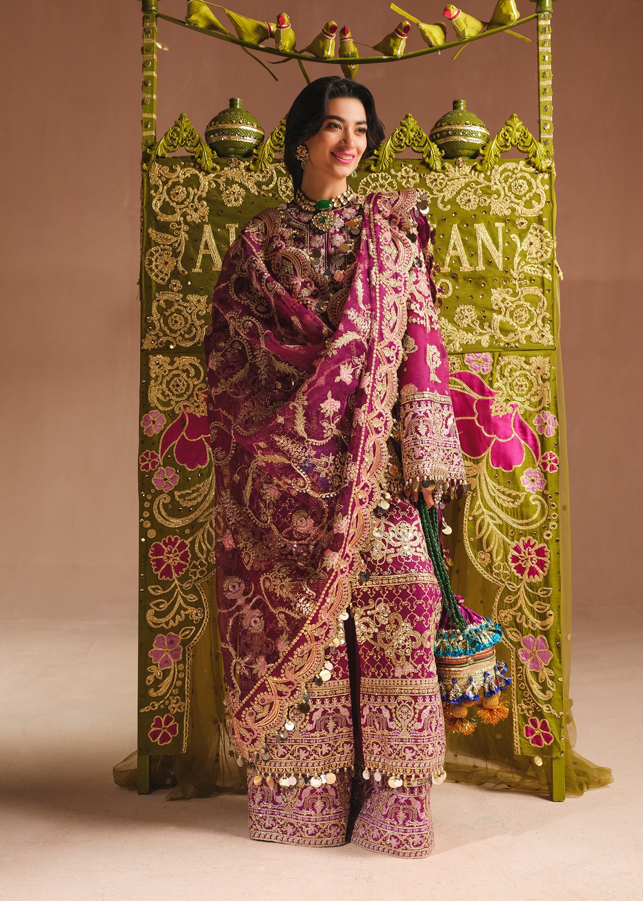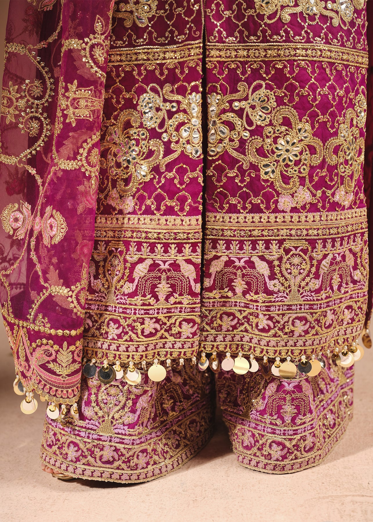 An exquisite plum organza shirt and shalwar is adorned with intricate gold tilla, dazzling sequins and panni work. It is beautifully embroidered with baby pink thread work. Complementing the ensemble is a lovely plum embroidered dupatta framed with a scalloped border.