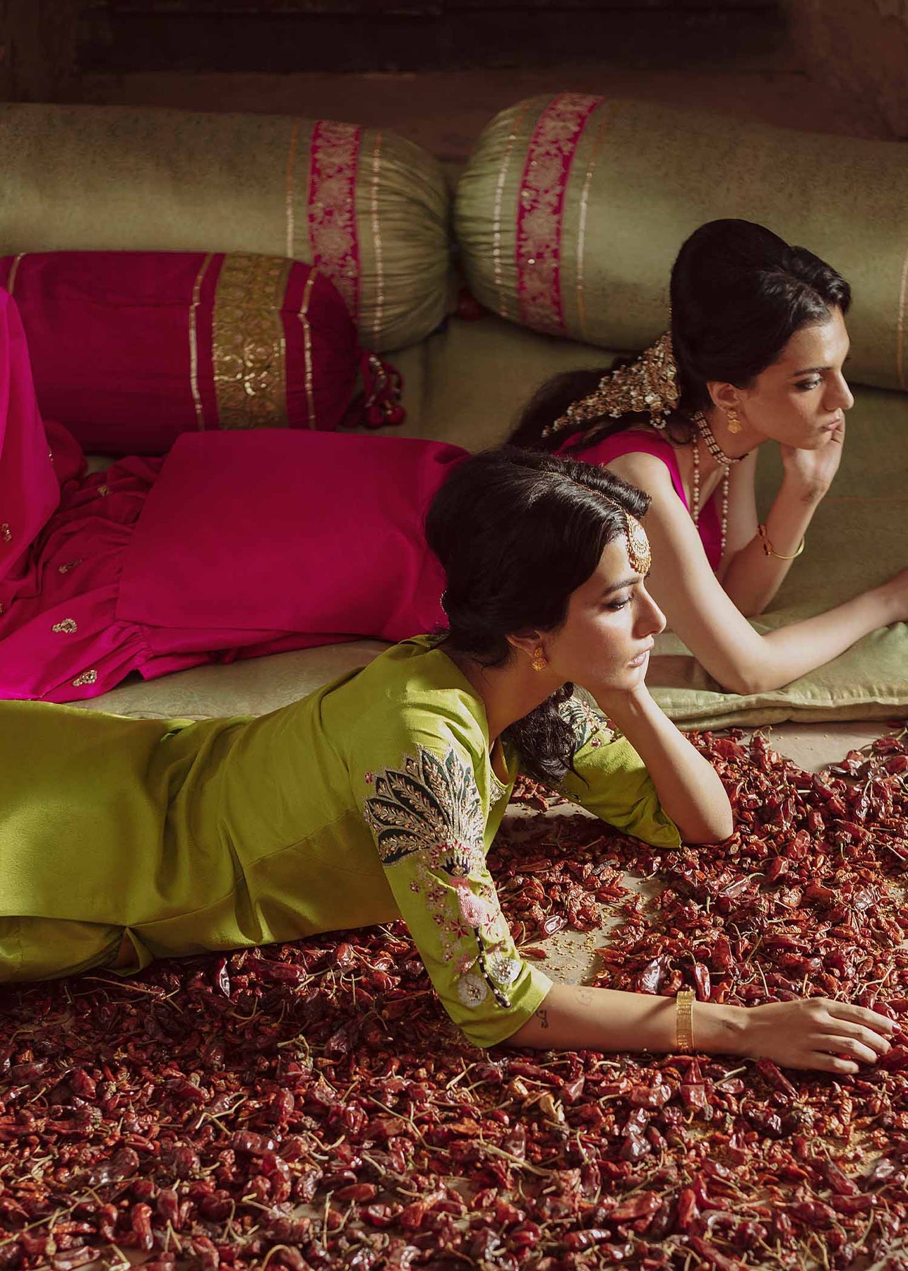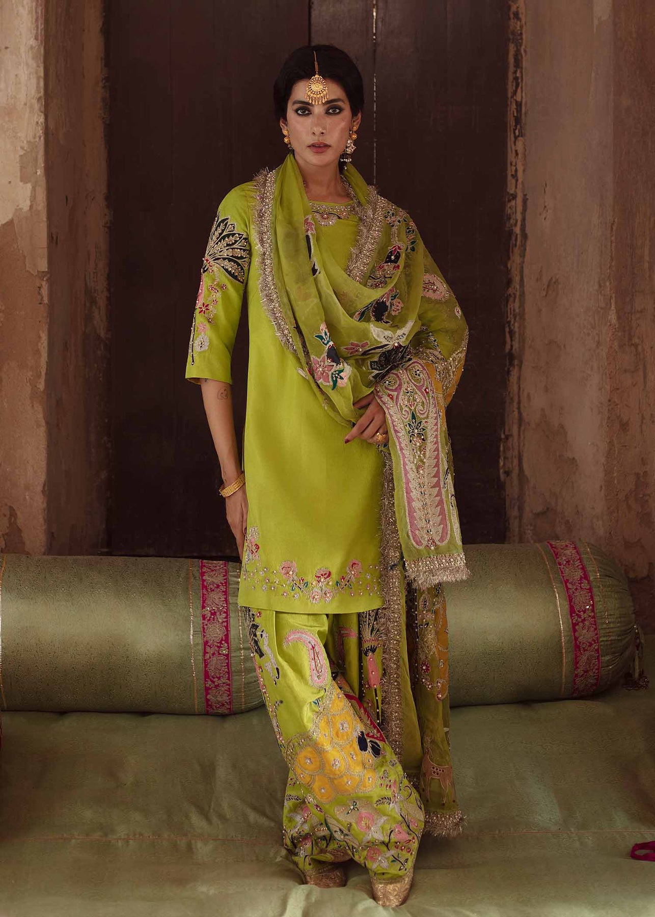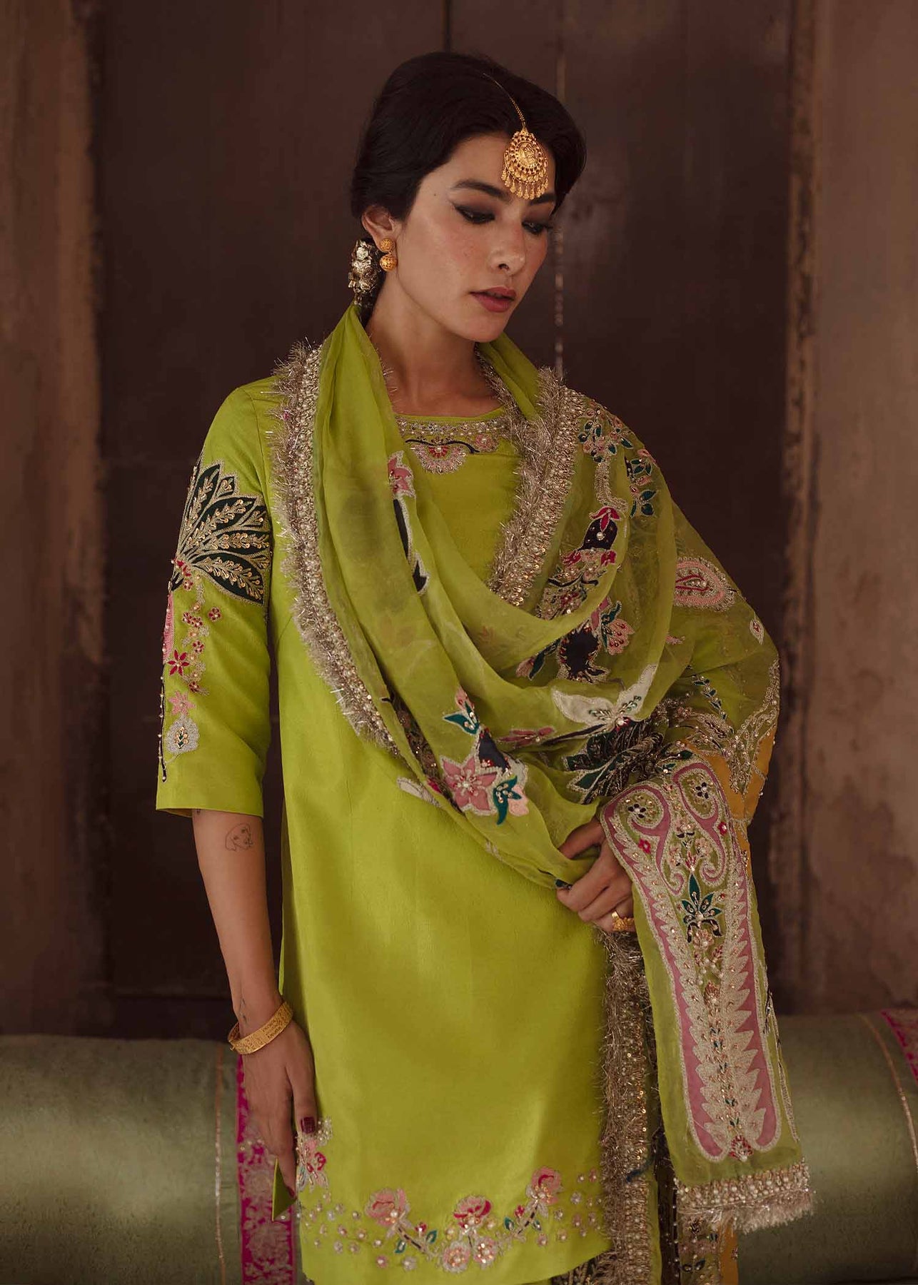 A dhani green, raw silk shalwar kameez has aari embroidery in tilla and resham. It is paired up with an organza dupatta incrusted with aari work along with silver and gold tilla. The dupatta is enhanced with gold sitara, pearls and beads framed with aari border and kiran.