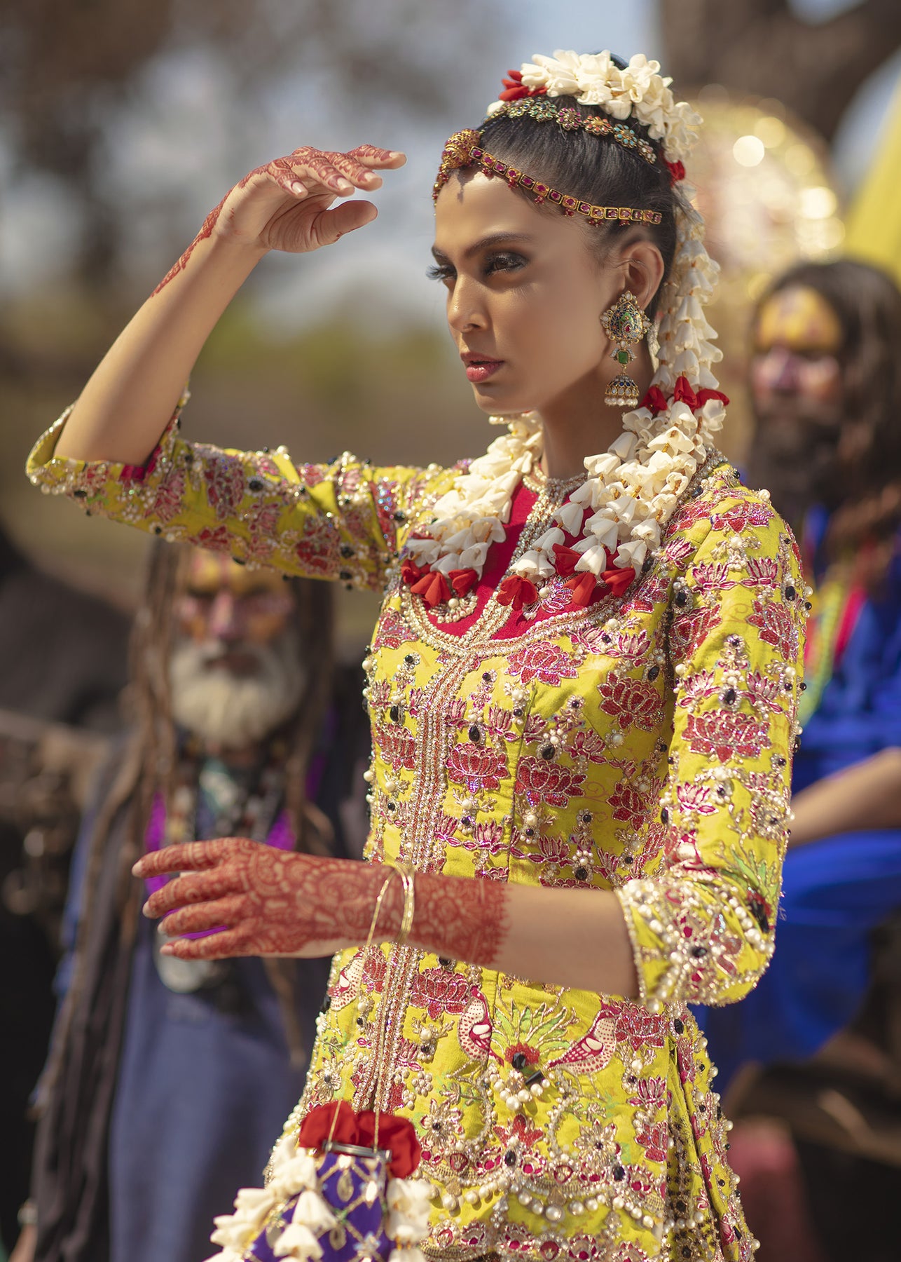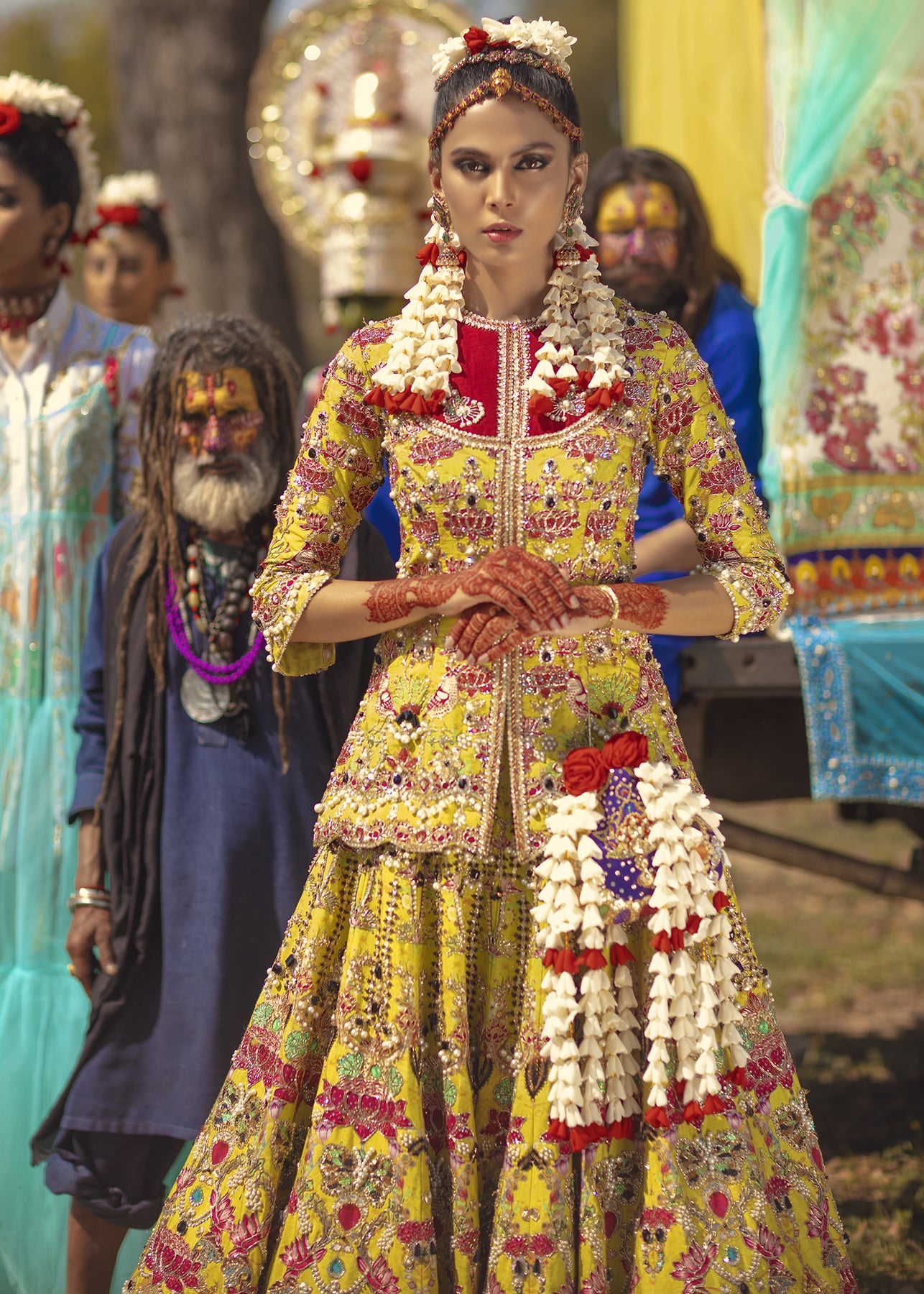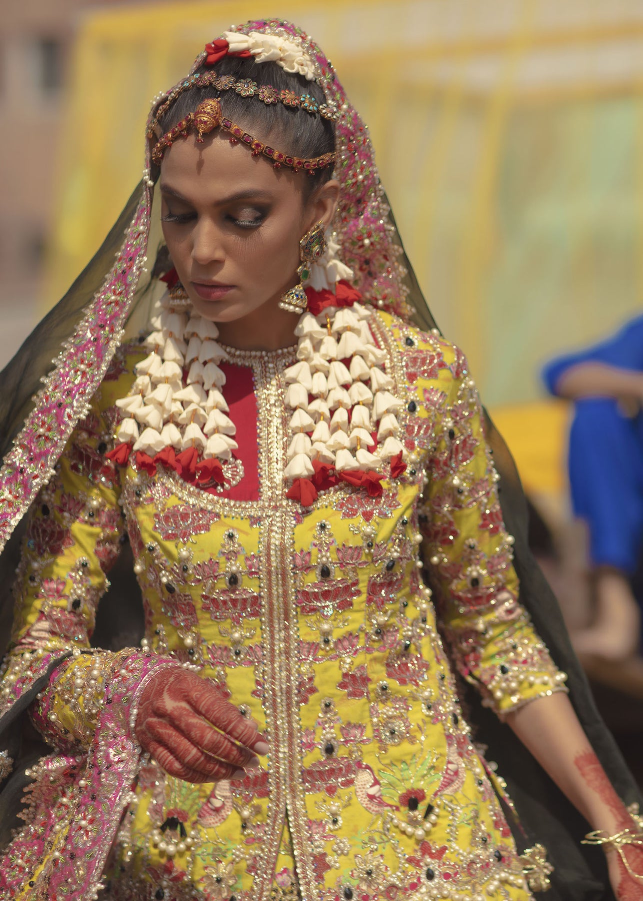 Pure raw silk traditional mustard dress with candy pink neckline. Fauna motifs finished with gota. Traditional motifs on sleeves embellished with pearls, sequins and dabka. Enhanced with pearls, sequins and nakshi. Pure net dupatta finished with embellished lace.