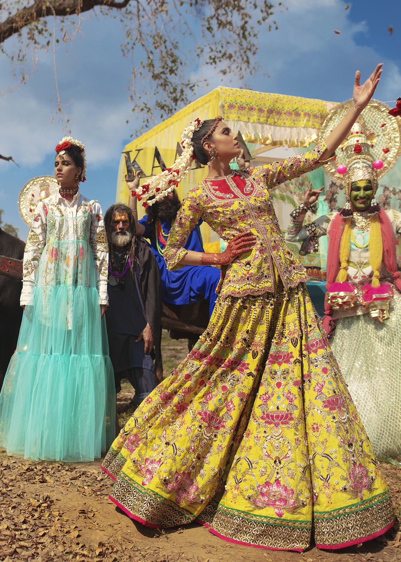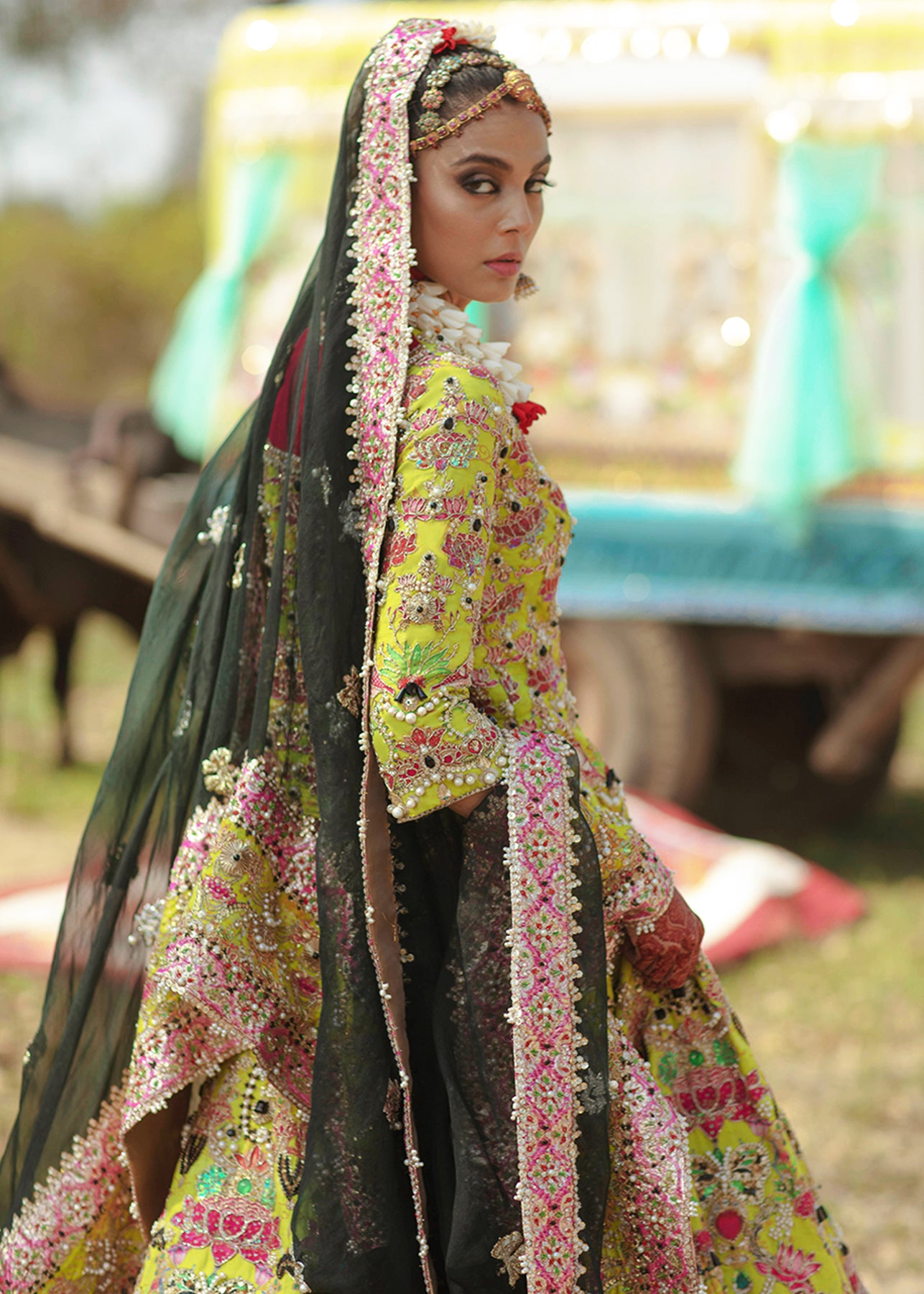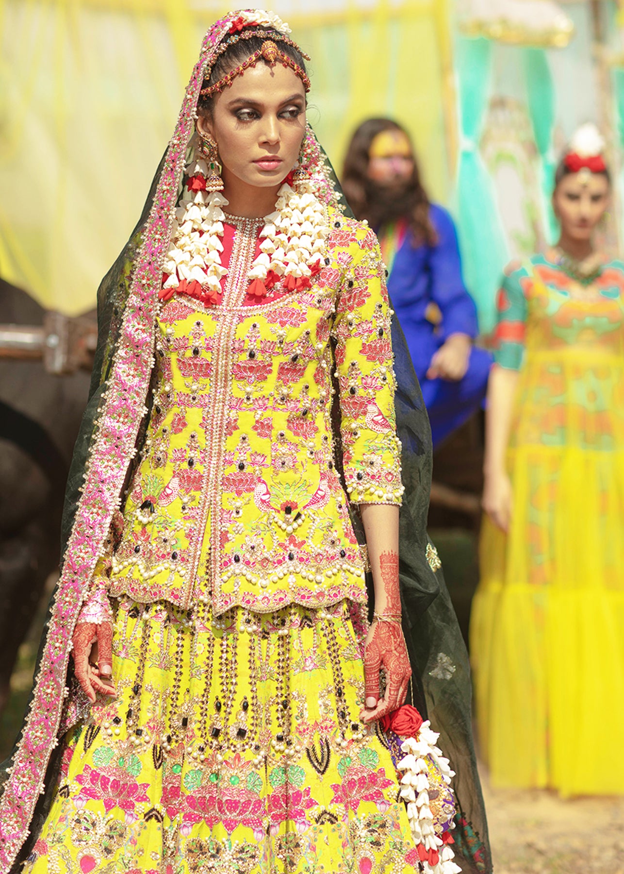 Pure raw silk traditional mustard dress with candy pink neckline. Fauna motifs finished with gota. Traditional motifs on sleeves embellished with pearls, sequins and dabka. Enhanced with pearls, sequins and nakshi. Pure net dupatta finished with embellished lace.