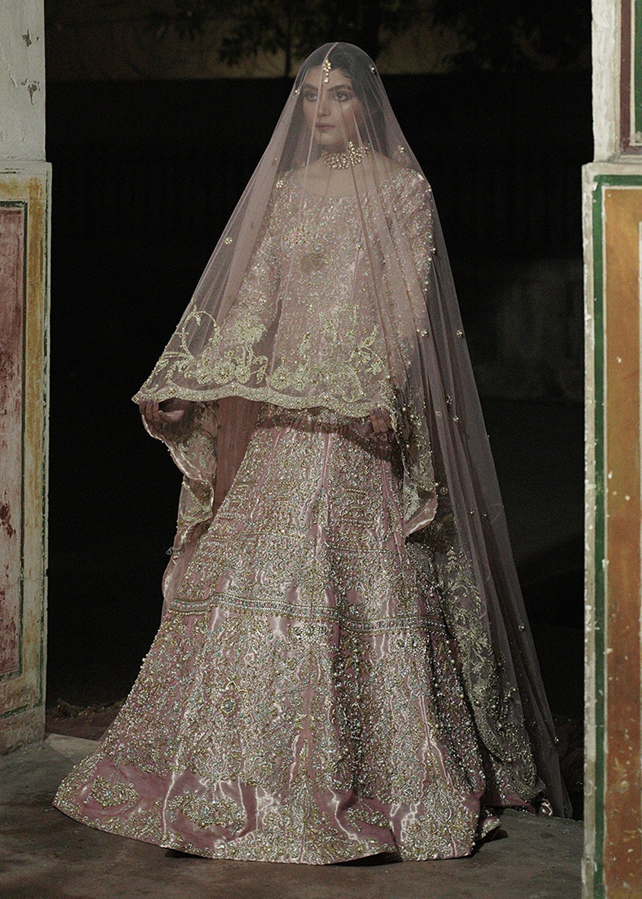 An interplay of fine gold and silver threads over a captivating power pink canvas brings life to hand-embellished motif of kora and dabka. The one-piece bridal is paired with a gorgeous veil as a symbol of divinity and grace.