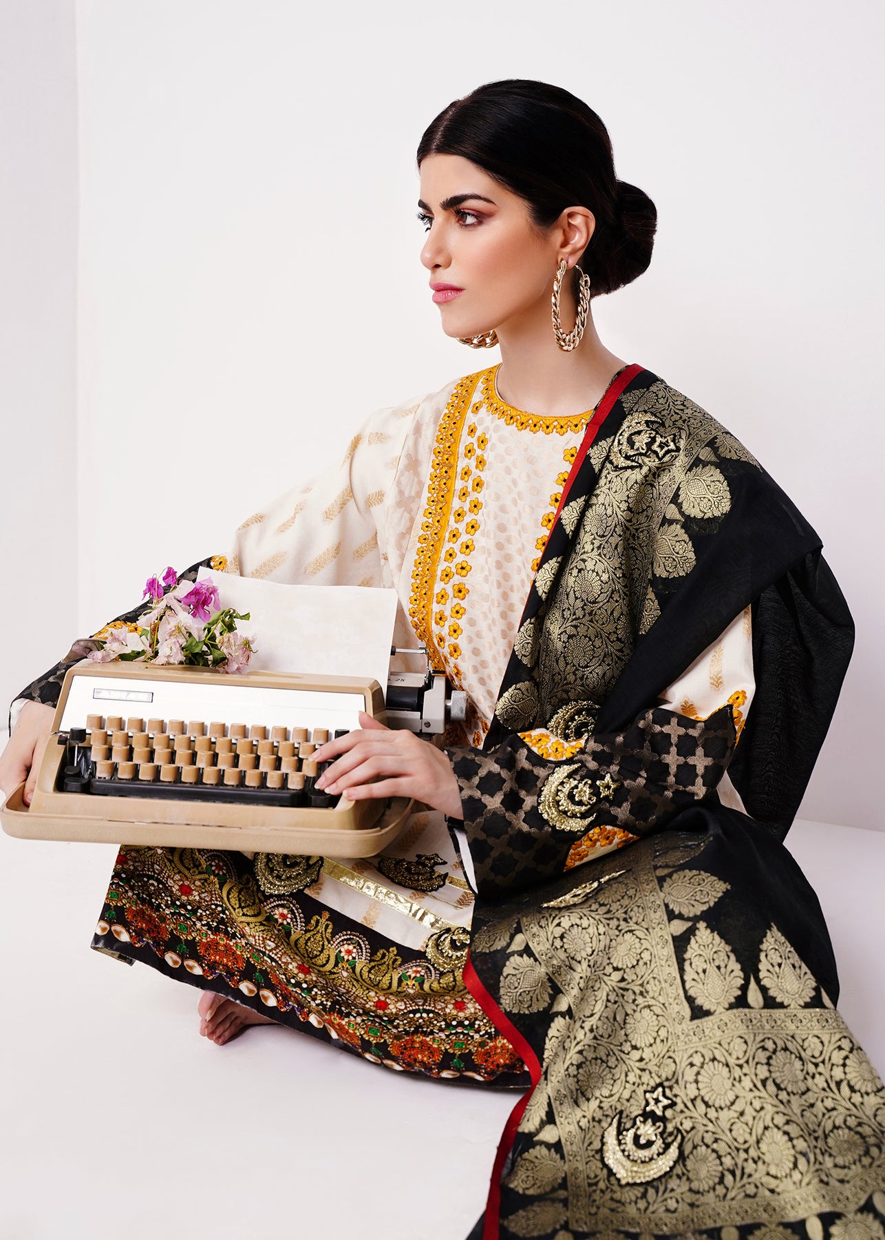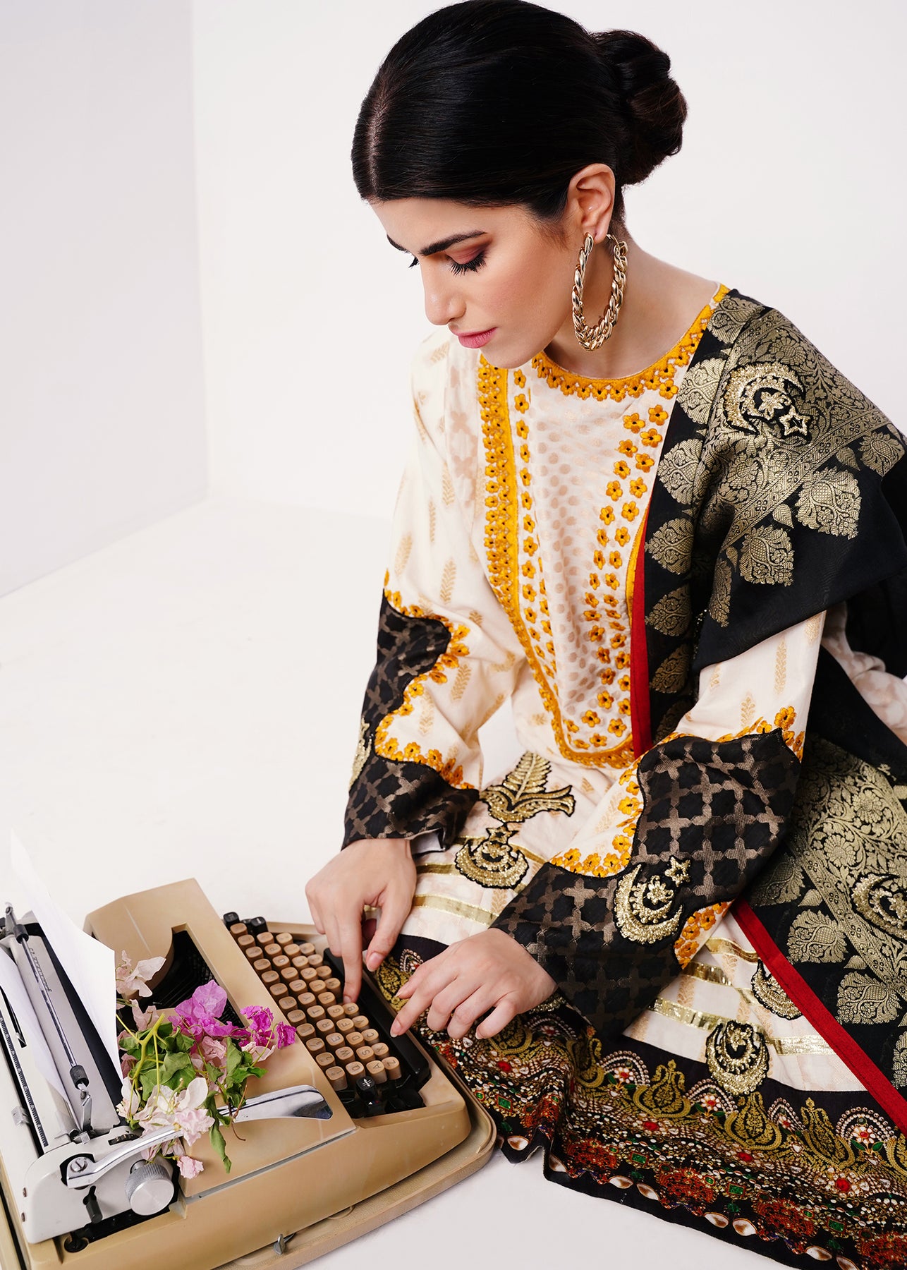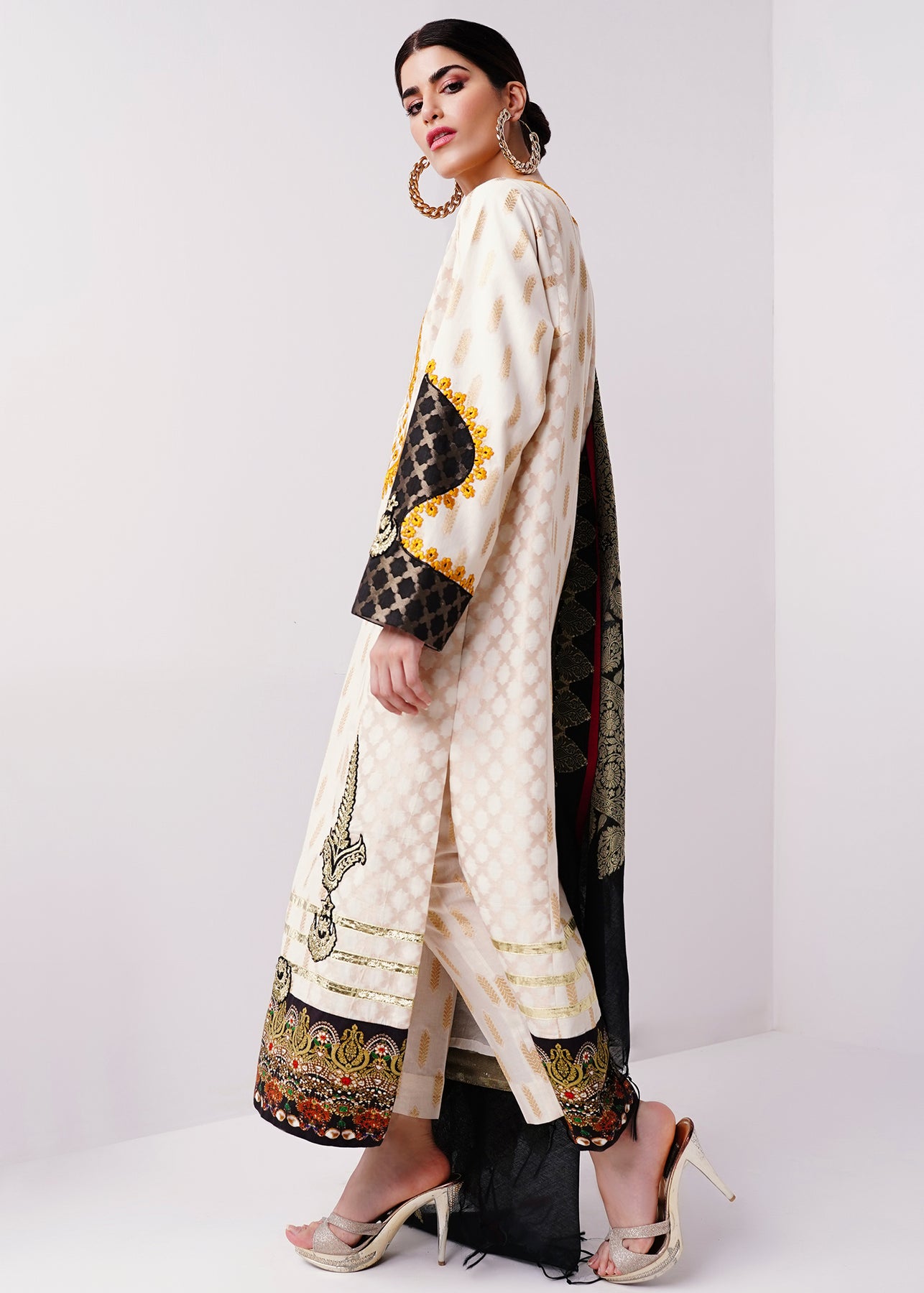 Long ivory shirt of jacquard fabric is adorned with tilla motifs patch work. Further decorated with digital printed silk border and thread work on neckline. The look is completed with jacquard pants and hand woven duppatta with tilla work motifs.