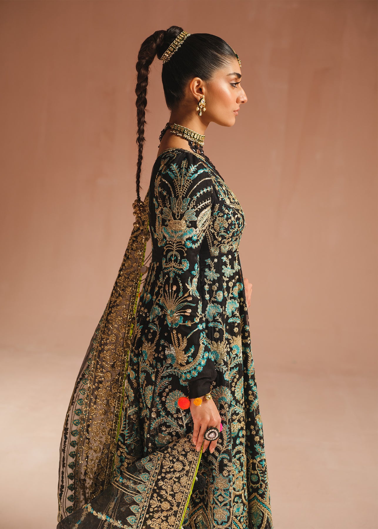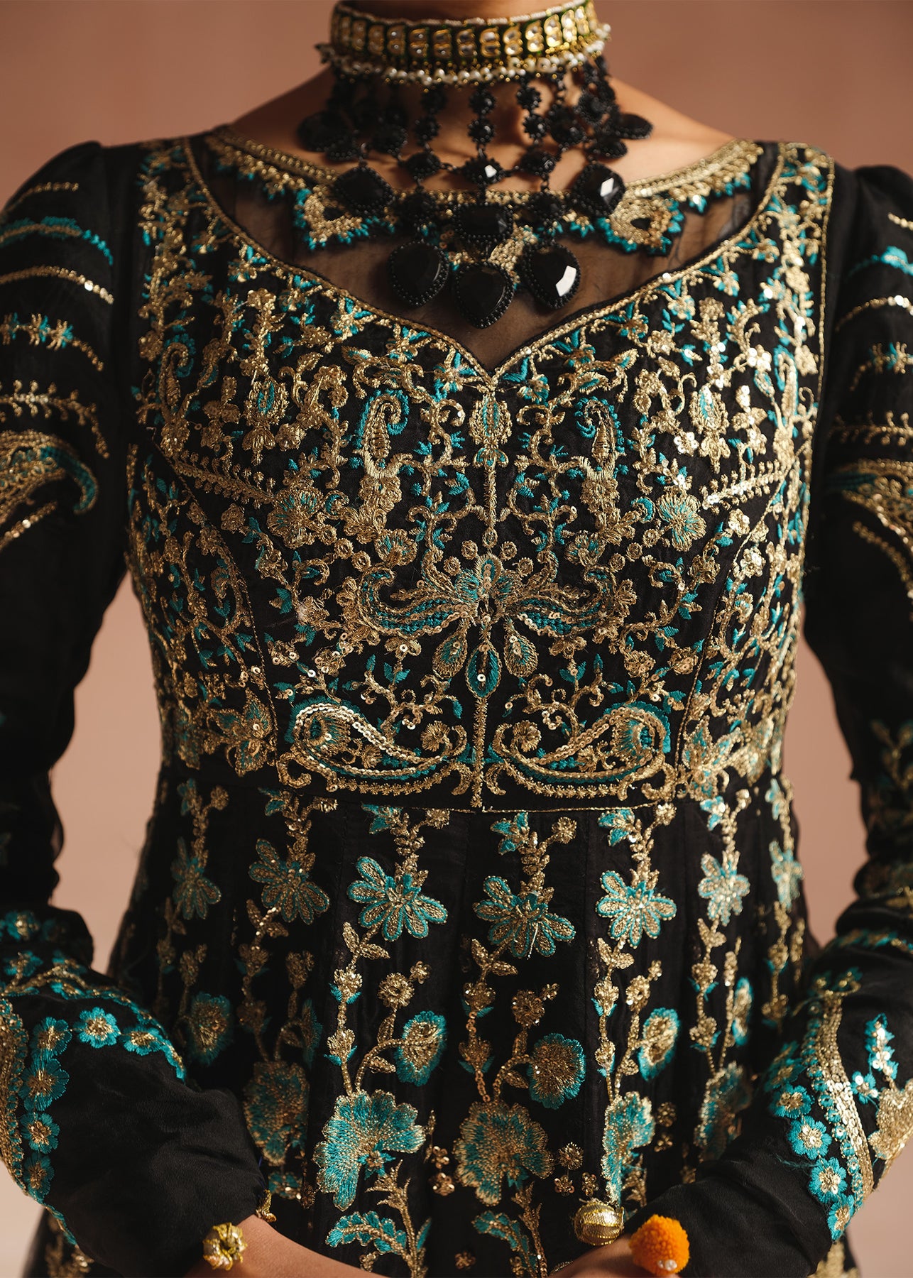 An exquisite black pishwas is adorned with opulent gold embroidery, intricate tilla, sequins and blue thread work. The jewel neckline and hot pink embroidered border adds a touch of regal elegance. Complementing the ensemble is a stunning organza dupatta framed with a beautifully embroidered border.