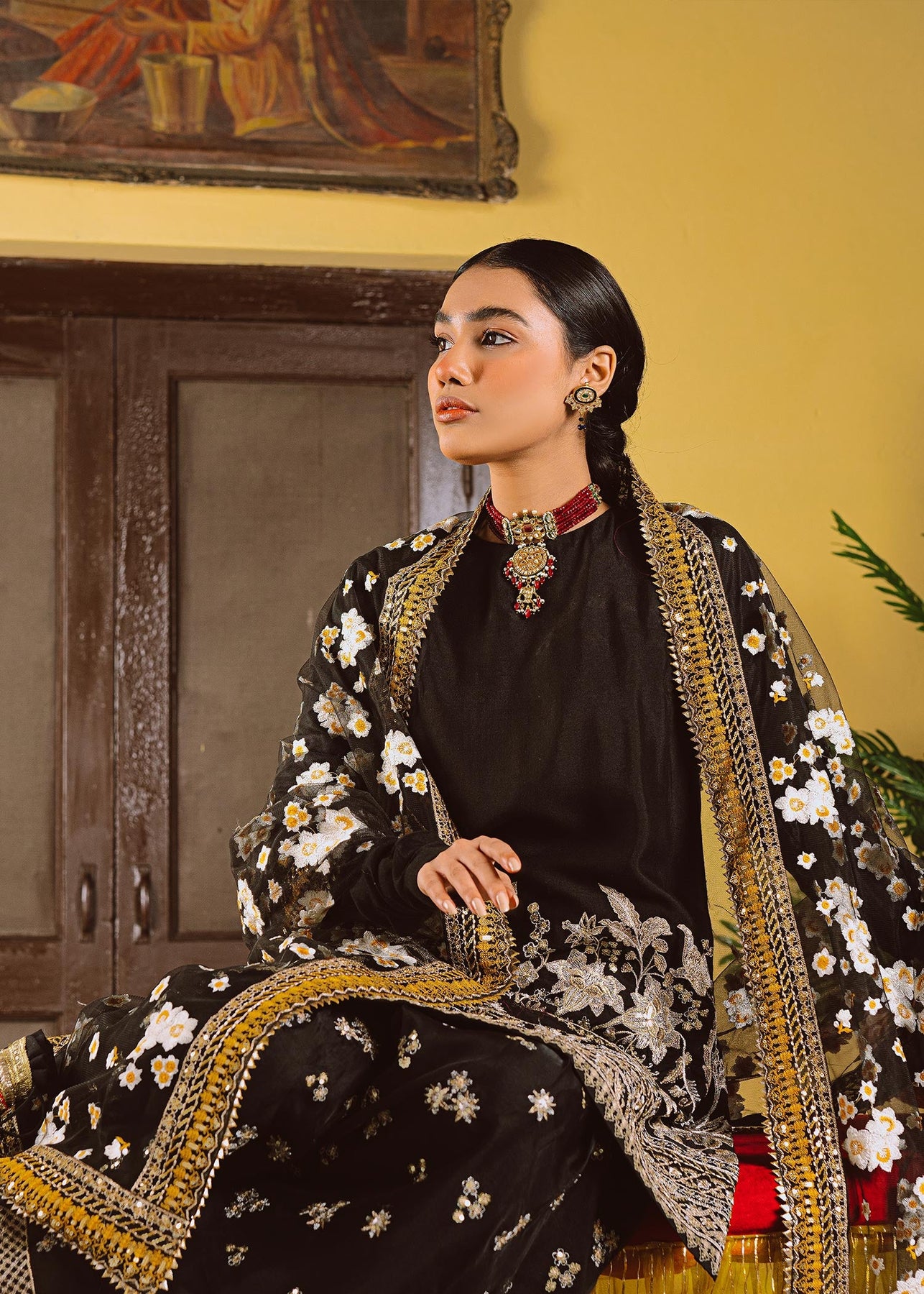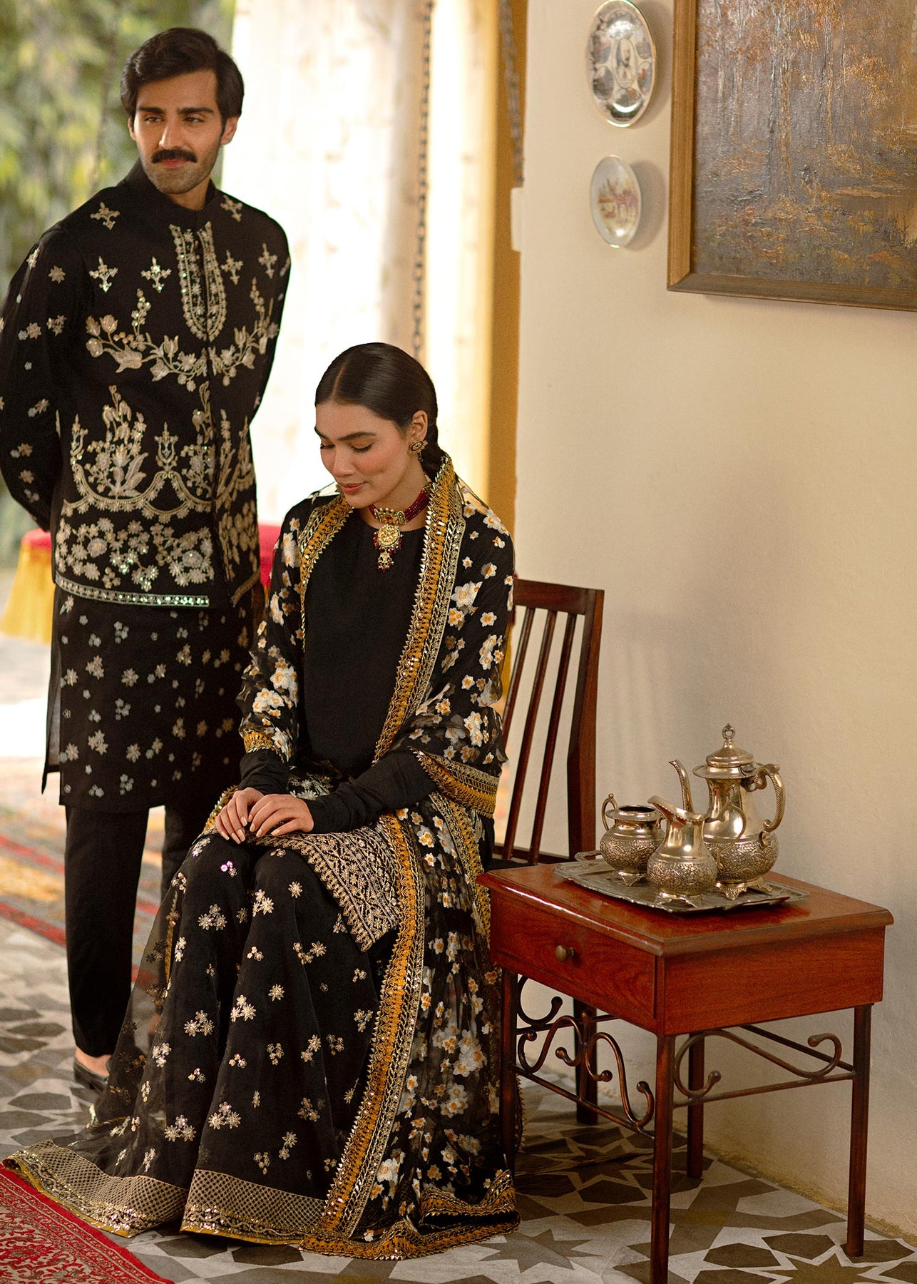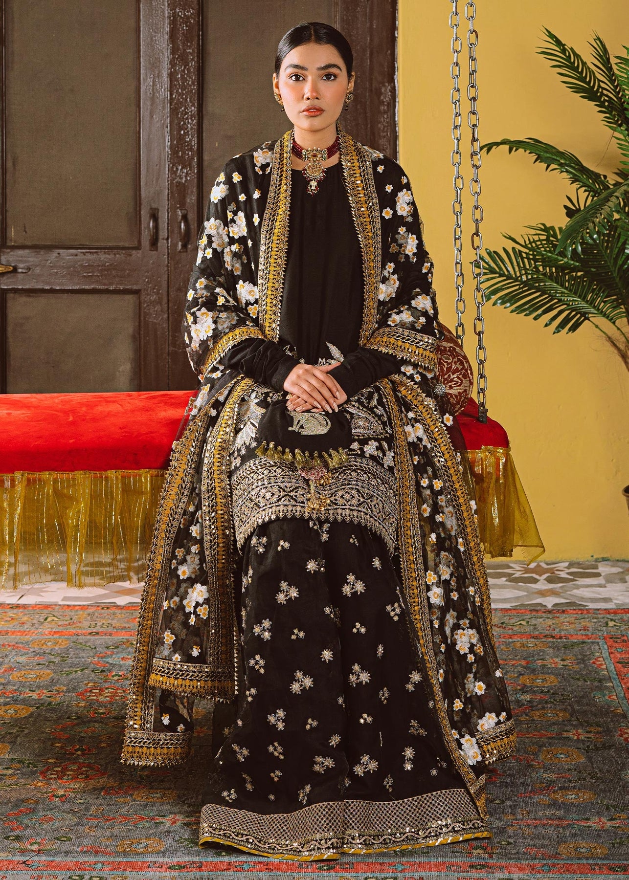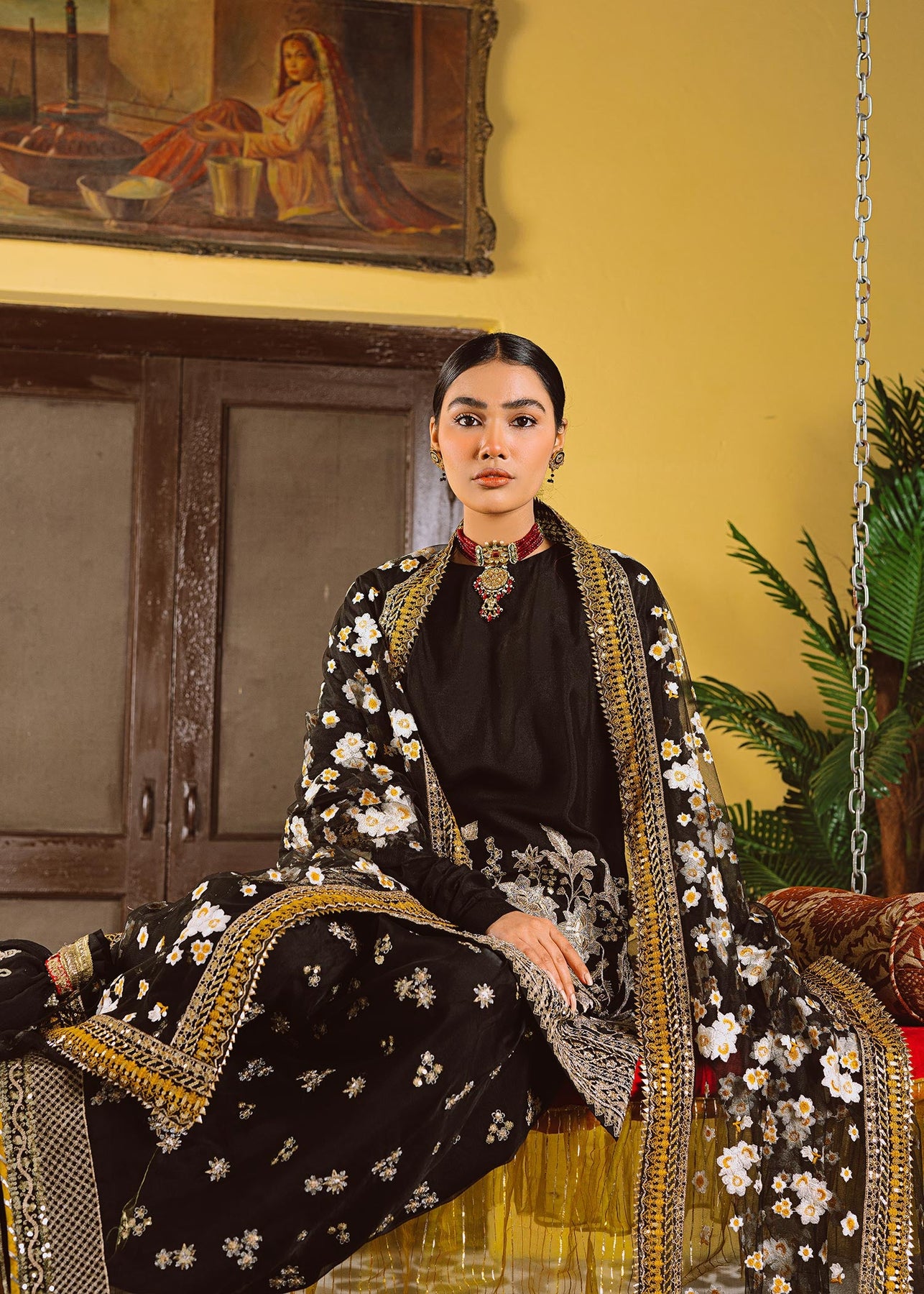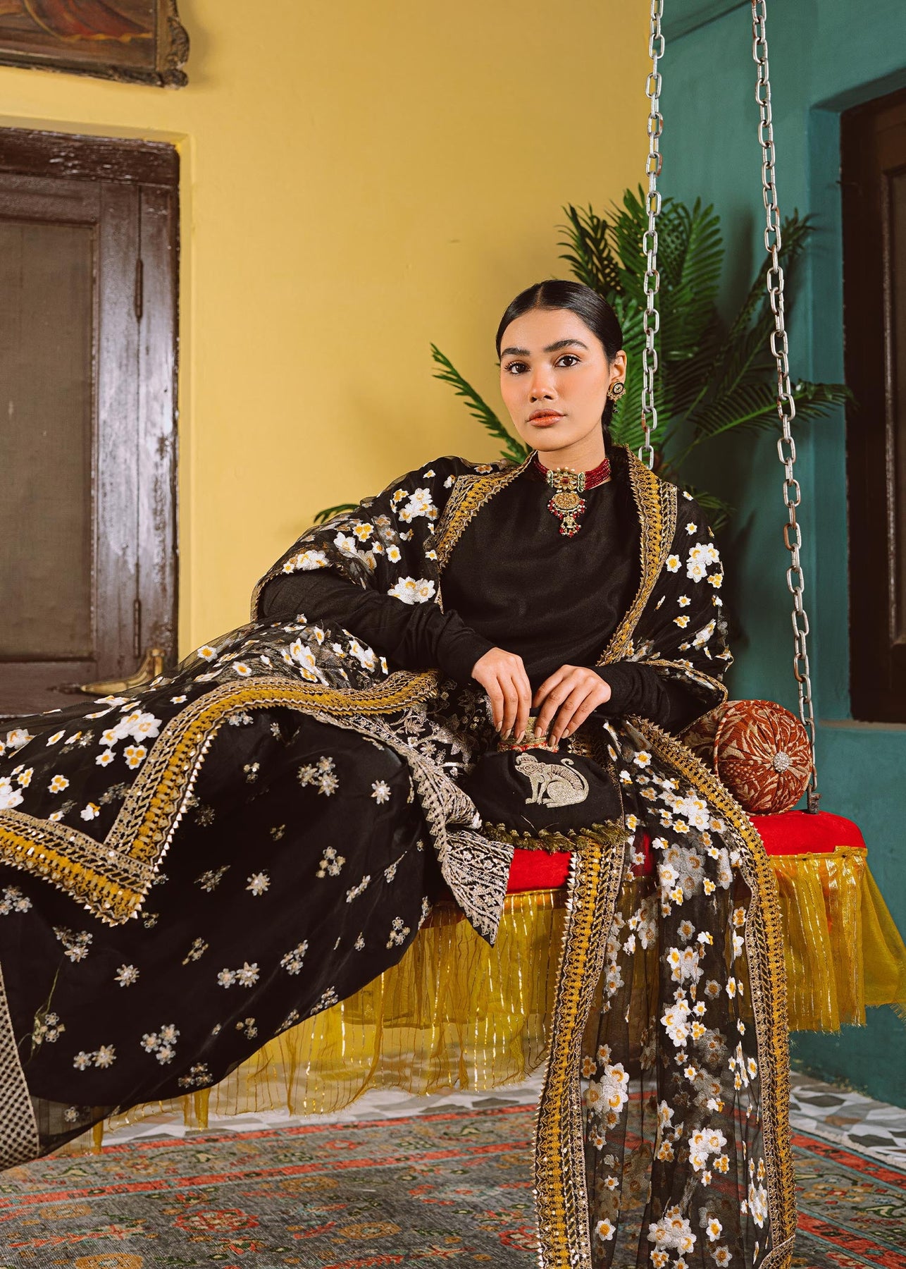 Description: A black cotton net shirt with choridar sleeves and organza ghrara have beautiful tilla embroidery and sequins work. It is paired up with a net dupatta adorned with deffodils and framed with embroidered boarders.