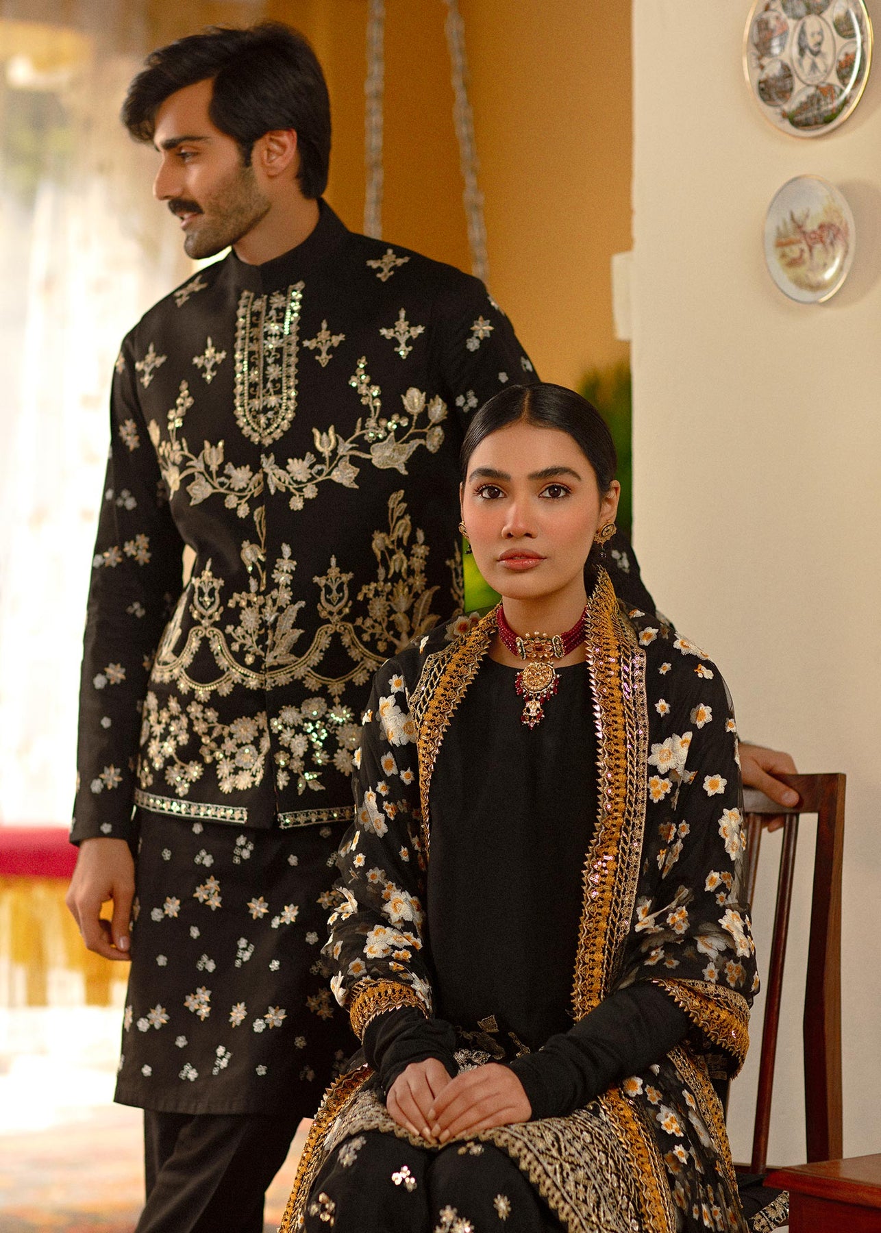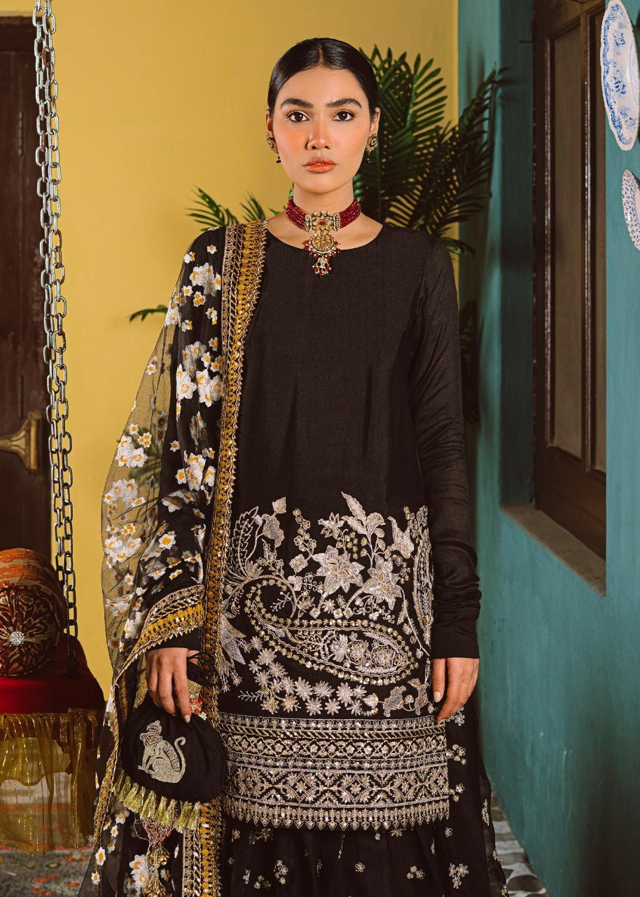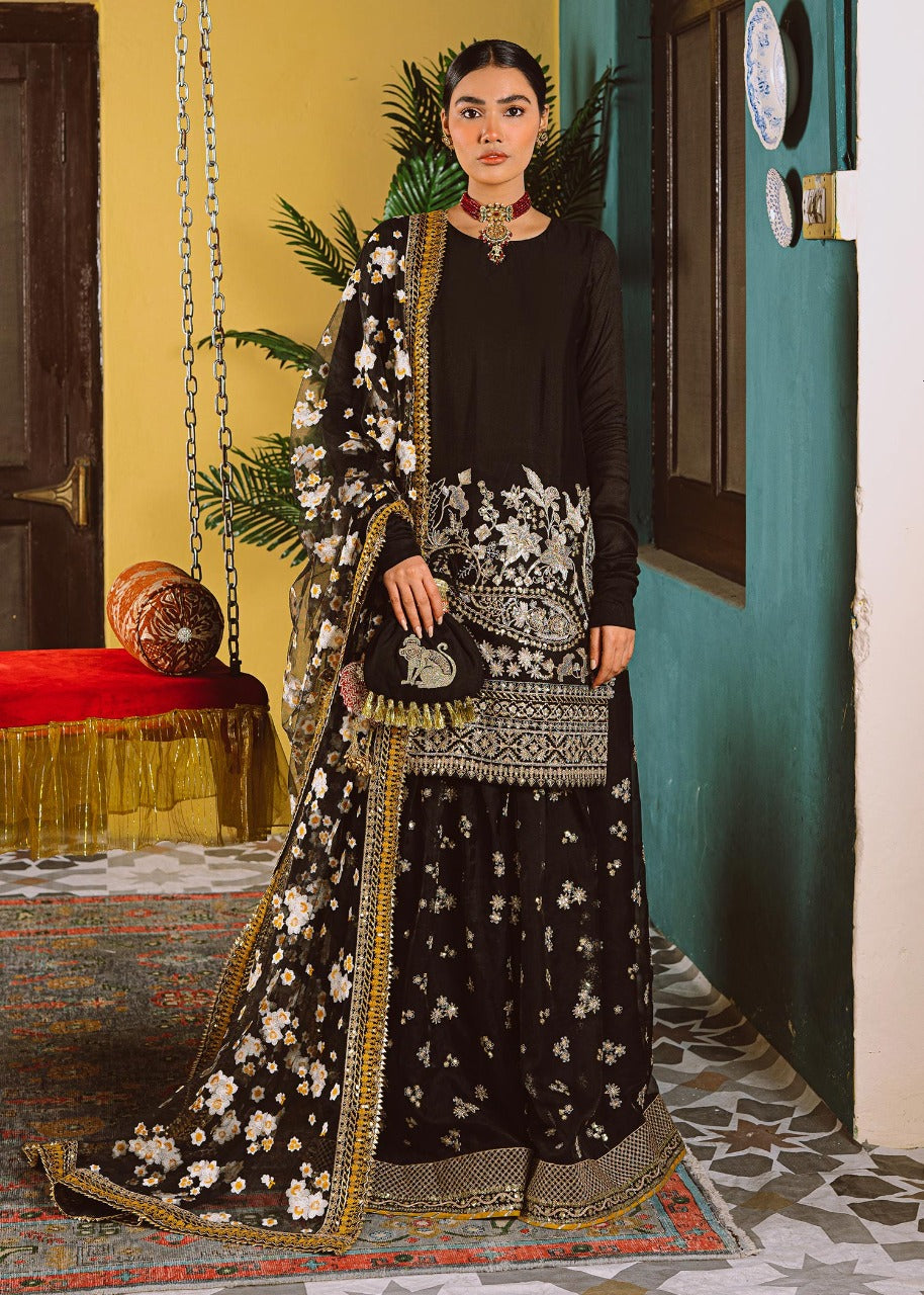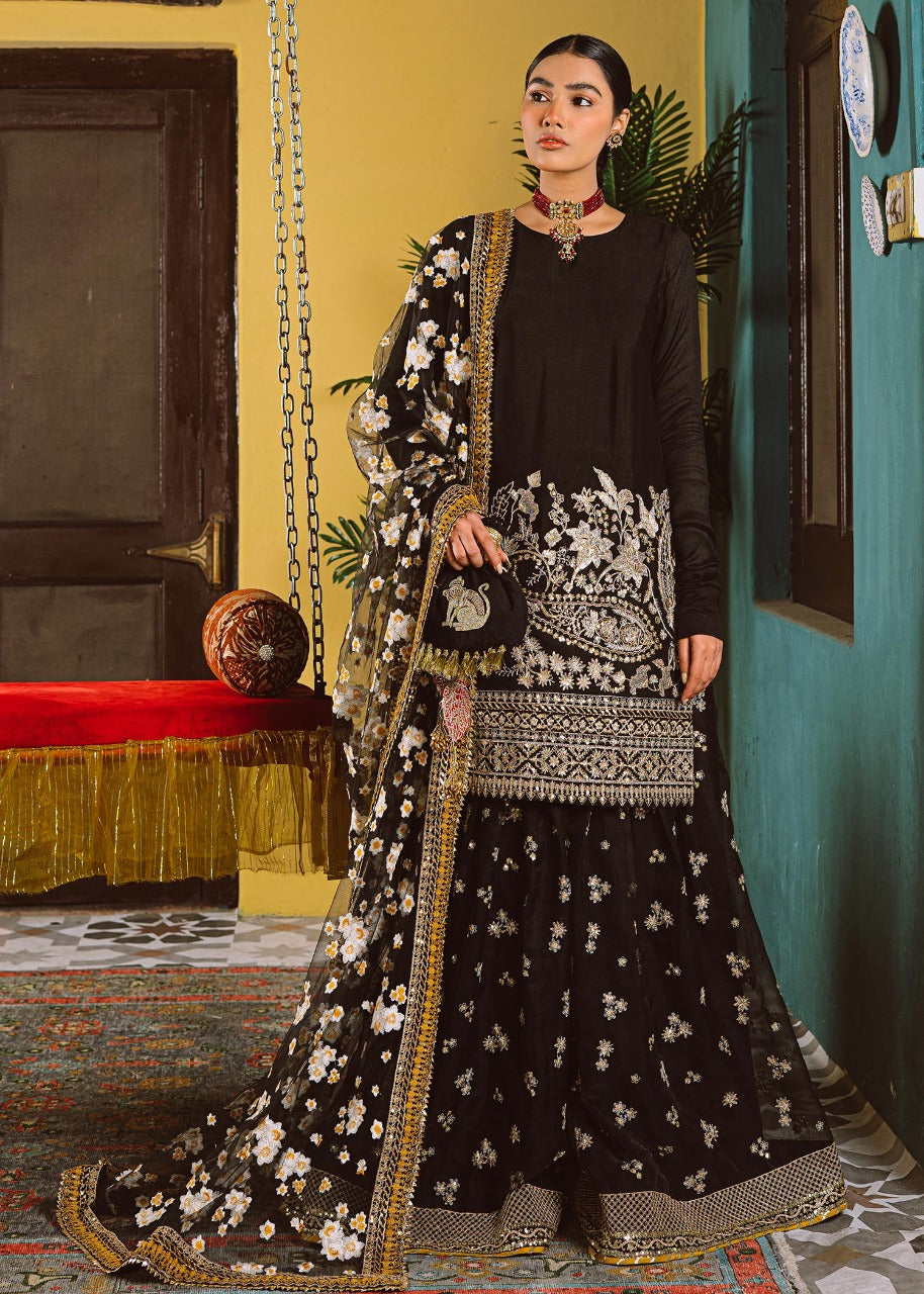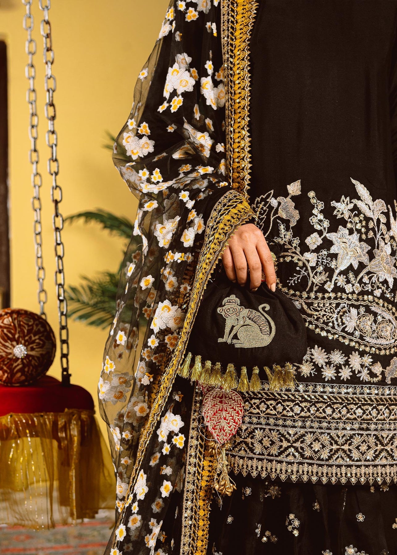 Description: A black cotton net shirt with choridar sleeves and organza ghrara have beautiful tilla embroidery and sequins work. It is paired up with a net dupatta adorned with deffodils and framed with embroidered boarders.