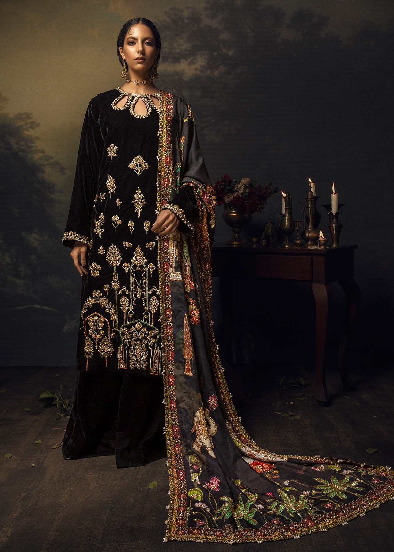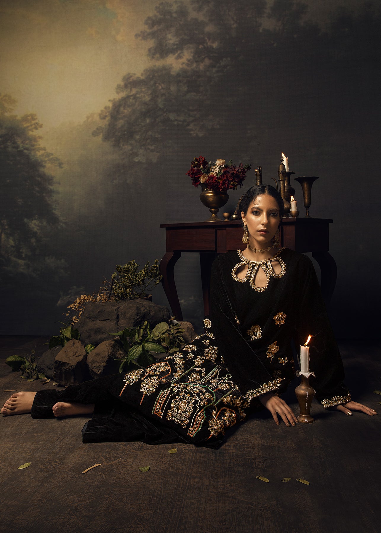 A luscious black velvet shirt with tilla embroidery is enhanced with pearls, silk treads and sequins. It is paired up with a bootcut trouser and a heavenly gorgeous hand-rendering shawl with Mughal inspired motifs.
