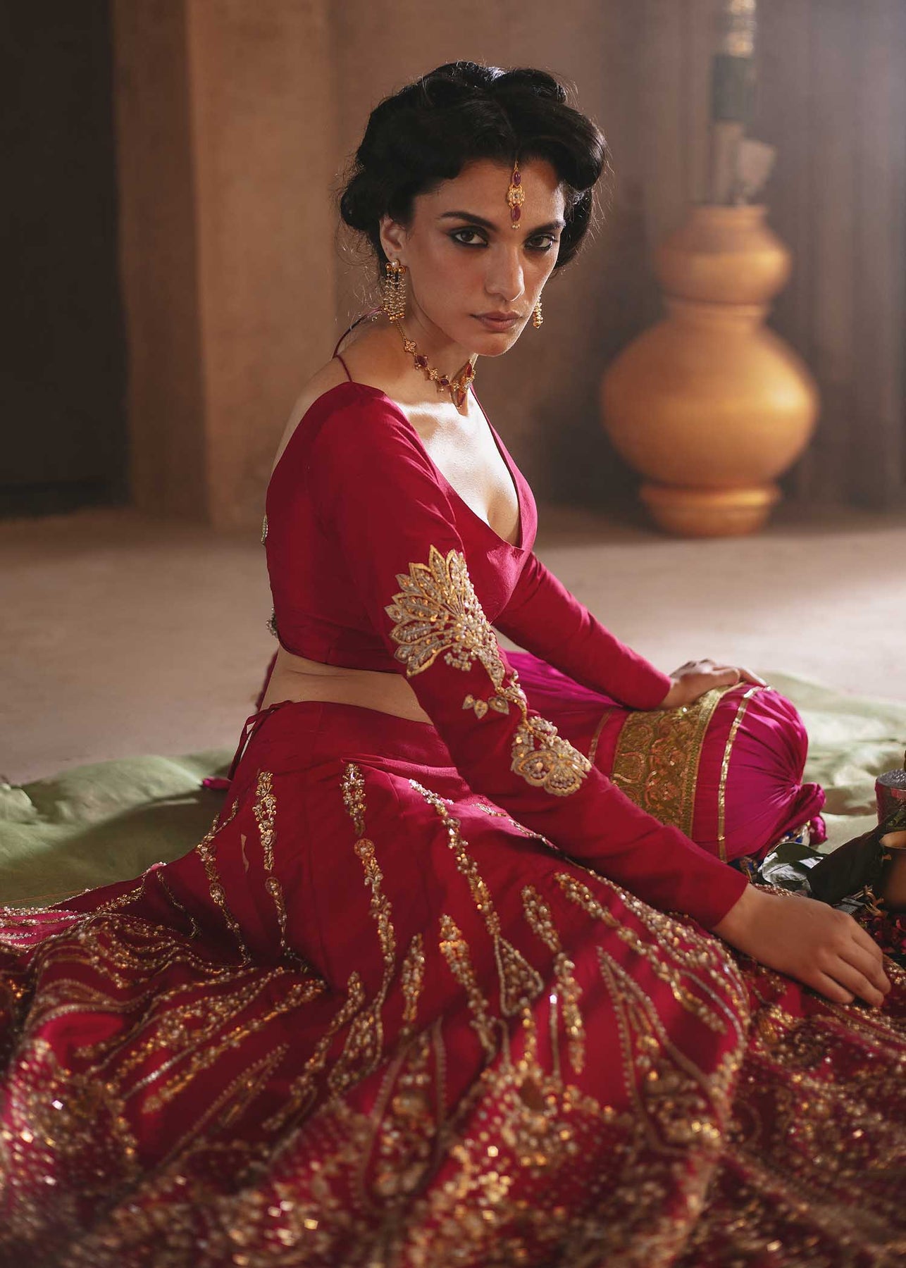 A pure raw silk lehnga is beautifully handrendered and enhanced with katori sitara, pearls, dabka and gota work. It is paired up with a raw silk choli with tilla motifs on the sleeves along with two dupattas. The bottle green organza dupatta has aari embroidered paisleys adorned with pearls and sitara and framed with kiran. The second organza dupatta in deep maroon shade has aari embroidered, enhanced with sequins, beads and pearls.