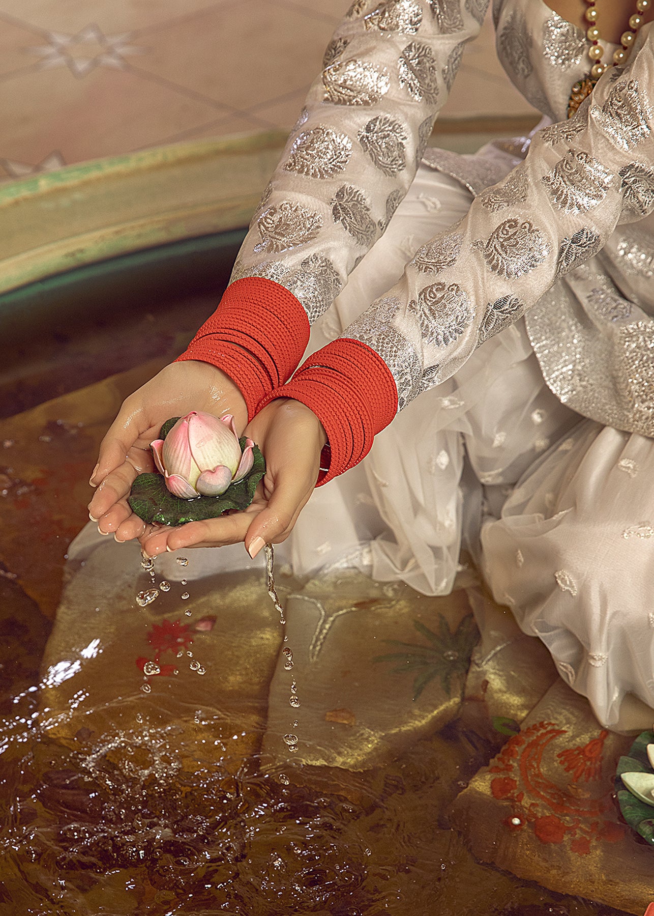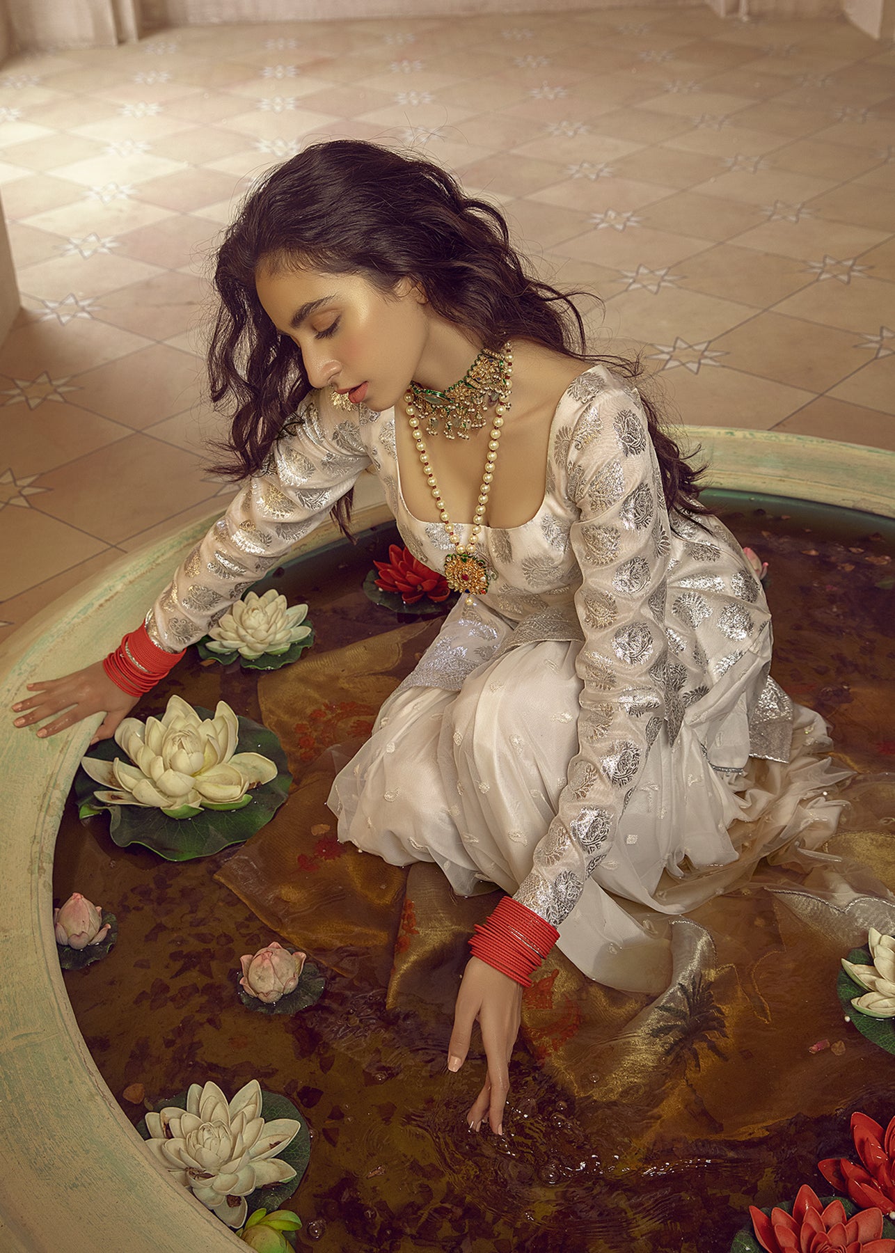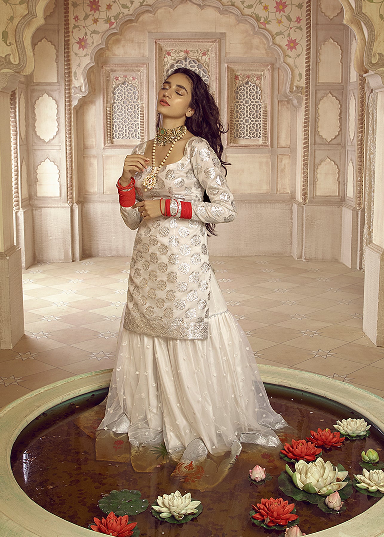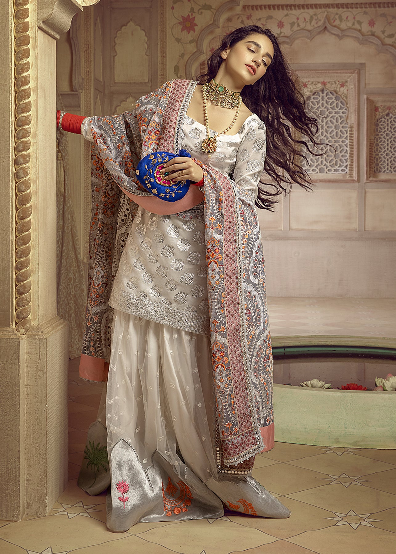 A gorgeous organza shirt with zari work is paired up with an embroidered net ghrara which is enhanced with tissue details and embroidered motifs. The heavily embroidered organza dupatta is a beautful grey shade is the star of the show.