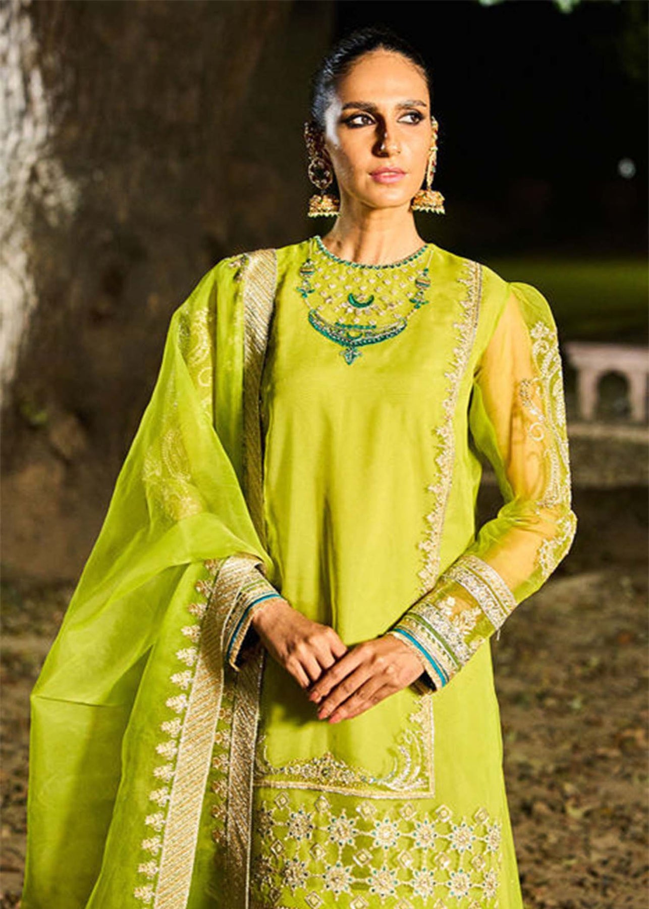 A green organza structured shirt and sharara pants with embroidery and lacework. Paired with a green organza dupatta embroidered with booti all over and on a four-sided border.