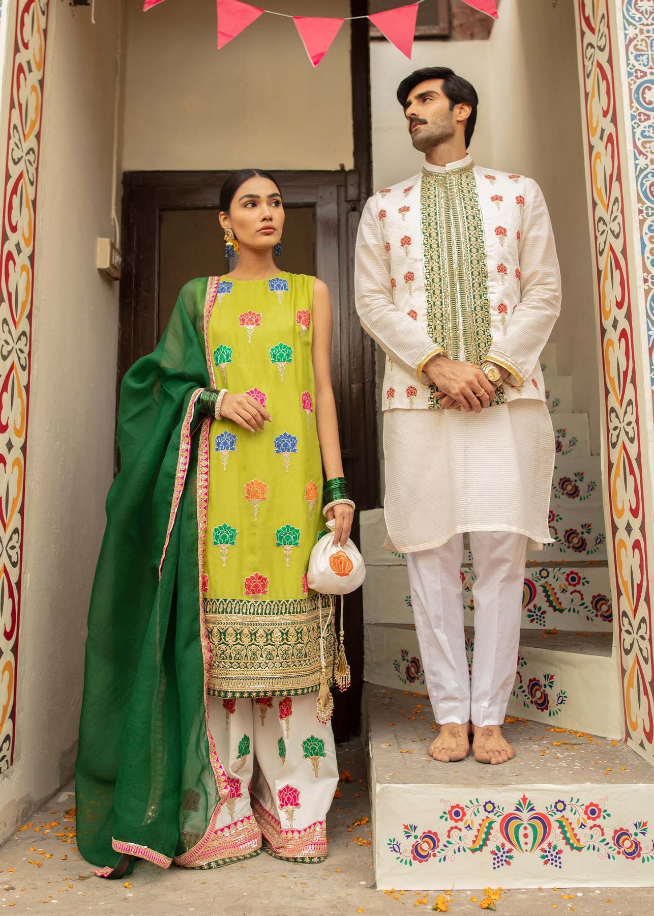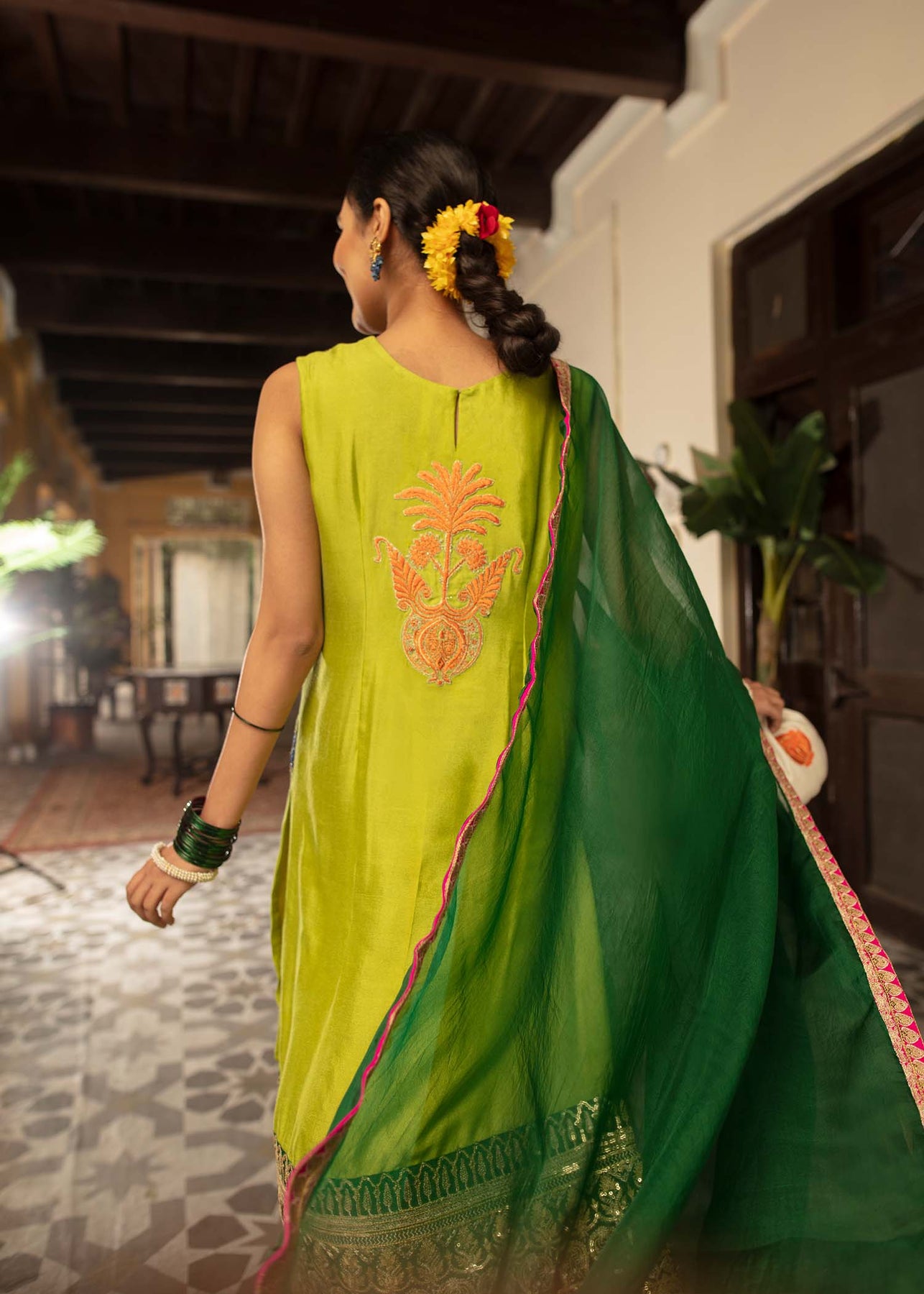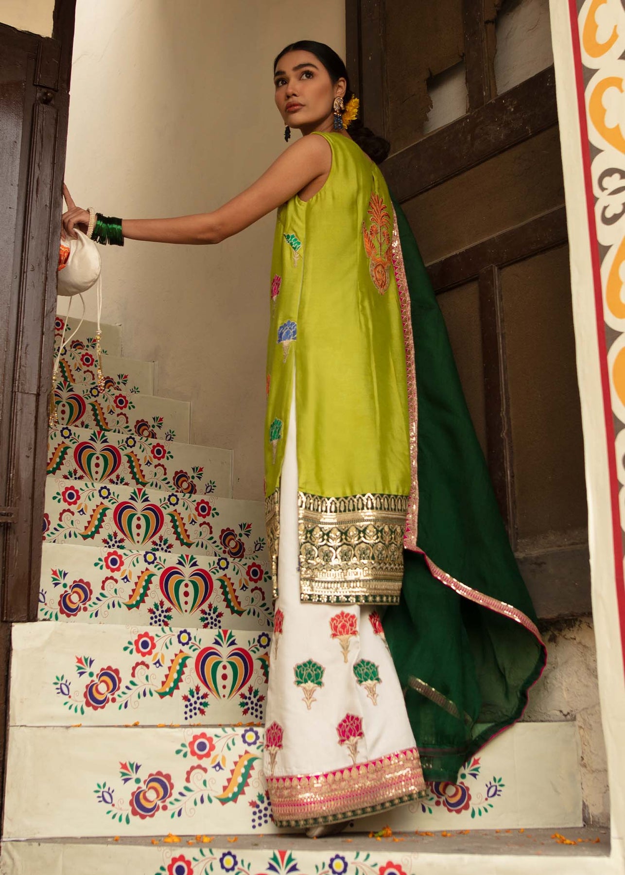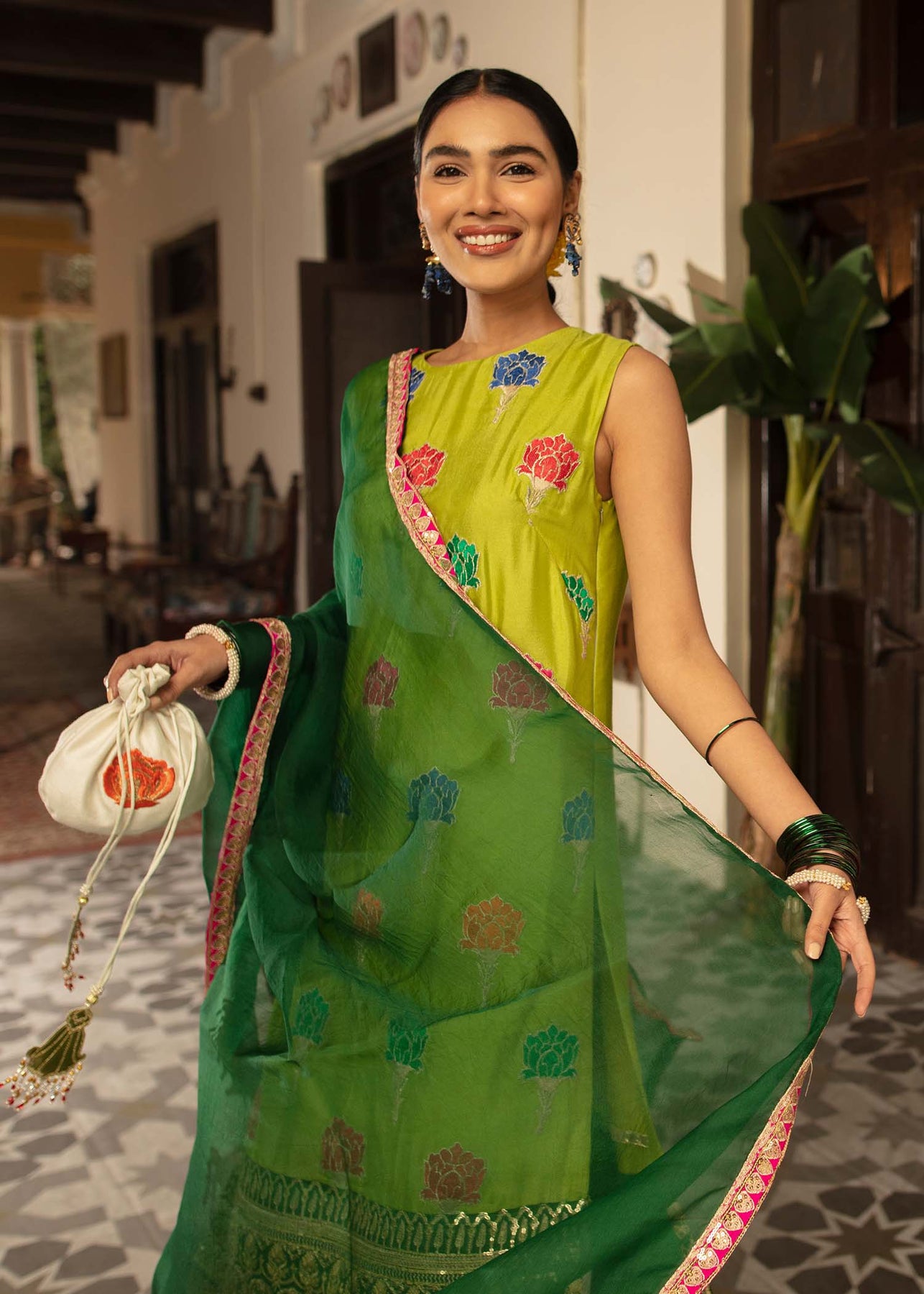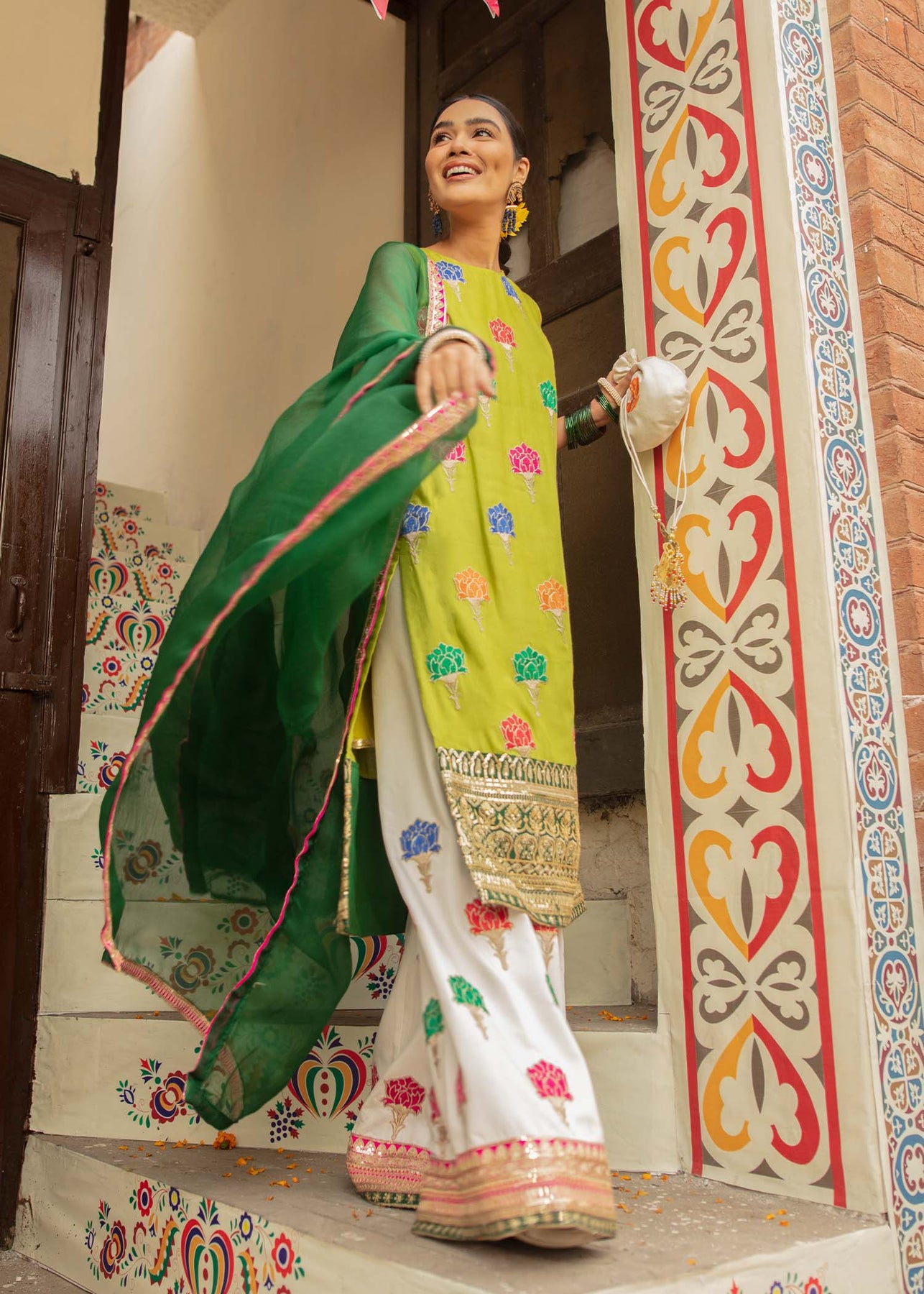 Description: An acid green sleeveless shirt and white culottes in cotton net are incrusted with embroidered roses in lovely contrasting colours. The borders are embroidered with tilla and sequins work and is paired up with a bottle green organza dupata.