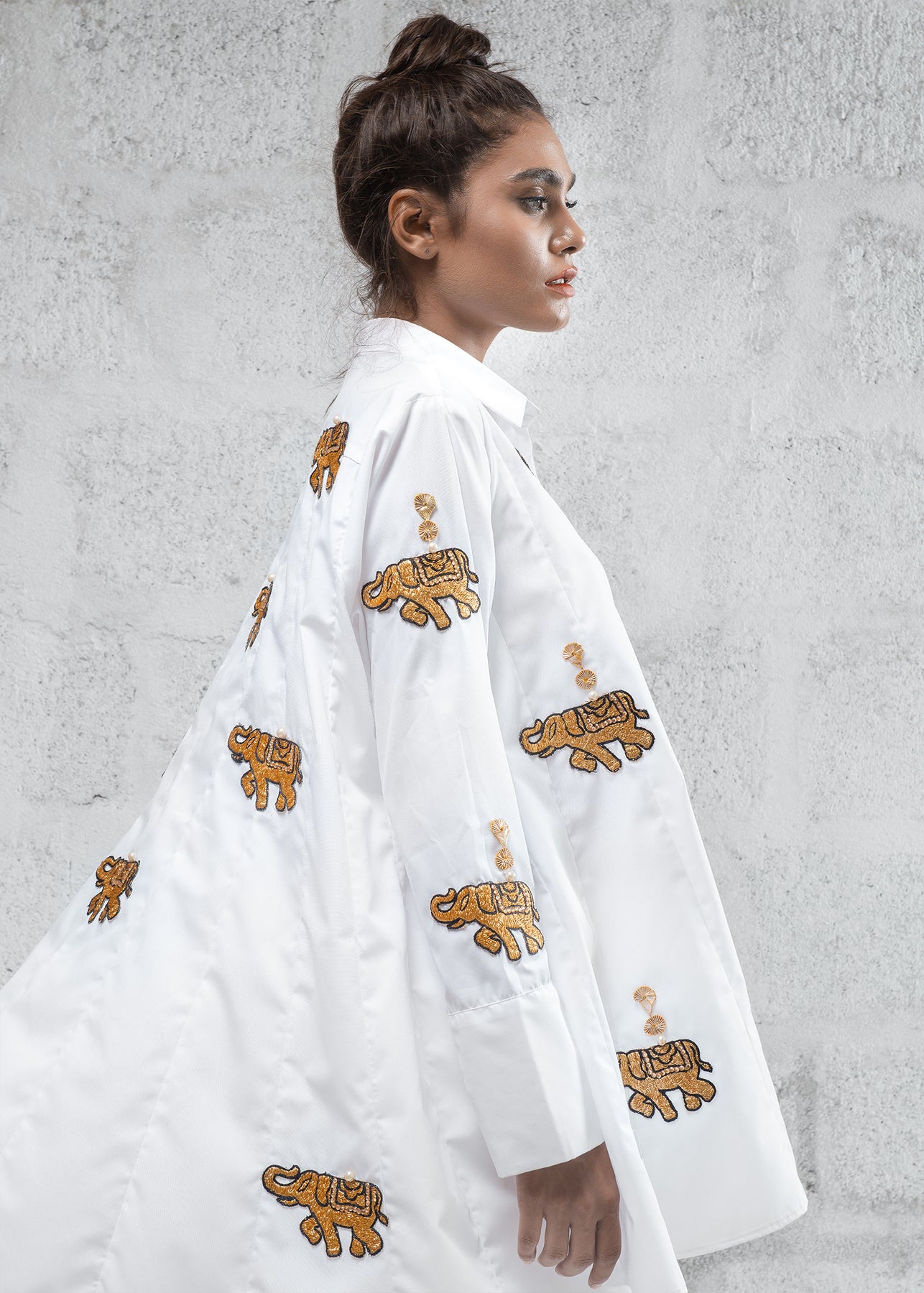 Flory cotton button down with traditional handwork on elephant motifs, gota finishing and pearls