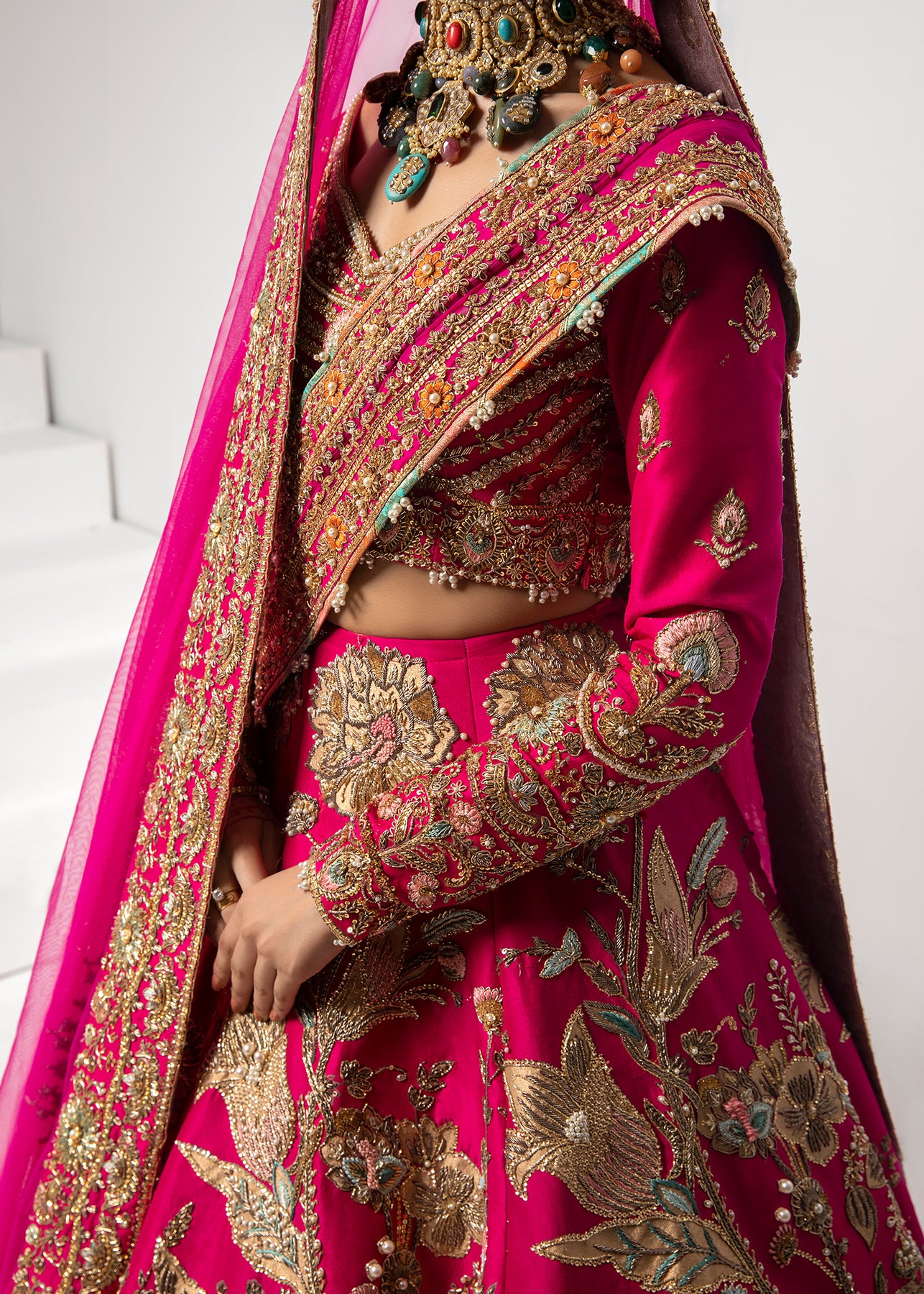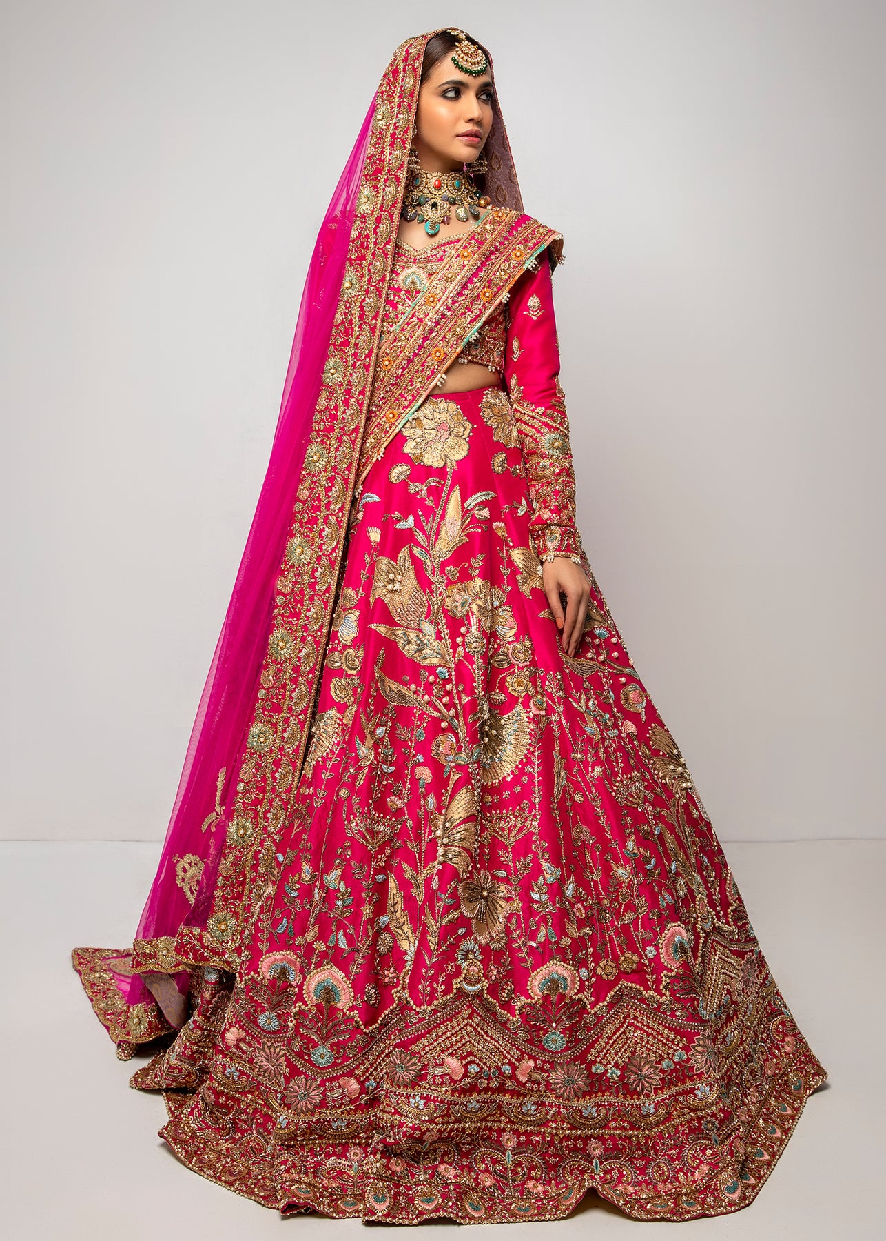 A pure raw silk base in Hot pink serves as a canvas to meticulously handcrafted floral motifs of sitara, naqshi and pearls. The lehanga and choli is paired up with two dupattas; one net dupatta and the other is in chiffon mukesh.
