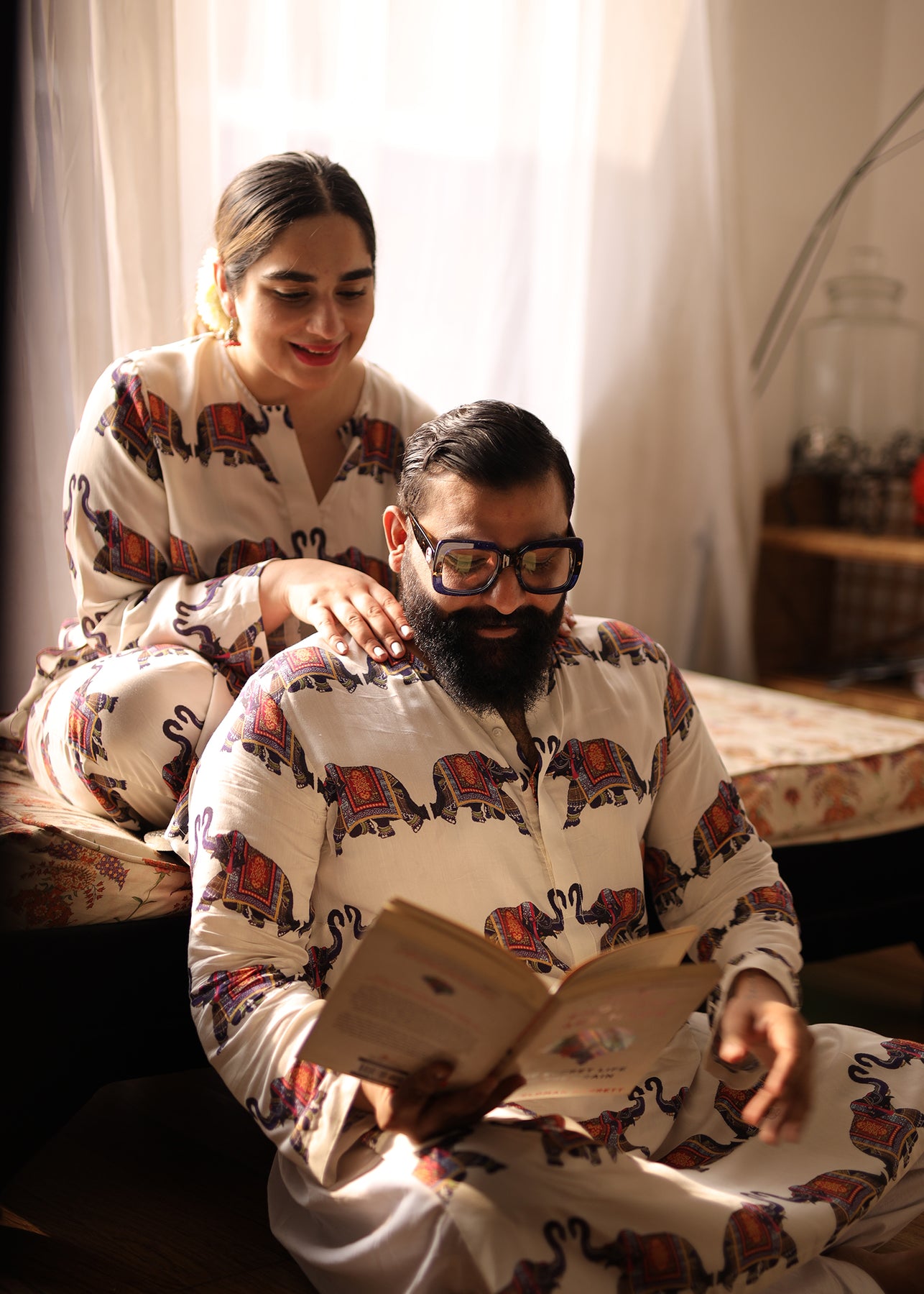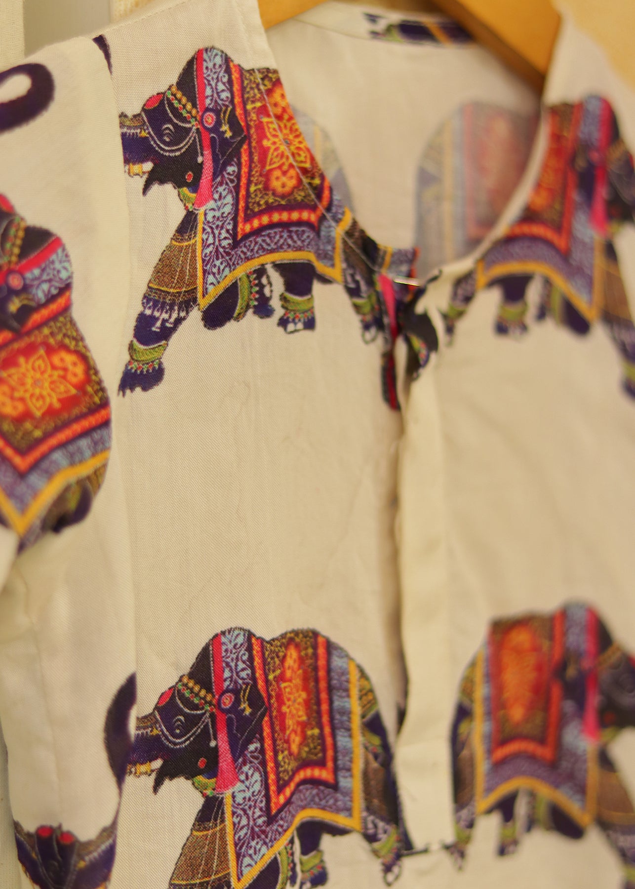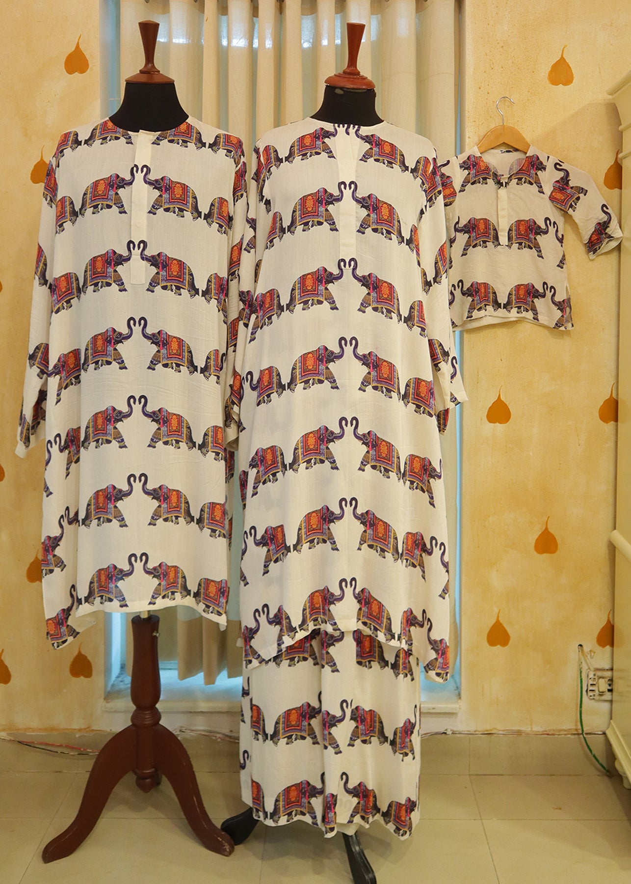 A super quirky, easy breezy, white tunic is made out of linen to keep you comfortable while chilling out. It is hand-rendered with our ever-interesting signature elephants. This piece is paired up with a luscious black shalwar.
