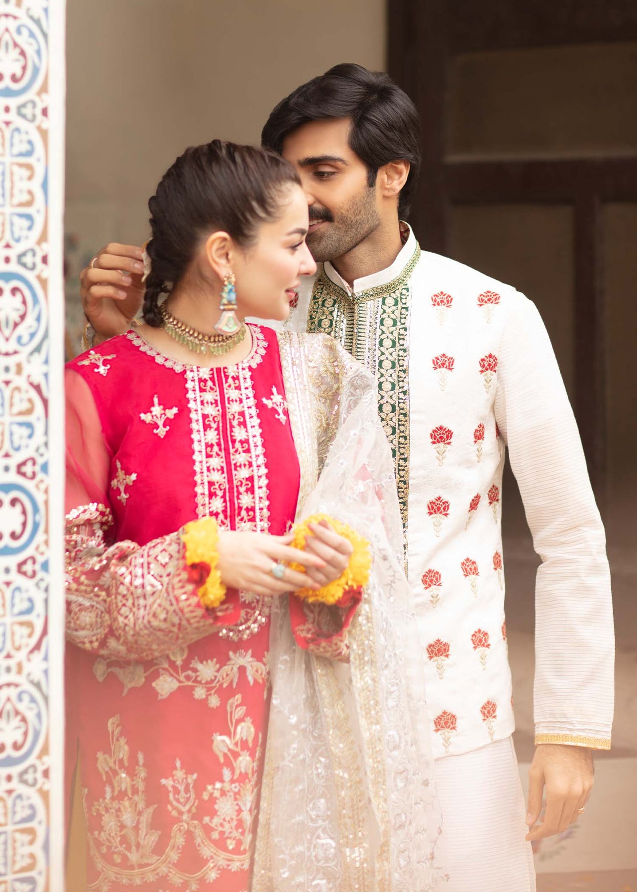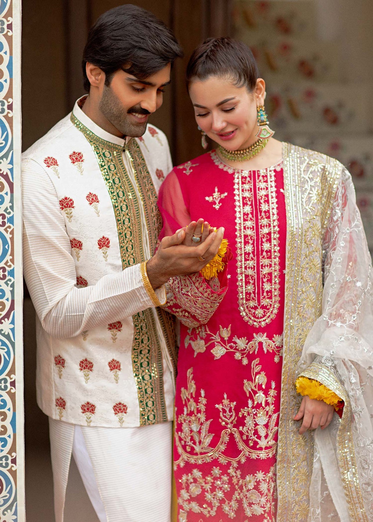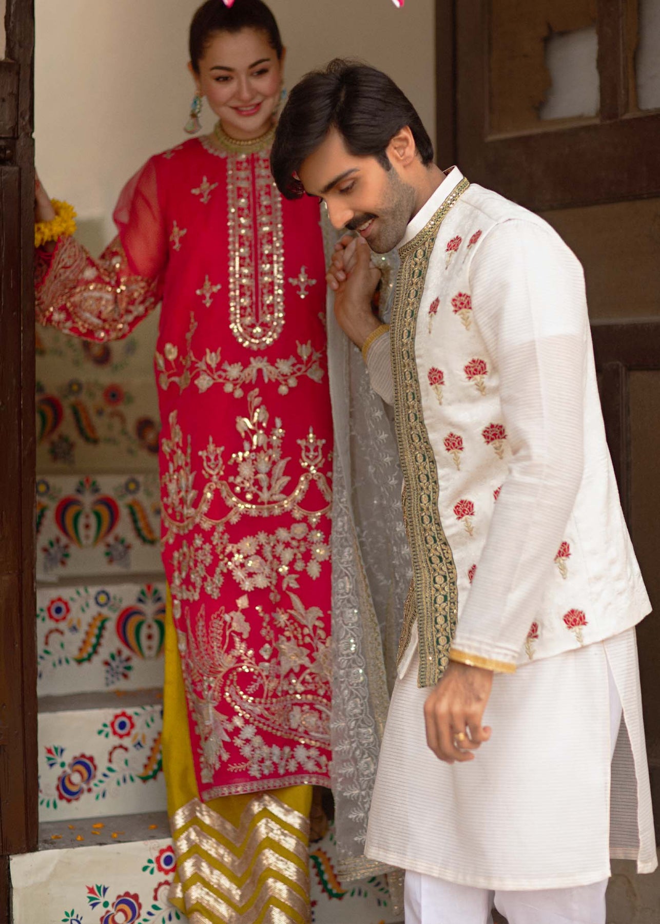 Description: A white cotton silk waistcoat with embroidered florals has gorgeous borders enhanced with sequins work. It is paired up with a luscious white cotton shirt and trousers.