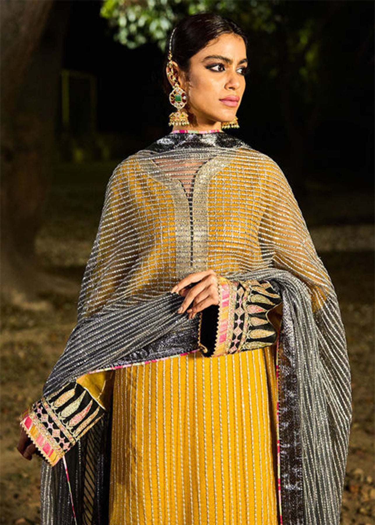 A mustard yellow organza shirt with a sequin-embroidered neckline and border. Paired with black block-printed azaar pants and a contrasting grey net dupatta with sequin embroidery.
