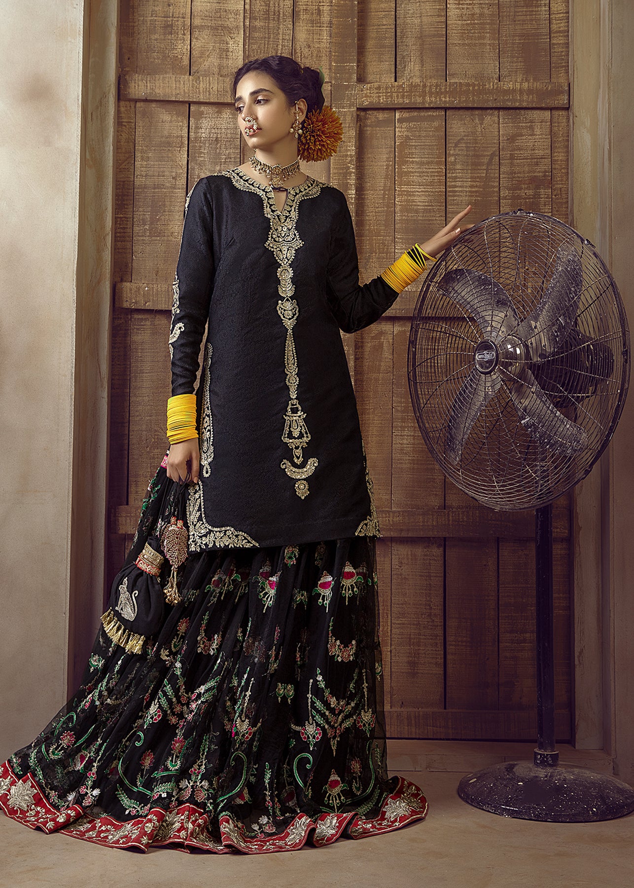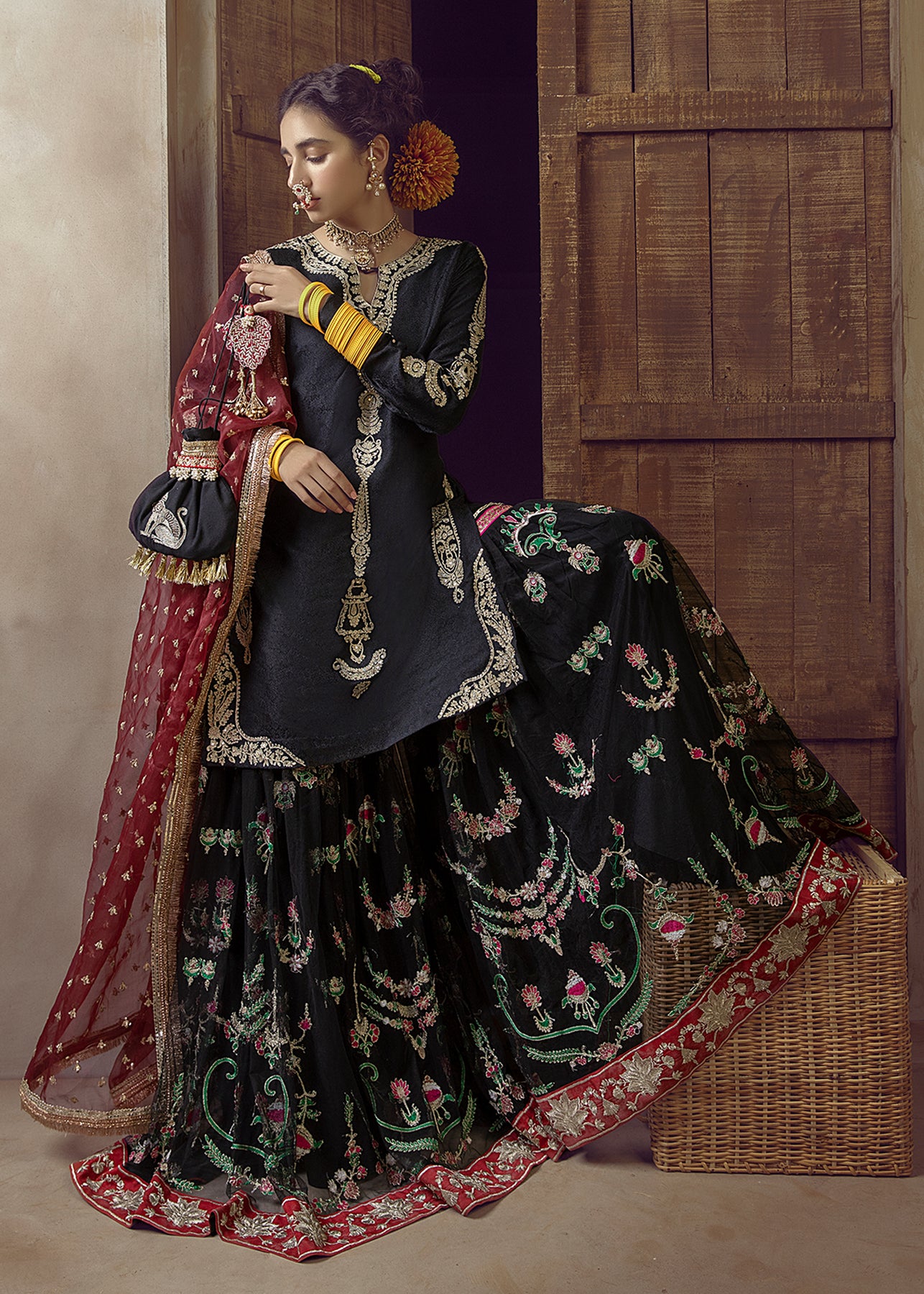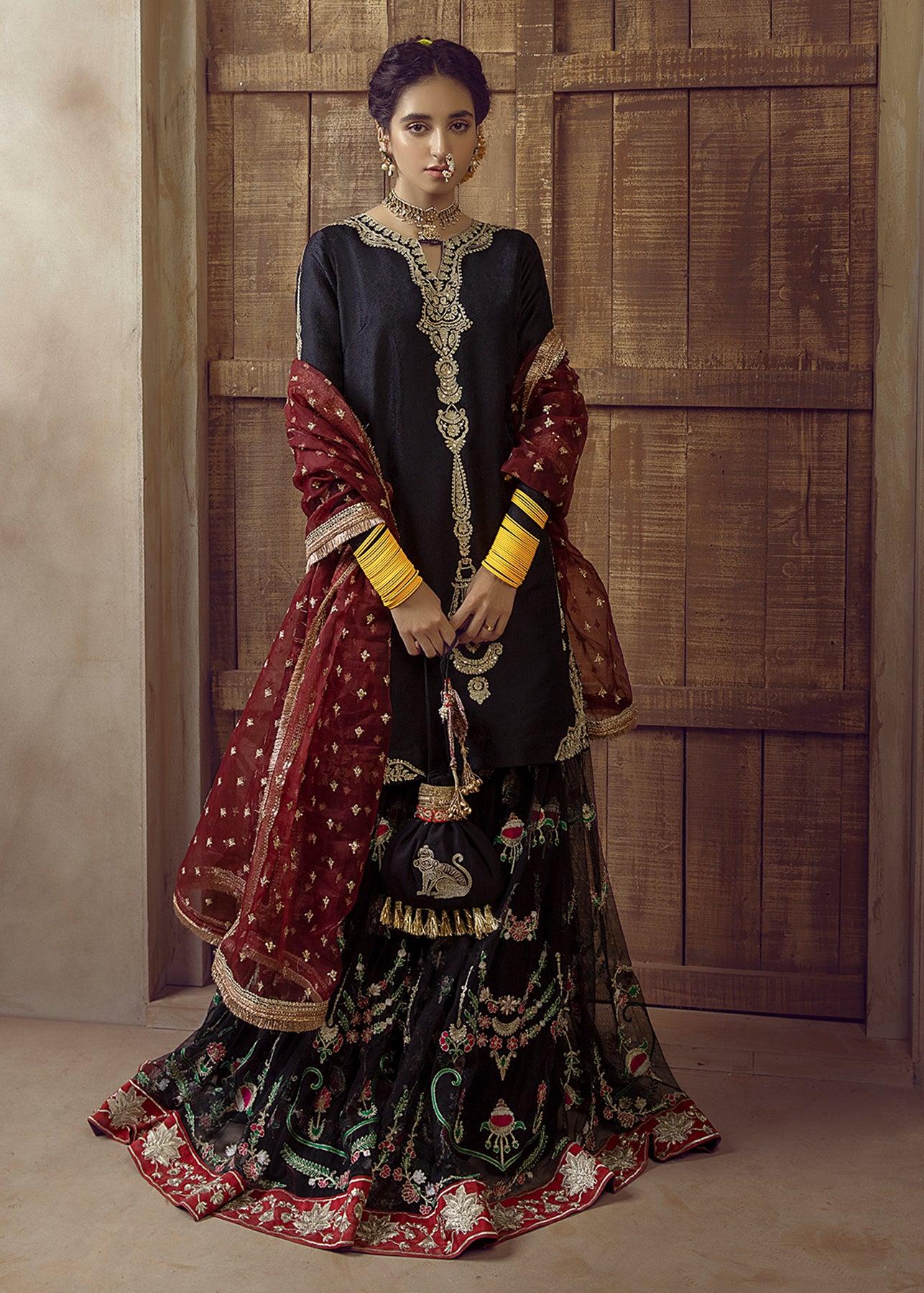 A gorgeous black, self jamawar shirt with aari embroidery and sitara work is paired up with a flaired net embroidered ghrara and an organza dupatta in deep maroon color.