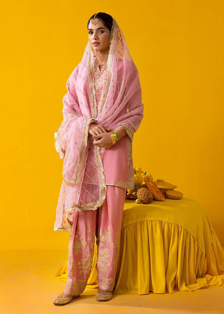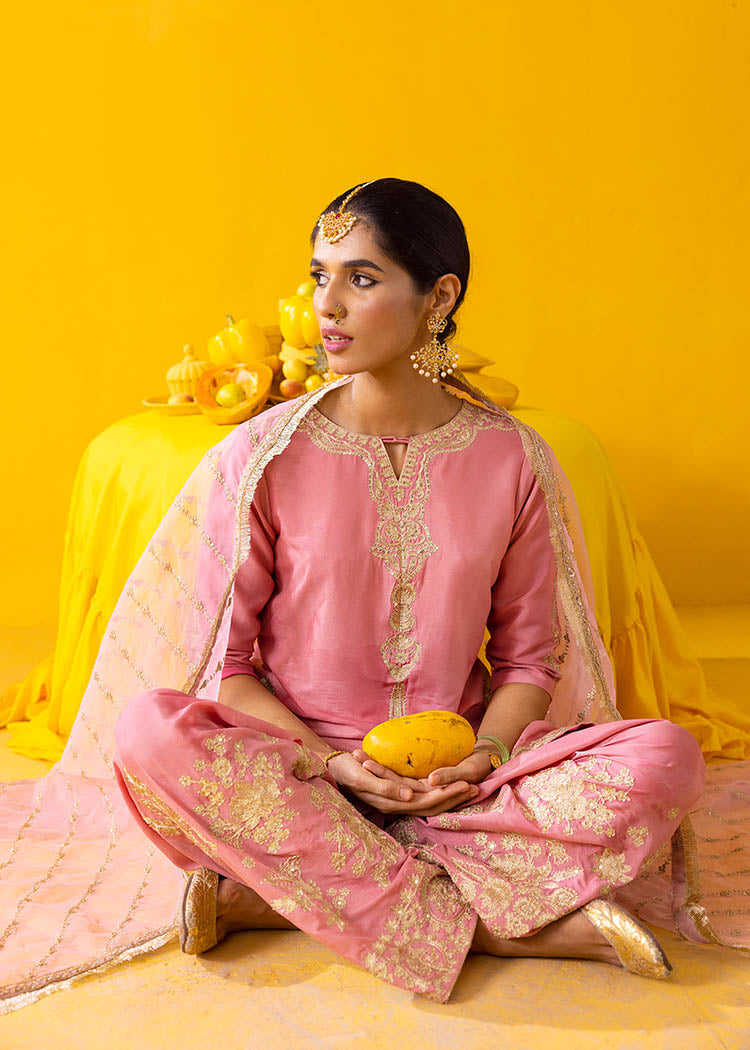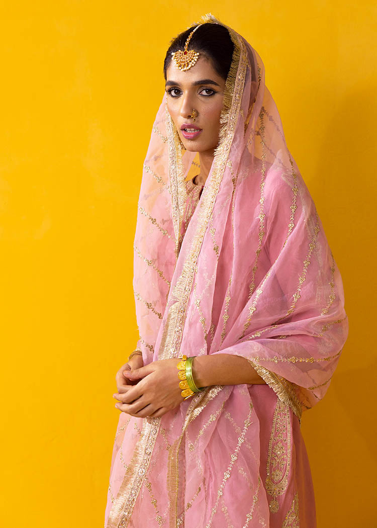 A traditional tea pink shalwar kameez in silk is adorned with intricate aari work and sitara. It is paired up with an organza dupatta with diagonal zari lines and is framed with a kiran border.