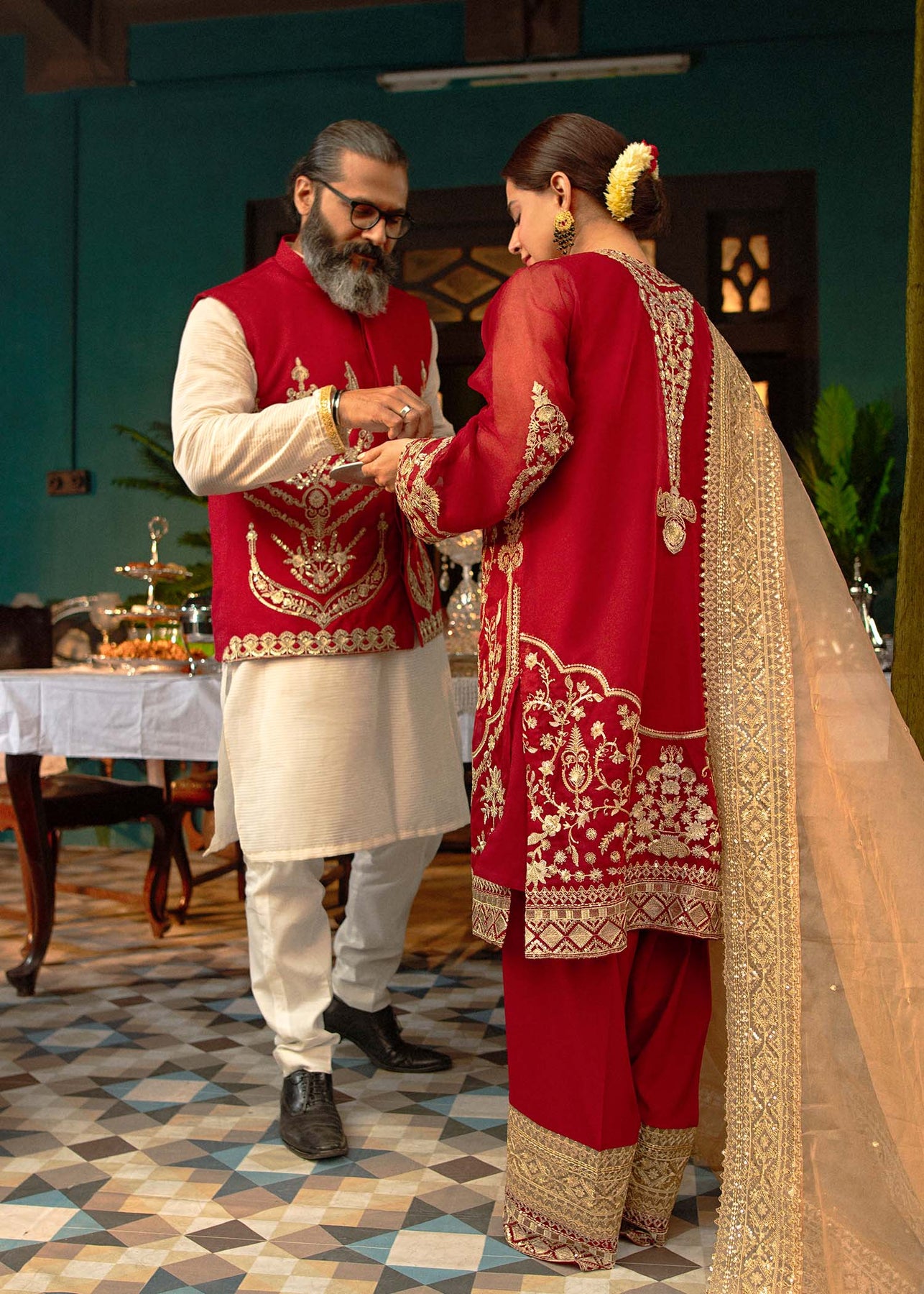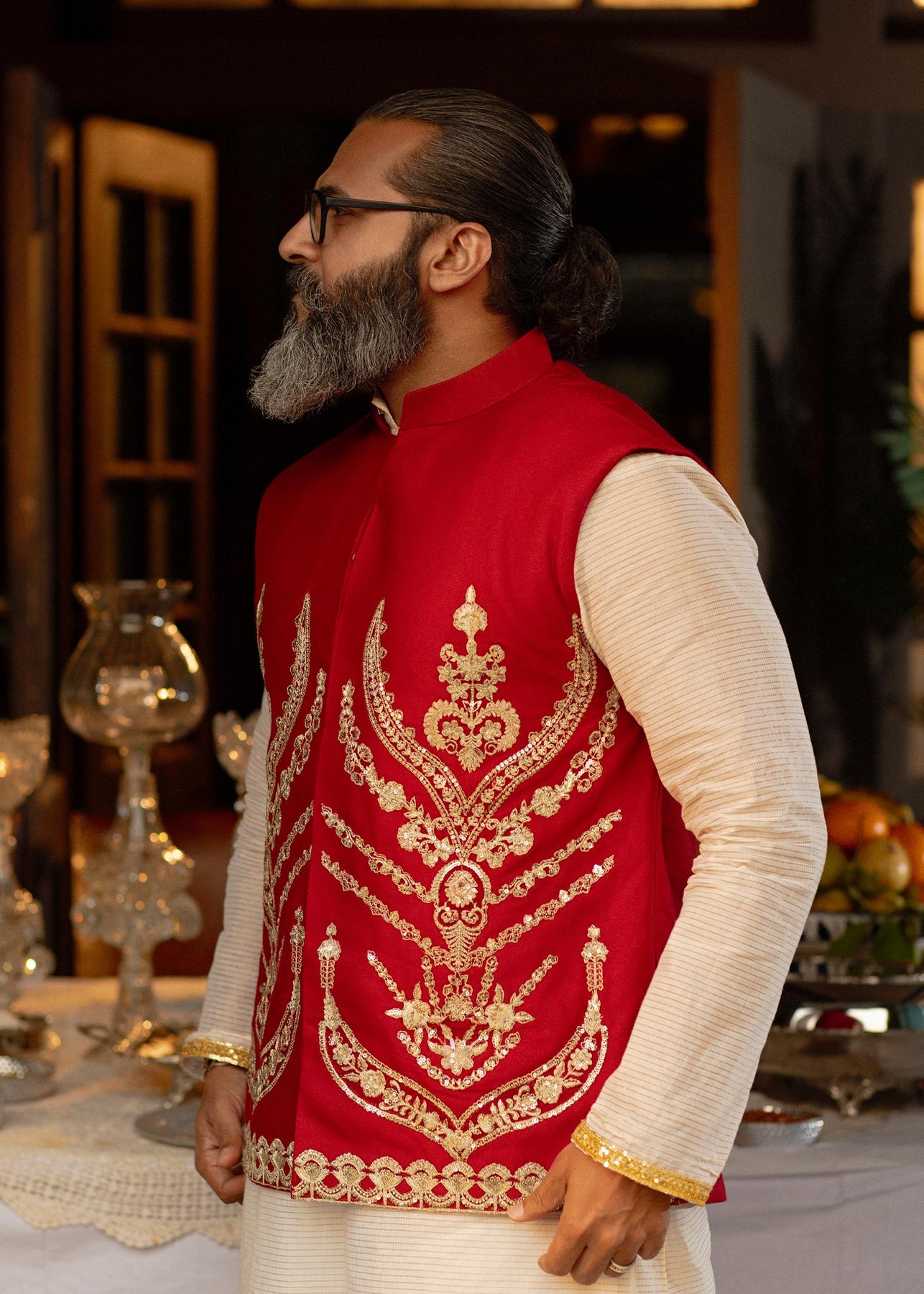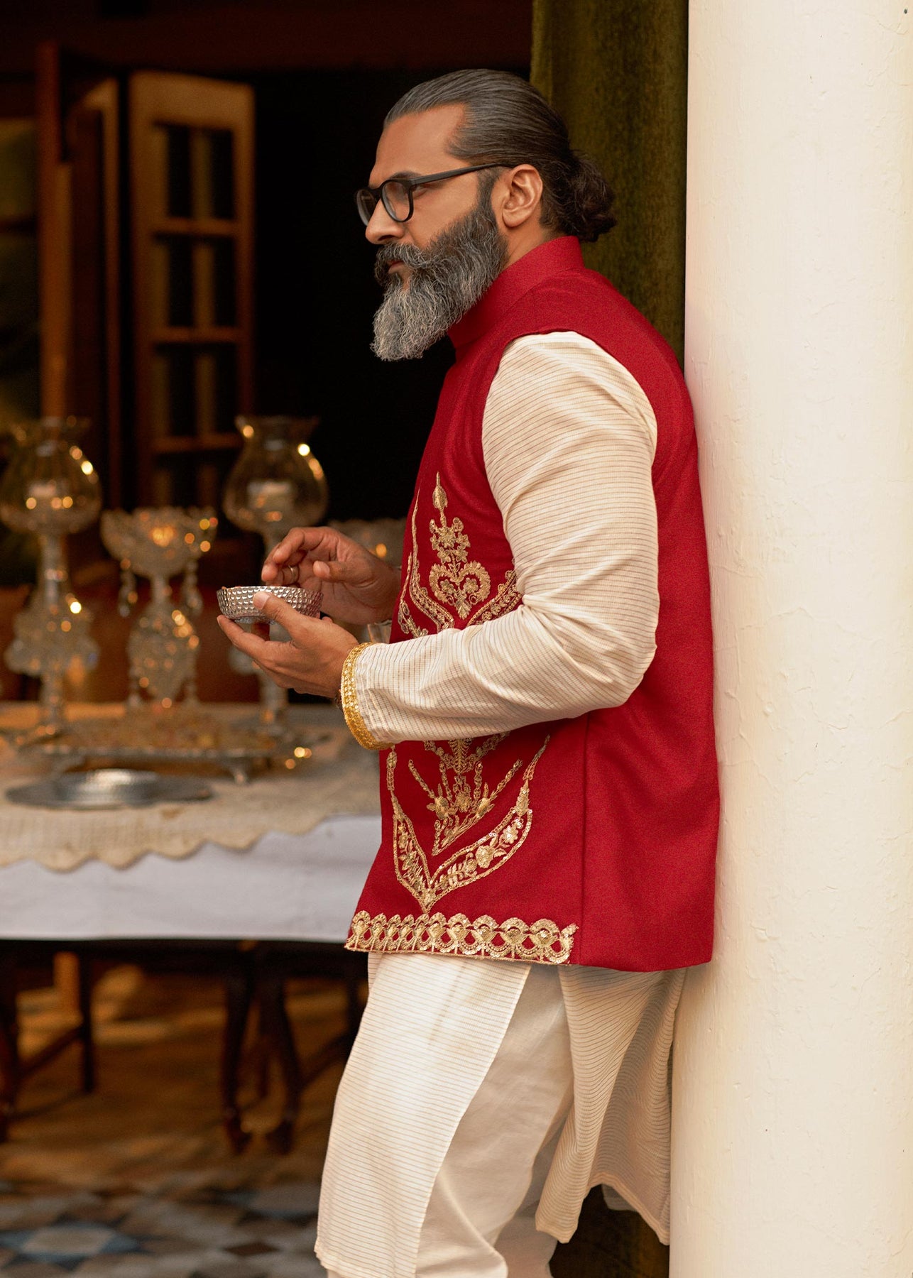 Description: A maroon cotton net waistcoat with tilla embroidery is enhanced with sequins work. It is paired up with a white cotton shirt with mustard finishing on the neck and sleeves and trousers.