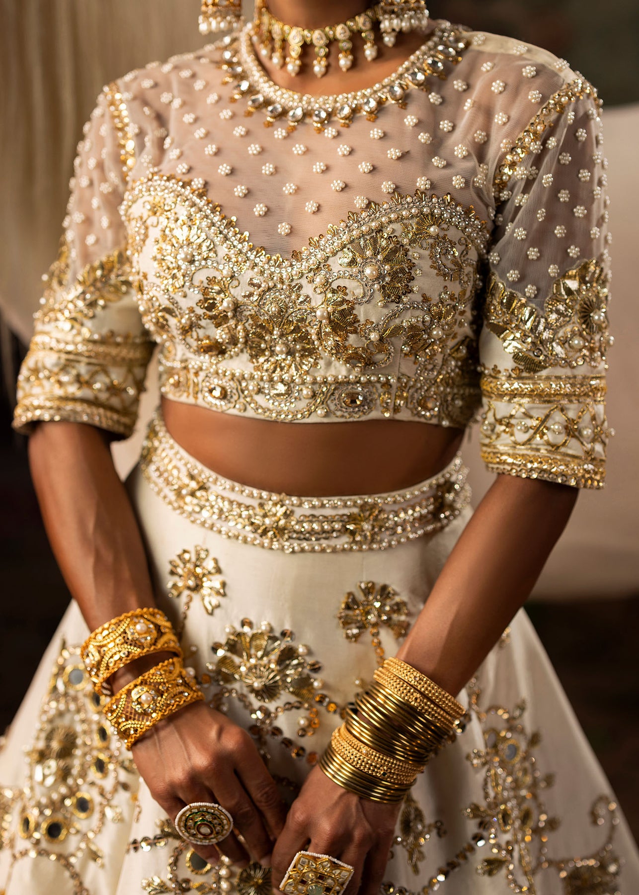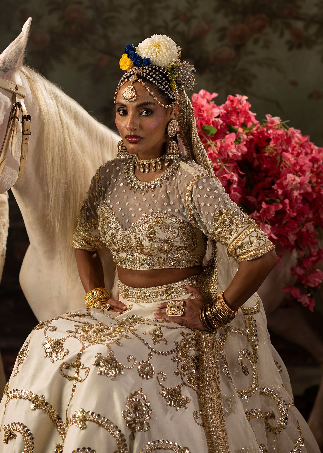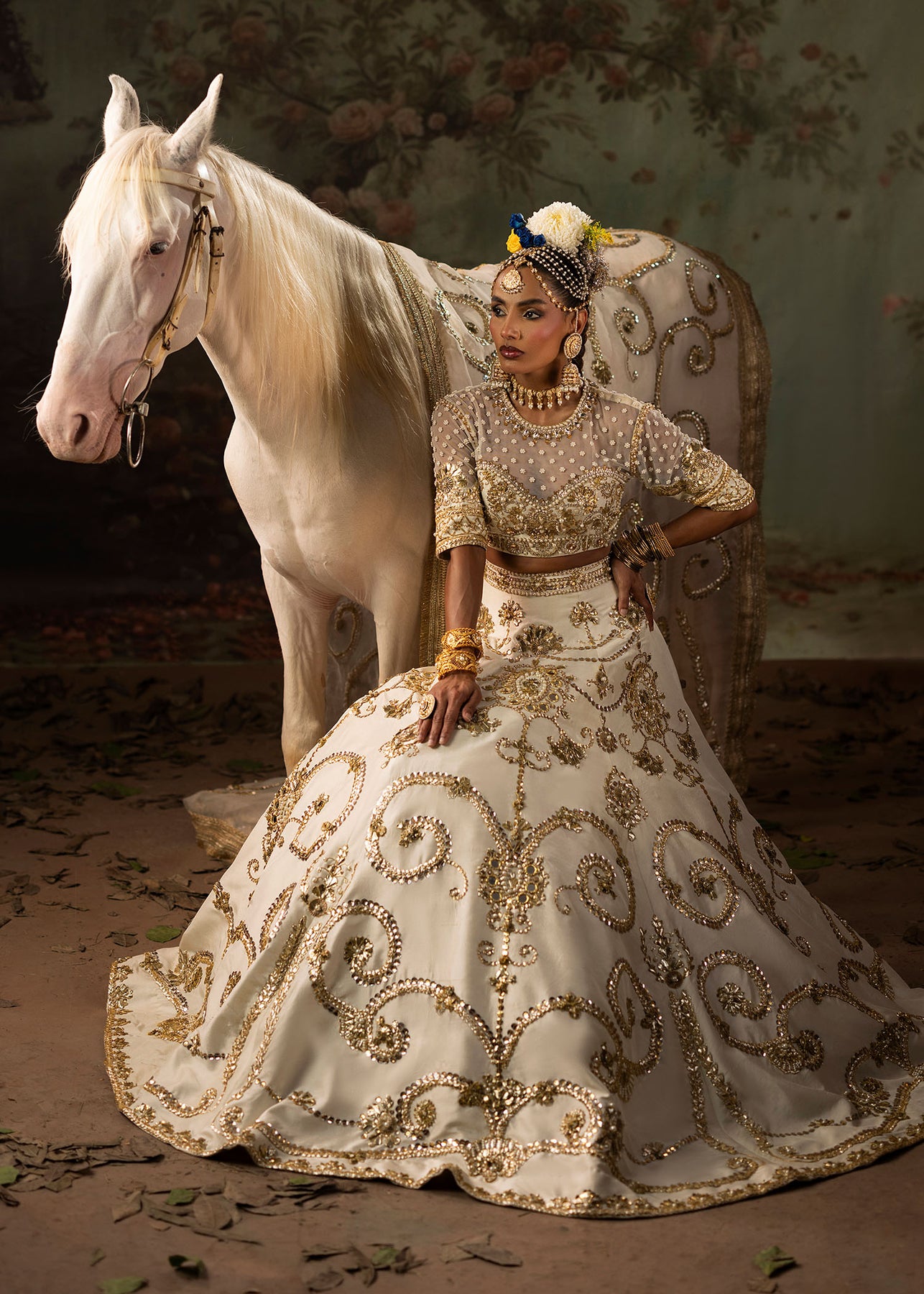 A pristine white raw silk lehenga choli with Classic gota and mirror embellishments delicately paired with pearls for a soft yet regal finish. It consists of a gracefully structured lehenga with a refined choli, embodying timeless elegance. Dupatta is of sheer organza material, richly adorned with gota detailing, completing the look with sophistication and old school charm.