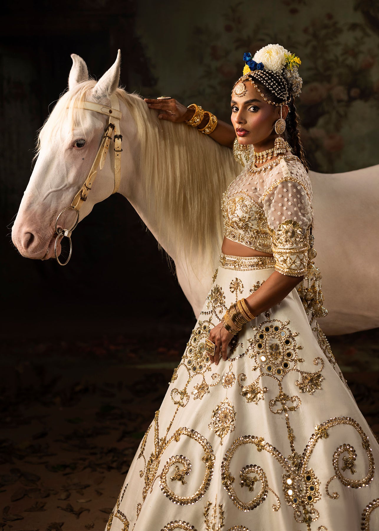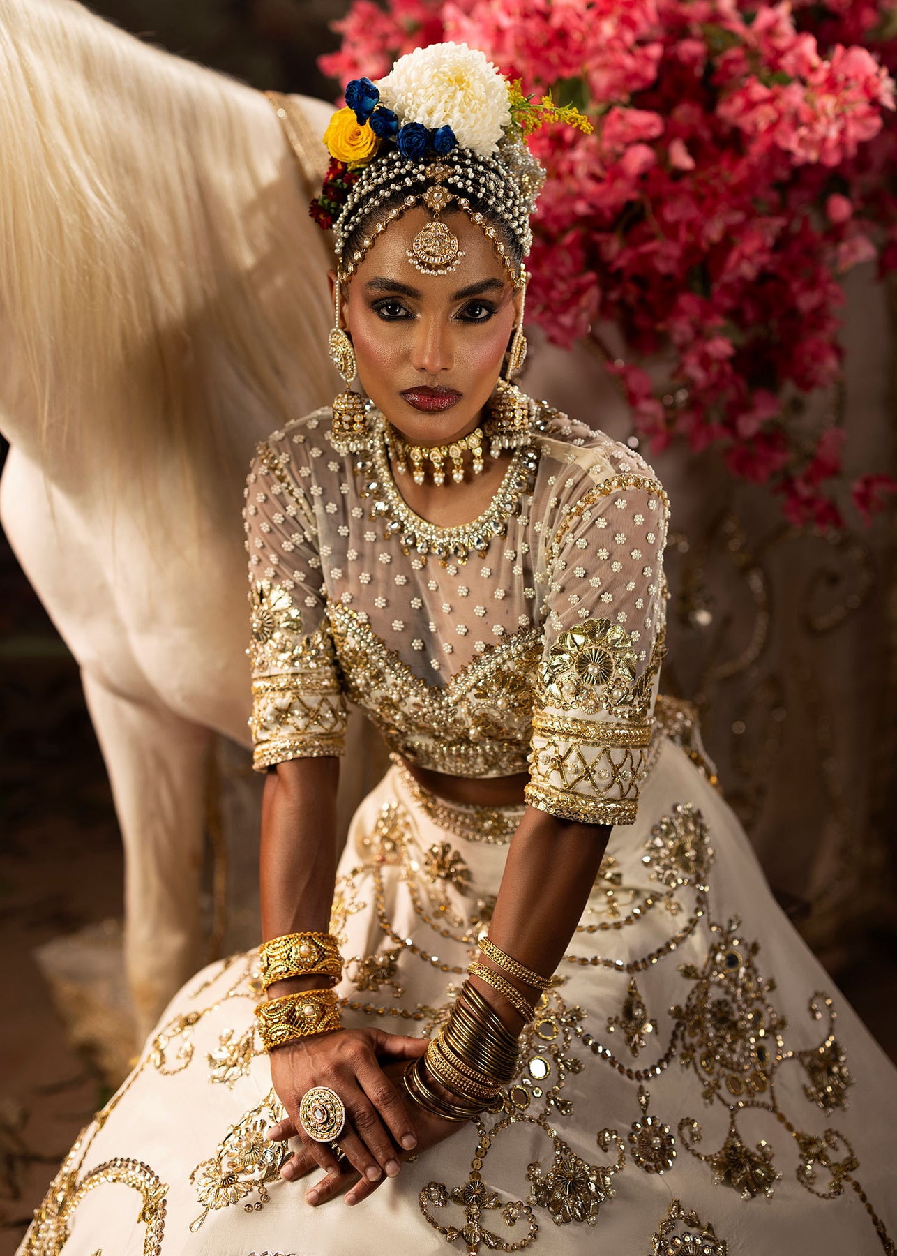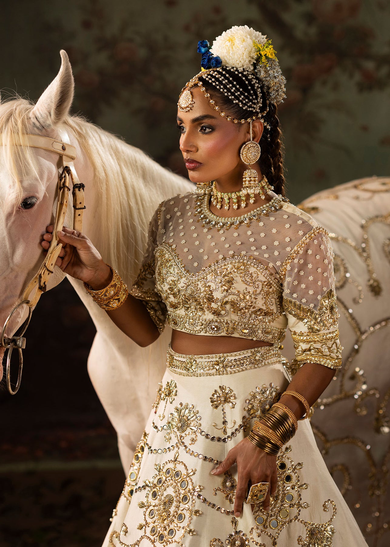 A pristine white raw silk lehenga choli with Classic gota and mirror embellishments delicately paired with pearls for a soft yet regal finish. It consists of a gracefully structured lehenga with a refined choli, embodying timeless elegance. Dupatta is of sheer organza material, richly adorned with gota detailing, completing the look with sophistication and old school charm.