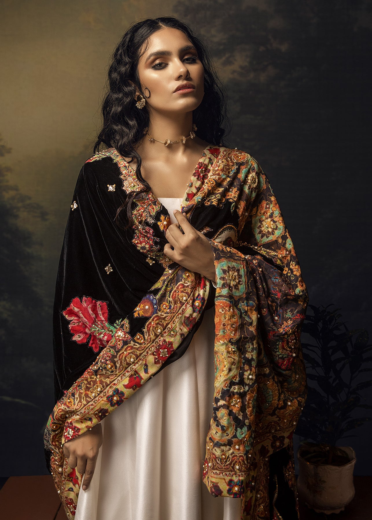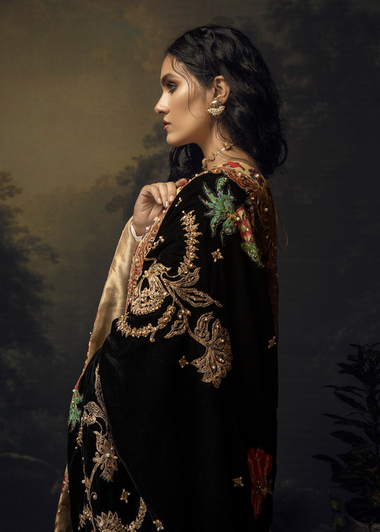 A luscious ivory pishwas in pure raw silk has intricate lorex embroidery on the sleeves. It is paired up with a black velvet shawl with botanical inspired pitta embroidered motifs enhnaced with pearls and sequins.