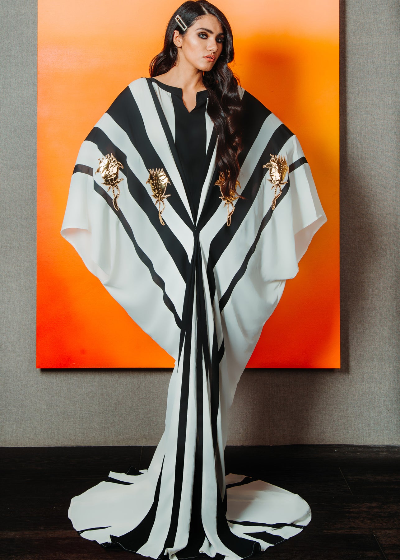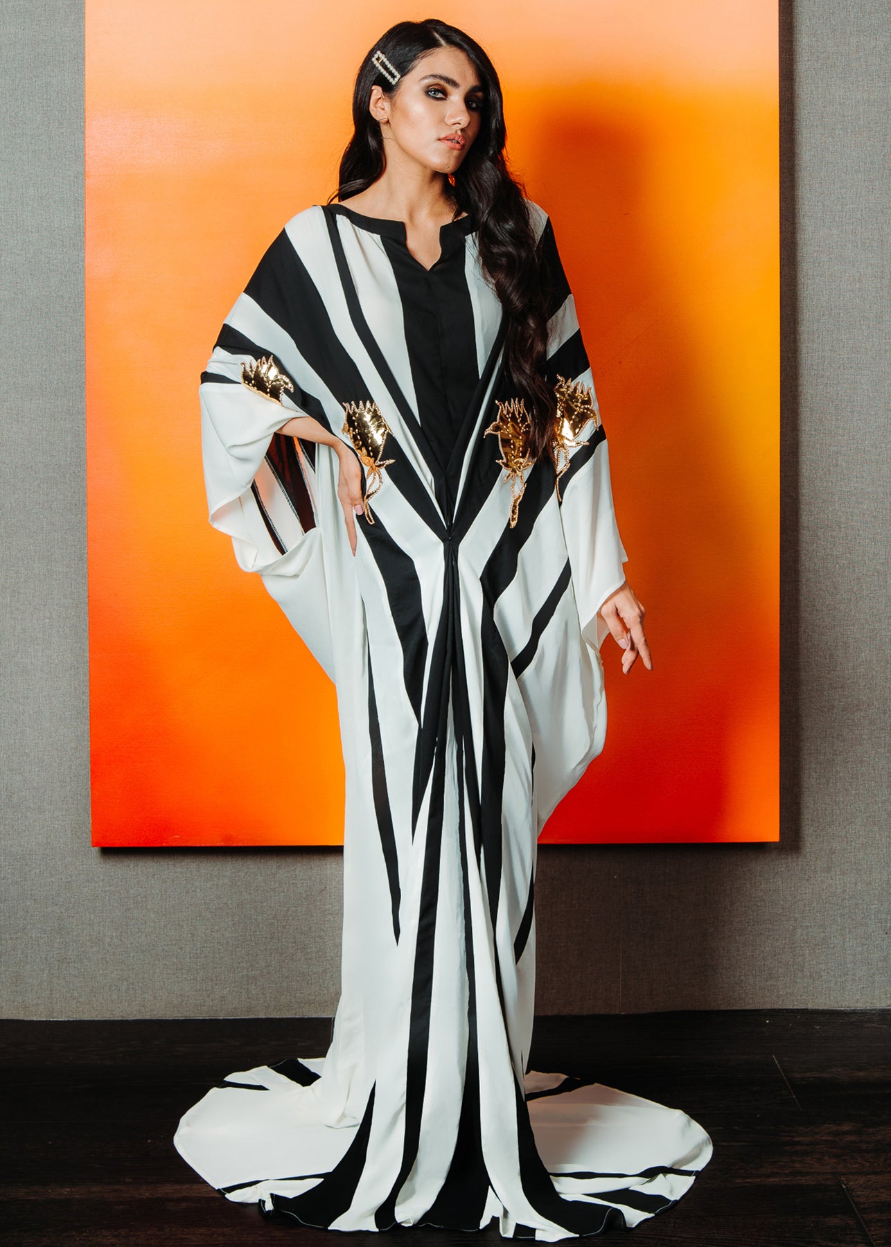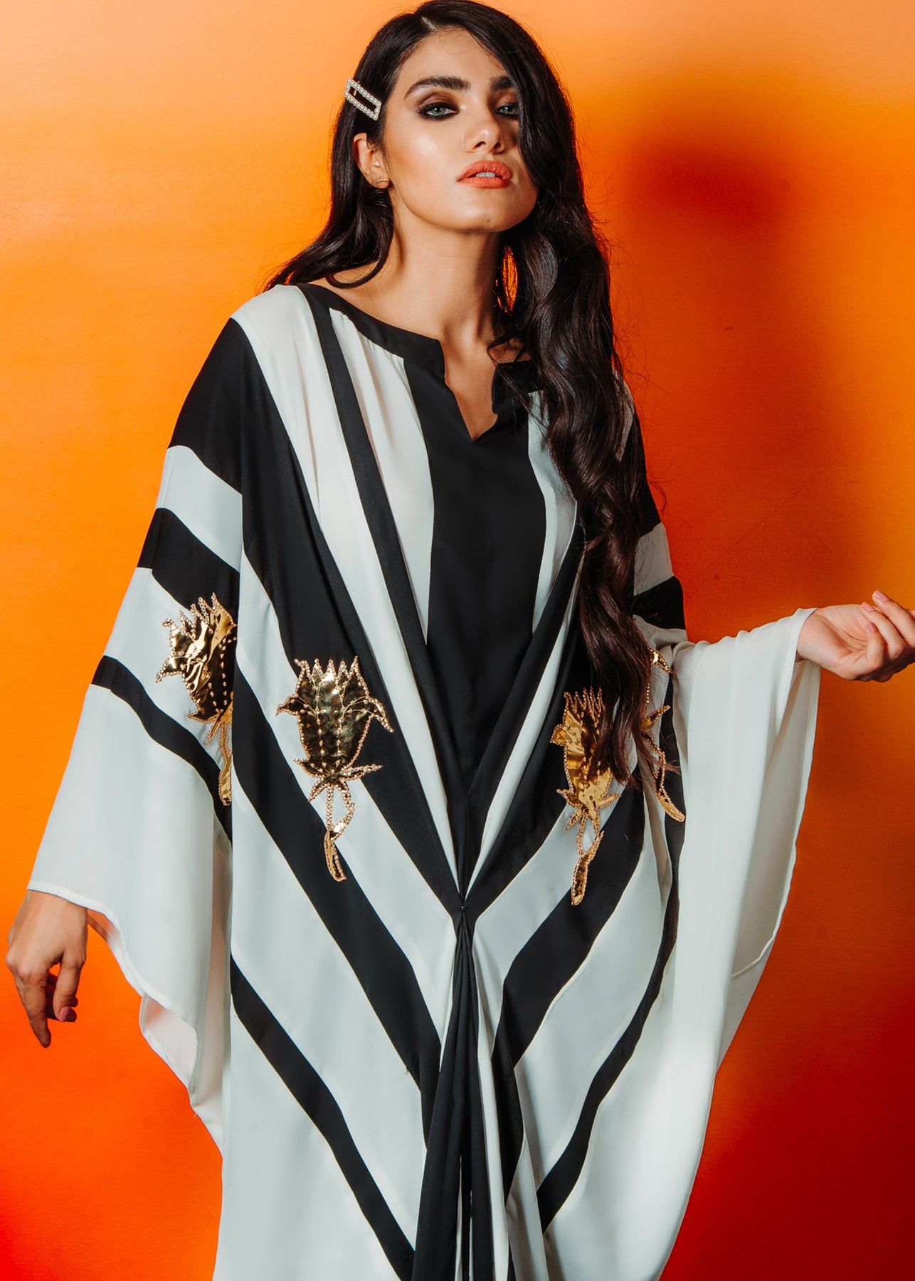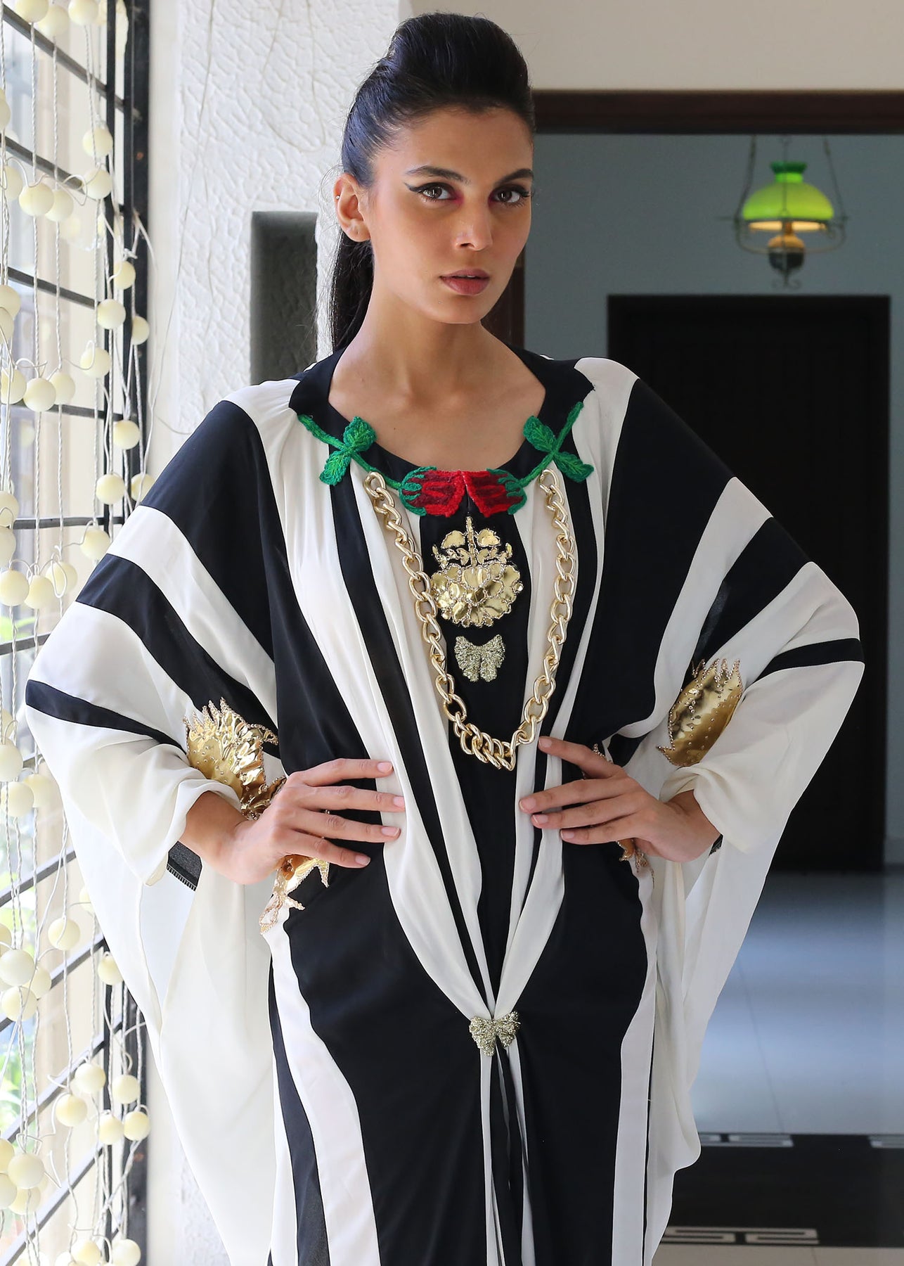 Floor length black and white pure georgette kaftan with good leather motifs finished with sequins work and zari details..
