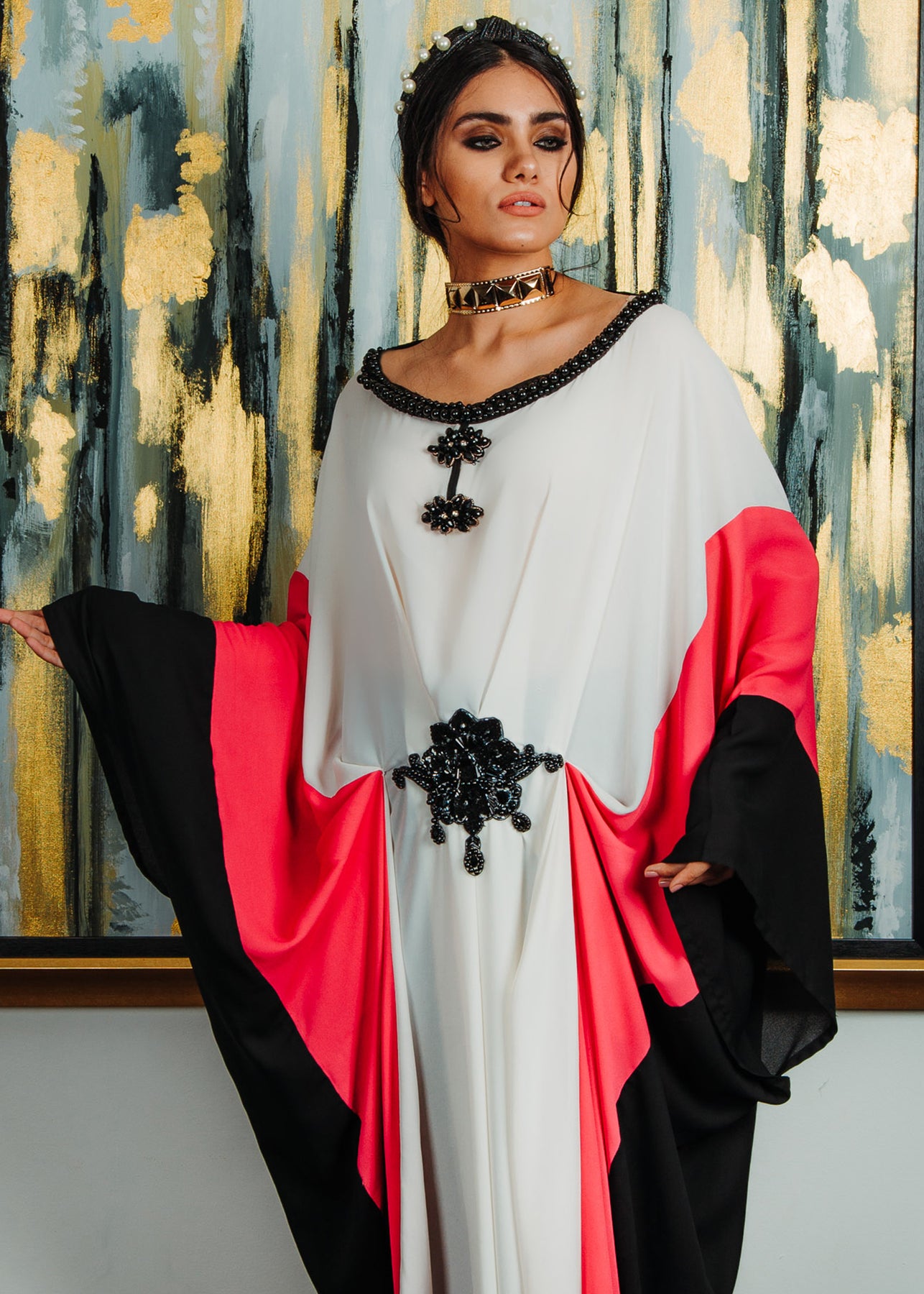 Colour blocked contemporary pure georgette kaftan. Neckline finished with black beadwork. Heavily black Embellished motif.
