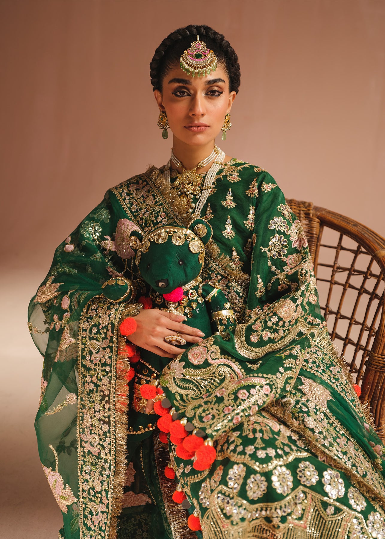 An exquisite emerald green organza shirt and shalwar is adorned with intricate gold tilla, dazzling sequins and panni work. Complementing the ensemble is a lovely green embroidered dupatta with baby pink floral blooming all over dupatta and framed with a border.