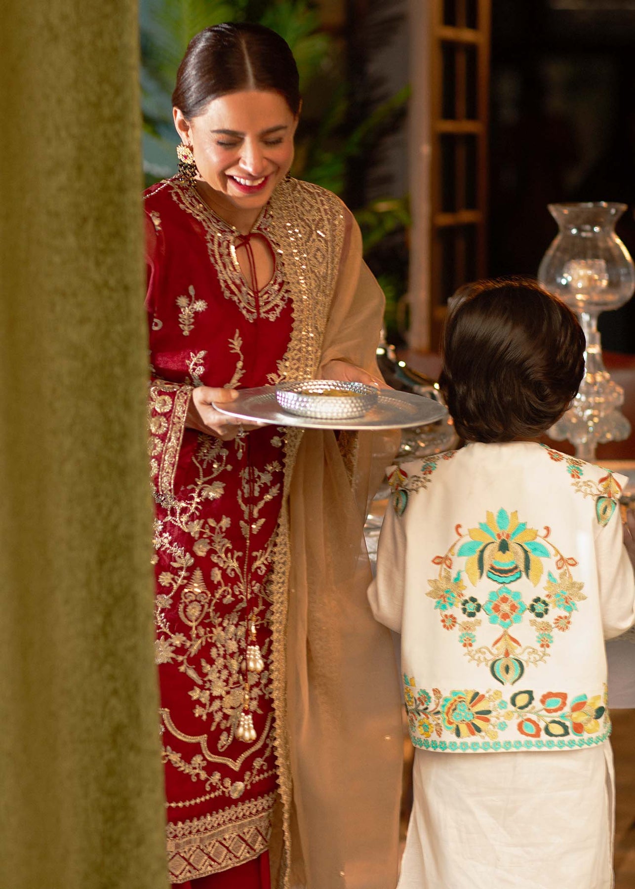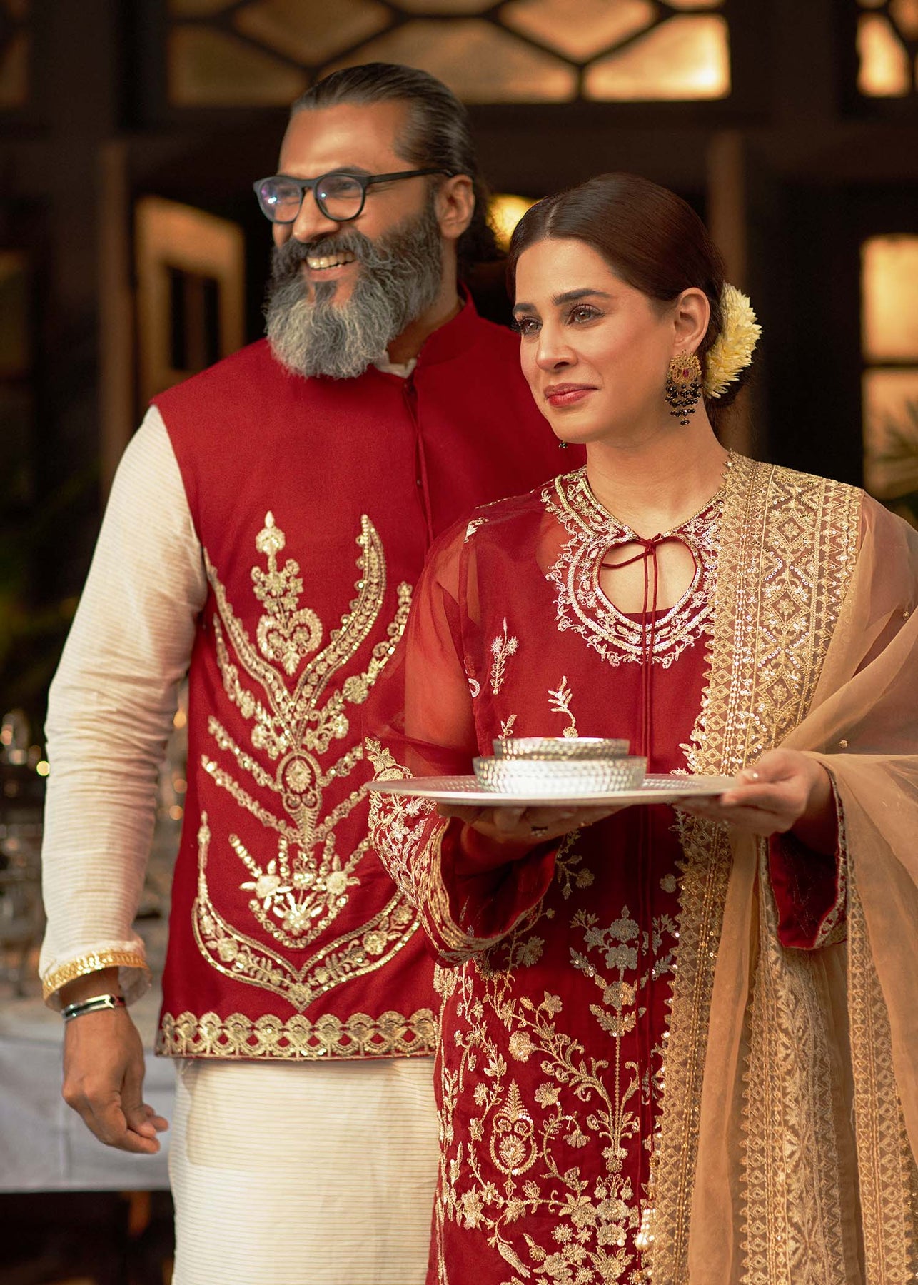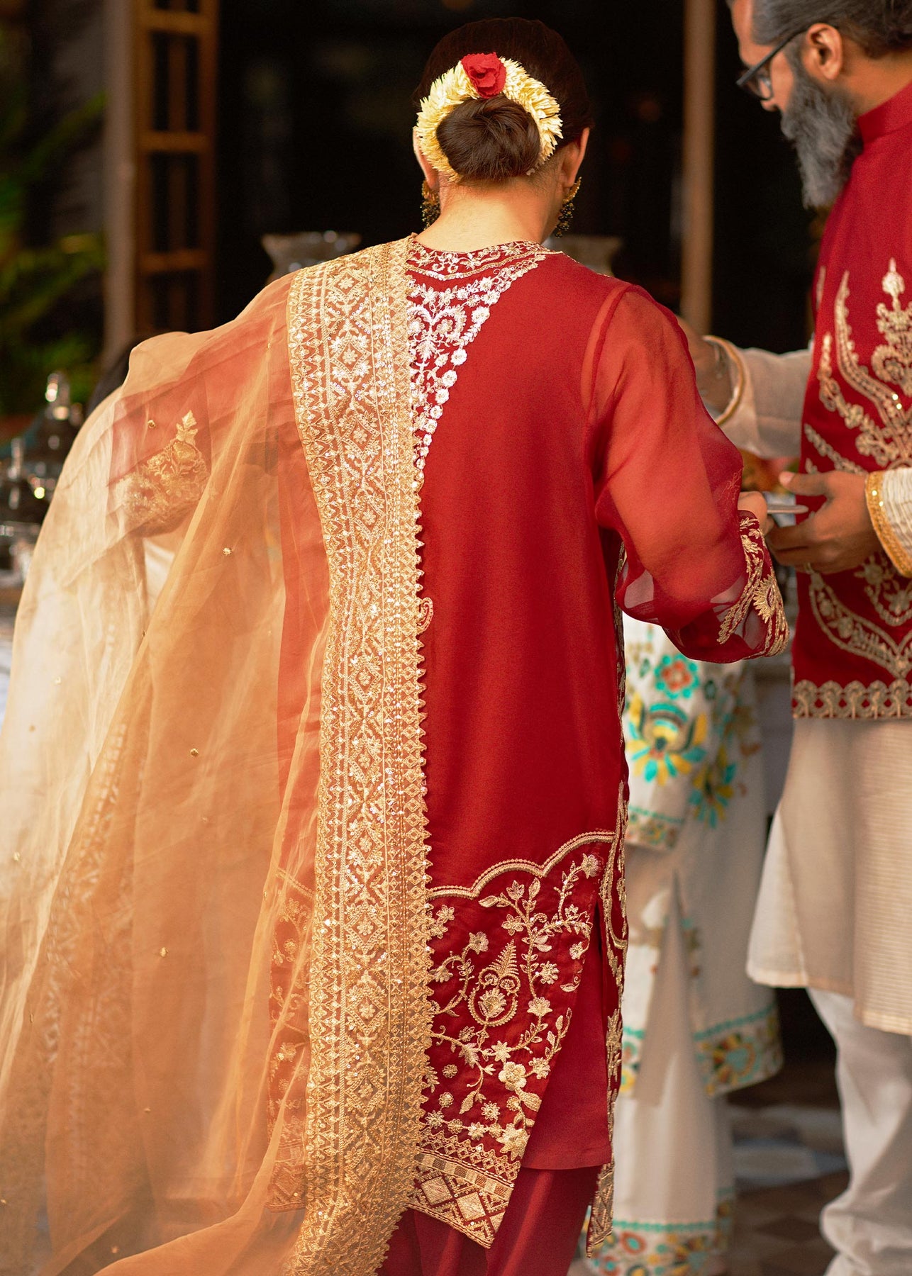Description: A maroon organza shirt has a stunning key-hole neckline with crystal tassels and is adorned with gold tilla embroidery and sequins. It is paired up with a silk shalwar with golden tilla embroidered borders and a gorgeous champagne organza dupatta.