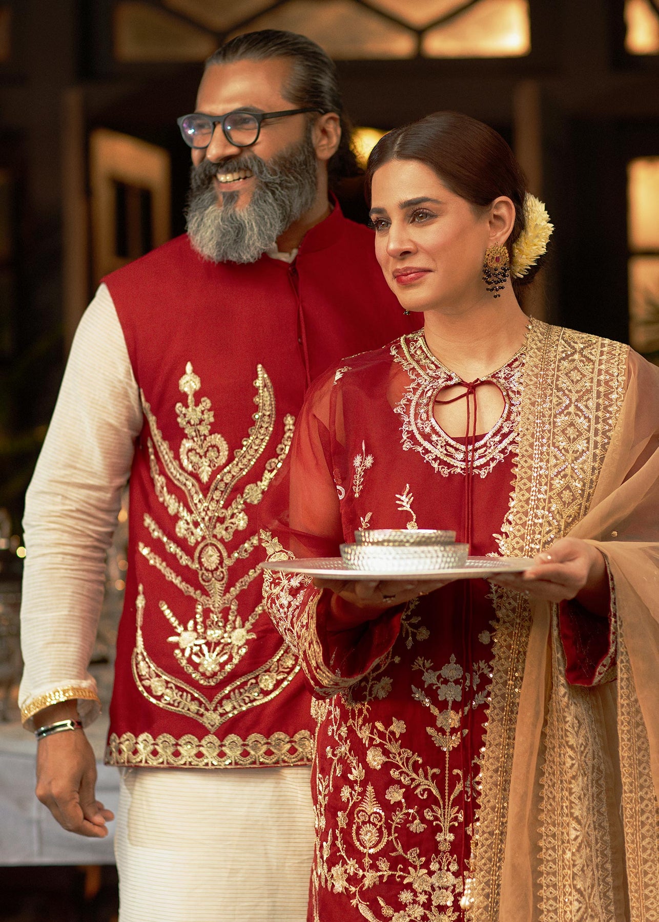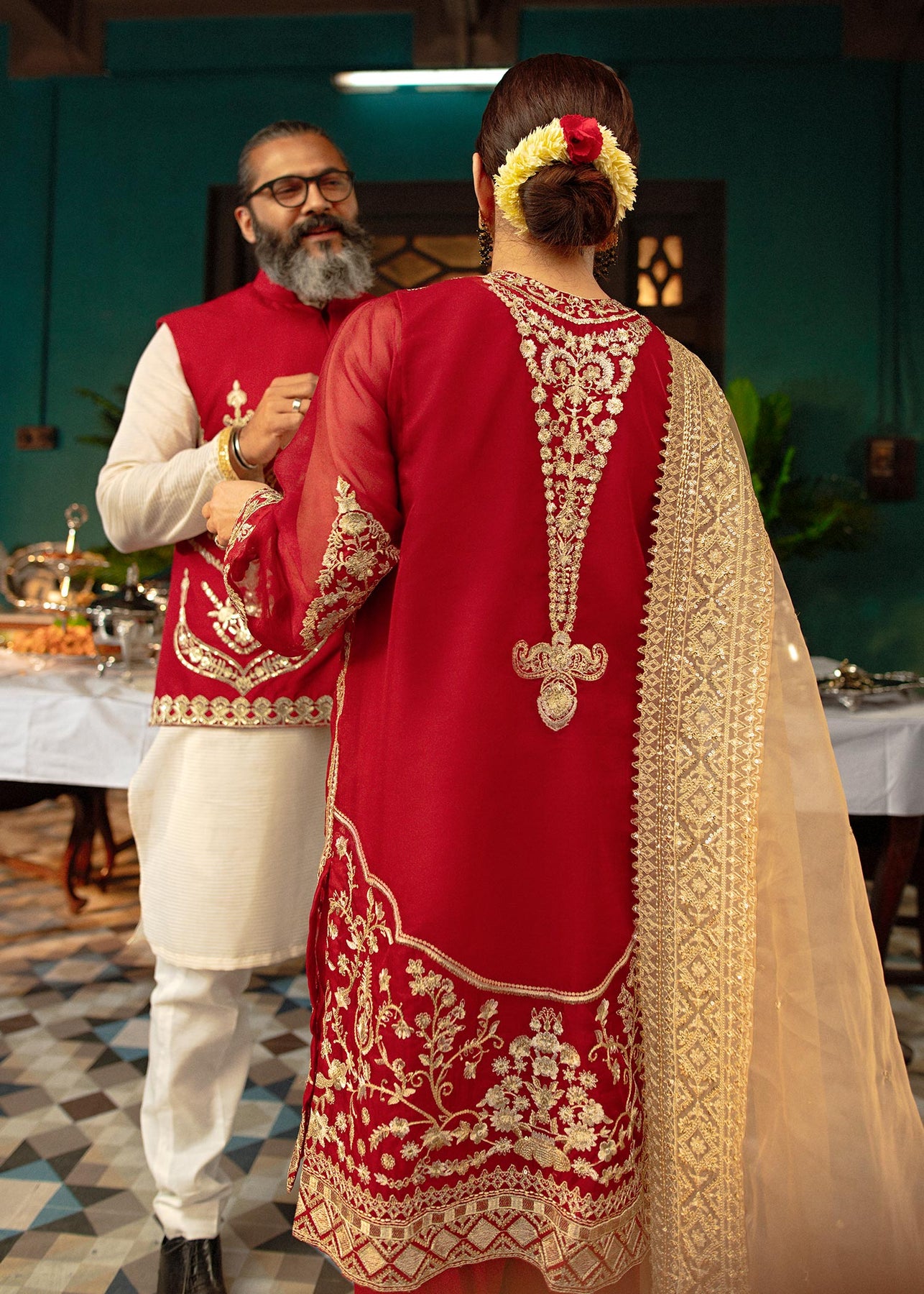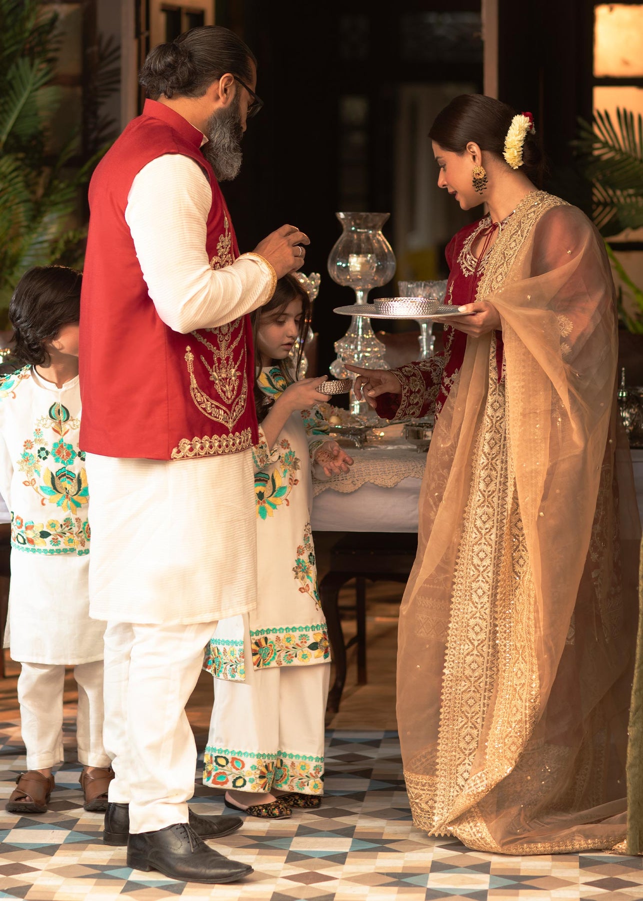 Description: A maroon organza shirt has a stunning key-hole neckline with crystal tassels and is adorned with gold tilla embroidery and sequins. It is paired up with a silk shalwar with golden tilla embroidered borders and a gorgeous champagne organza dupatta.
