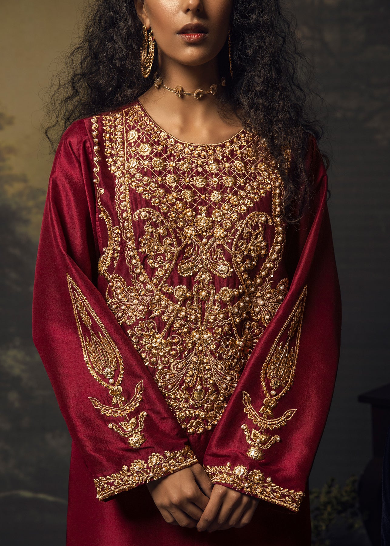 A luscious maroon pure raw silk shirt with lorex embroidery is enhanced with pearls and sequins. It is paired up with a raw silk palazzo and velvet shawl with our signature motifs and a gorgeous hand-rendered border with pitta embroidery.