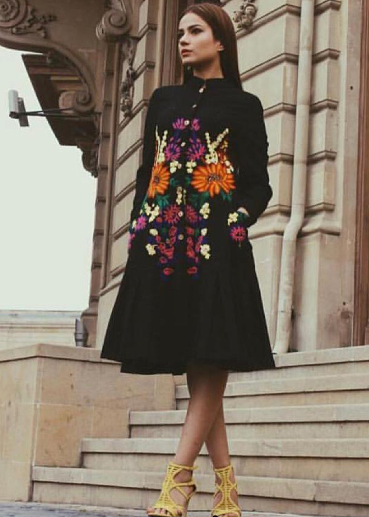 Exquisitely crafted black dress highlighted with multi-coloured embroidery