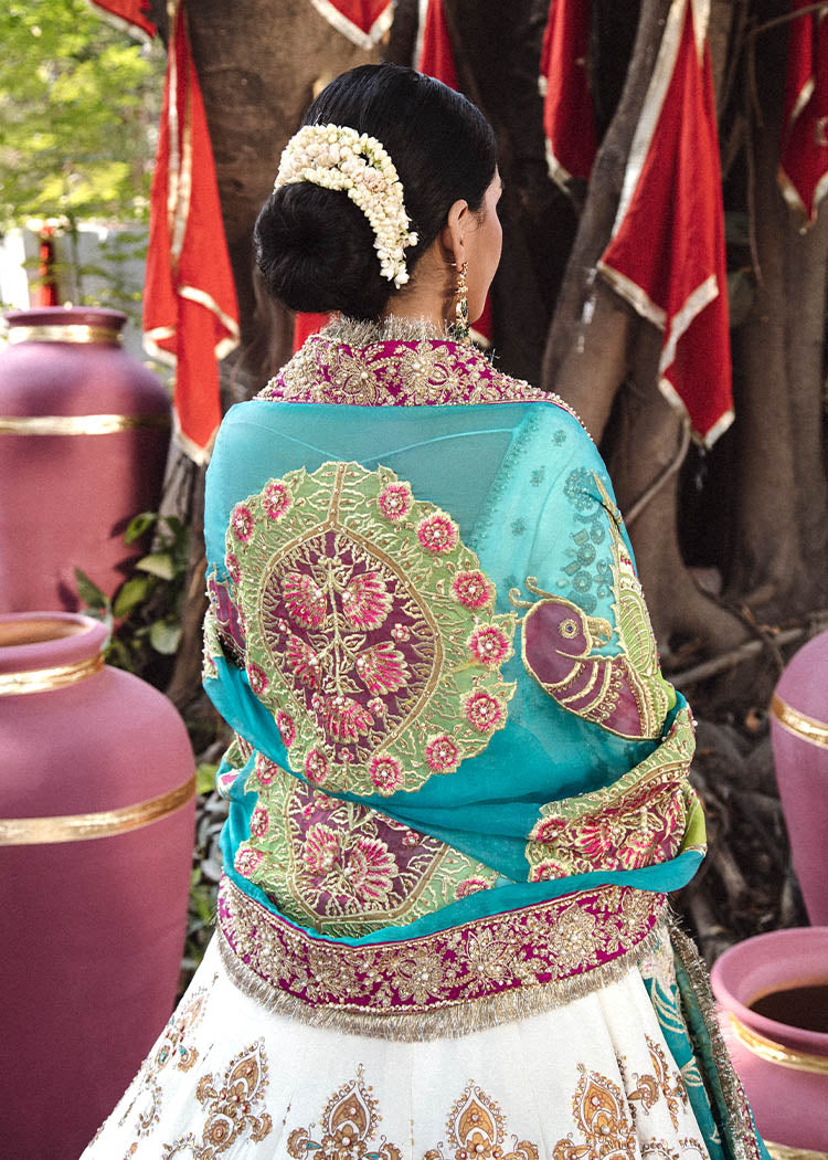 rendered in gold and copper. It has meticulously designed motifs in dabka, naqshi, pearls and sitara. This piece is paired up with a navy blue lehnga with an embroidered border and gold sitara work. The ferozi dupatta is in organza and has a tilla embroidered base, a purple border with sitara, pearls and kiran.