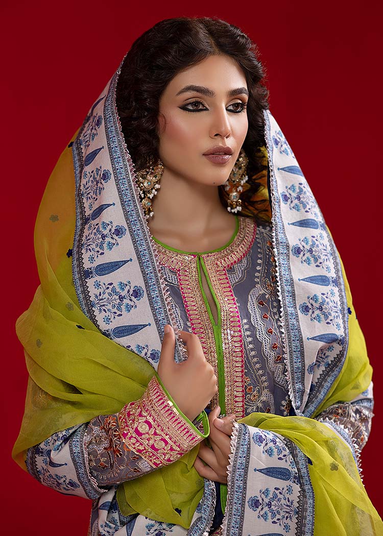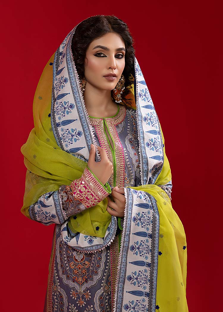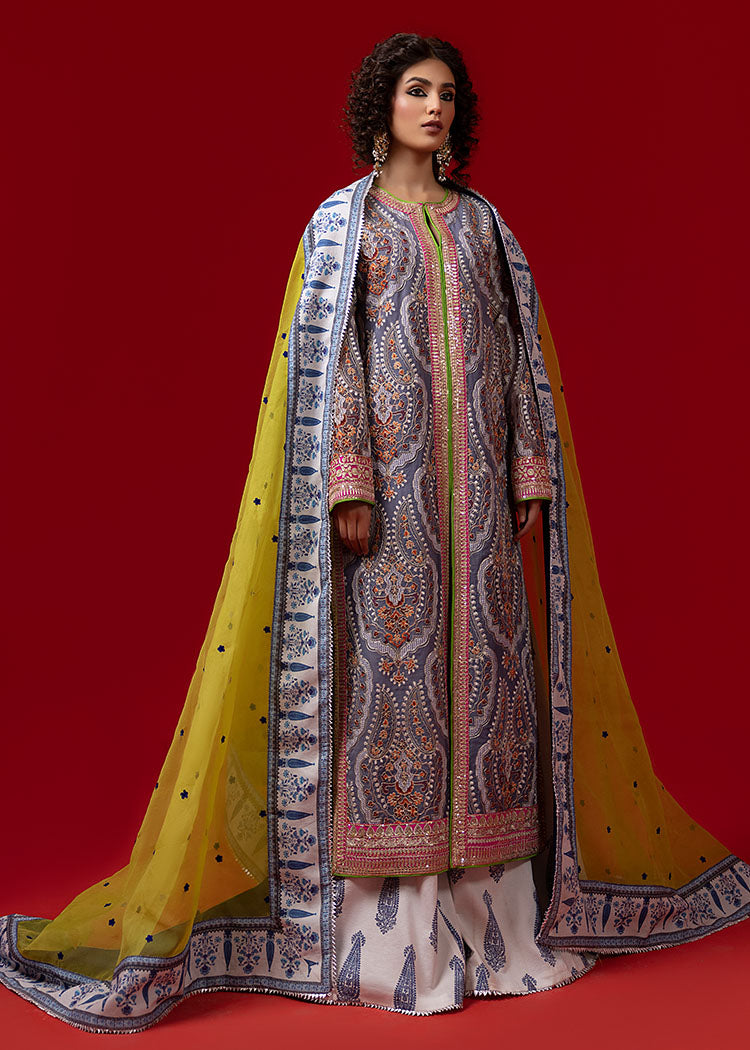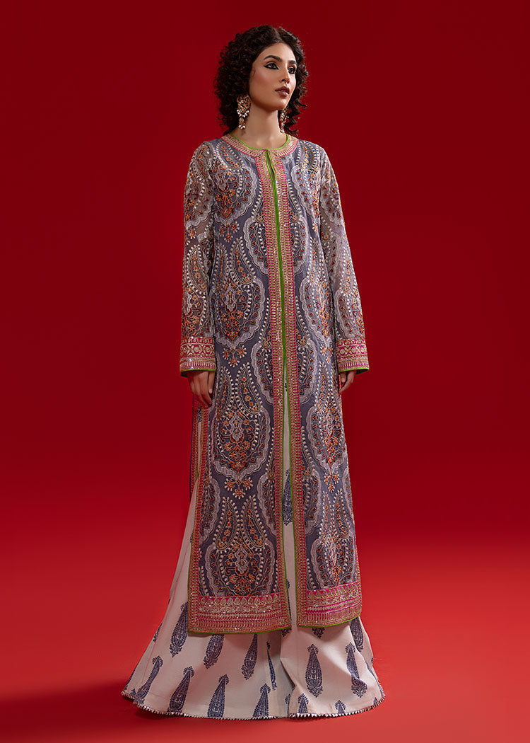A grey, thoughtfully designed open front, long shirt has gorgeous tilla and resham embroidery on it. It is paired up with a hand-rendered sharara with paisley motifs along with a green organza dupatta.