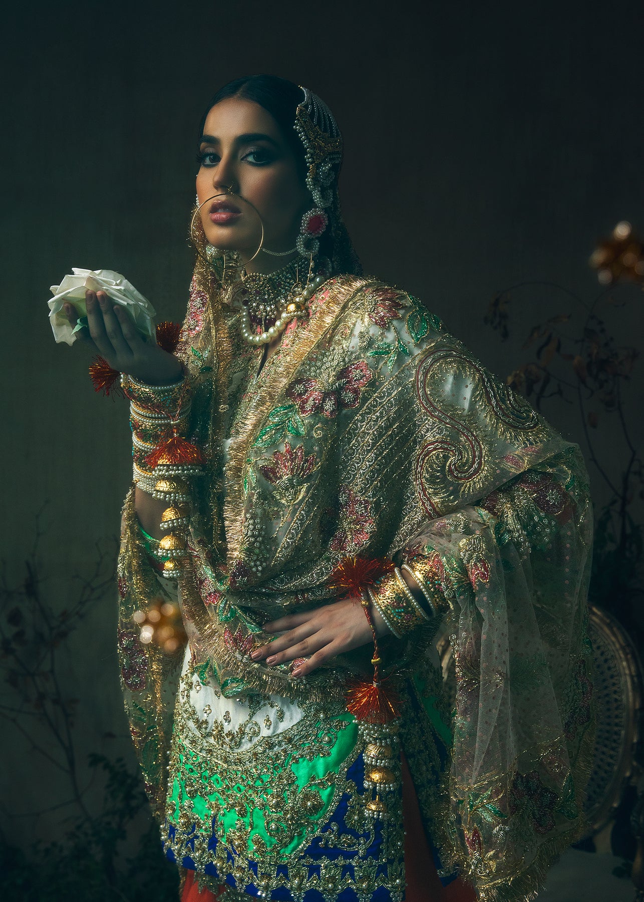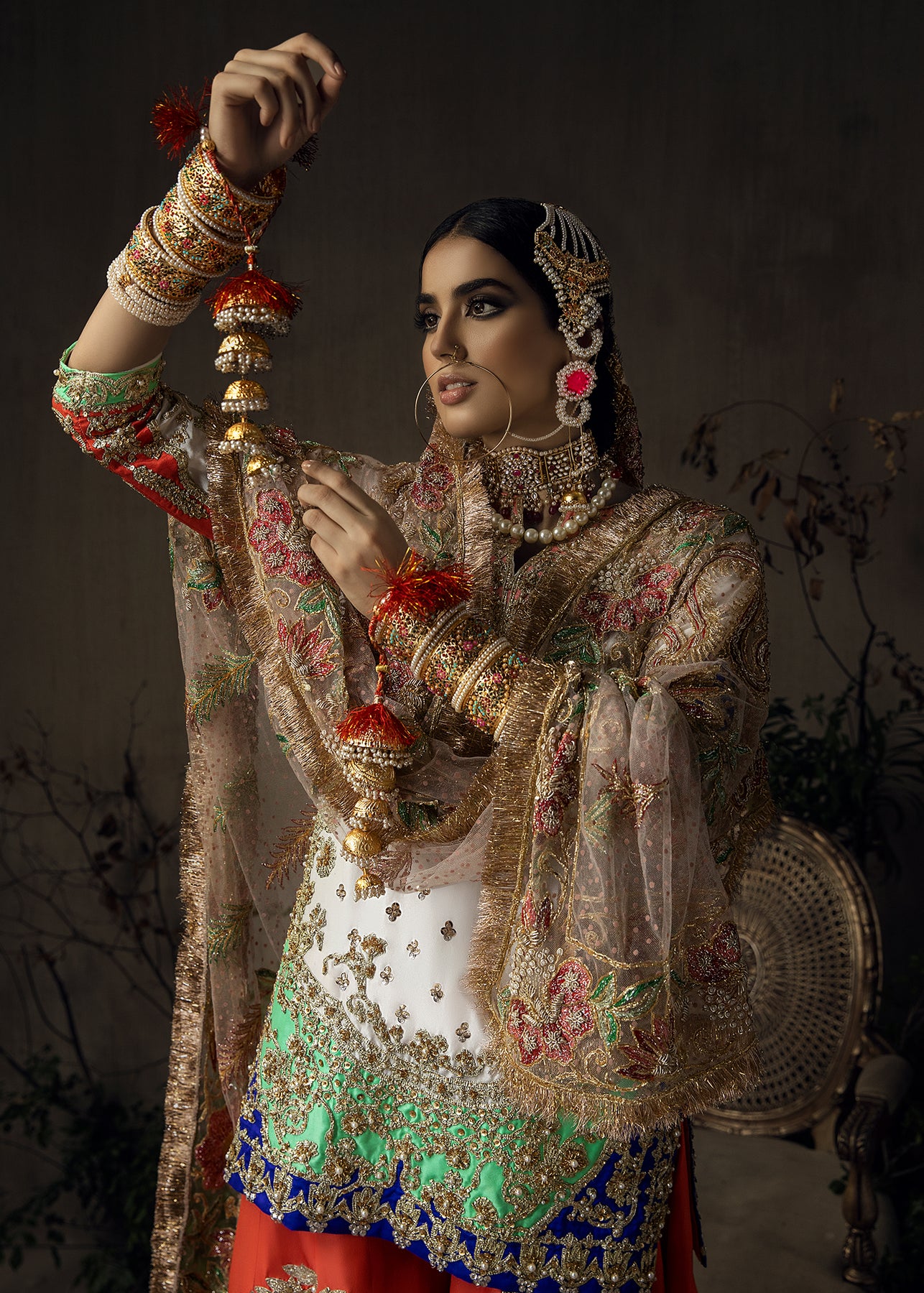 A white raw silk shirt with embellishment paired with a tangerine garara and a heavily embellished vintage dupatta.